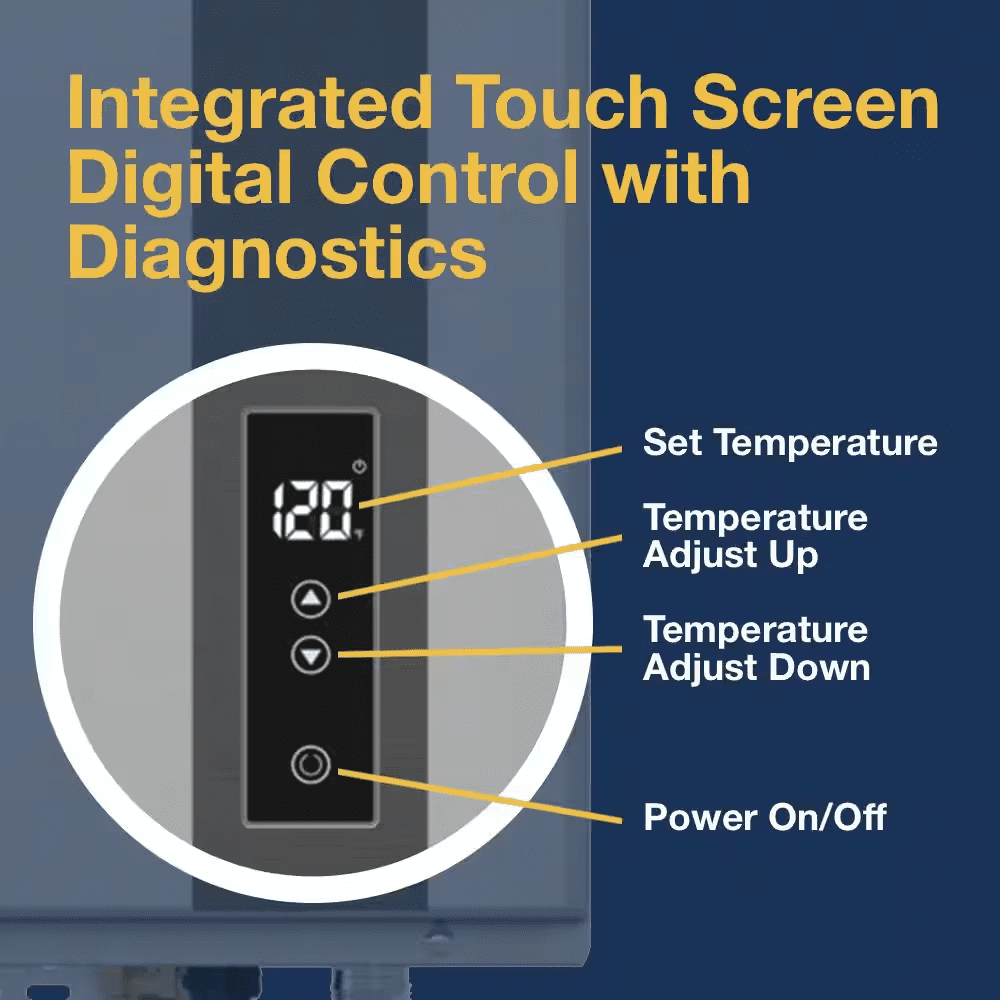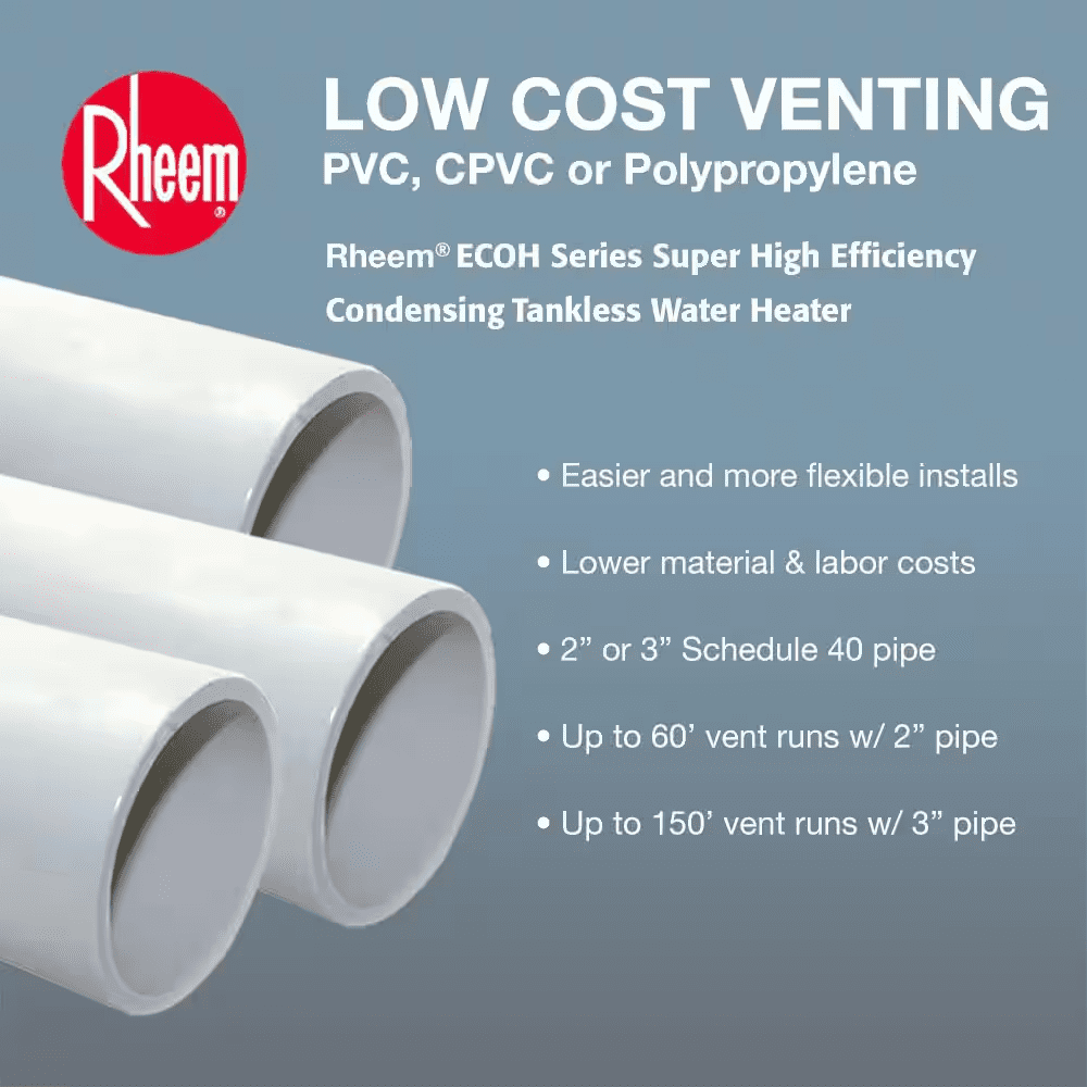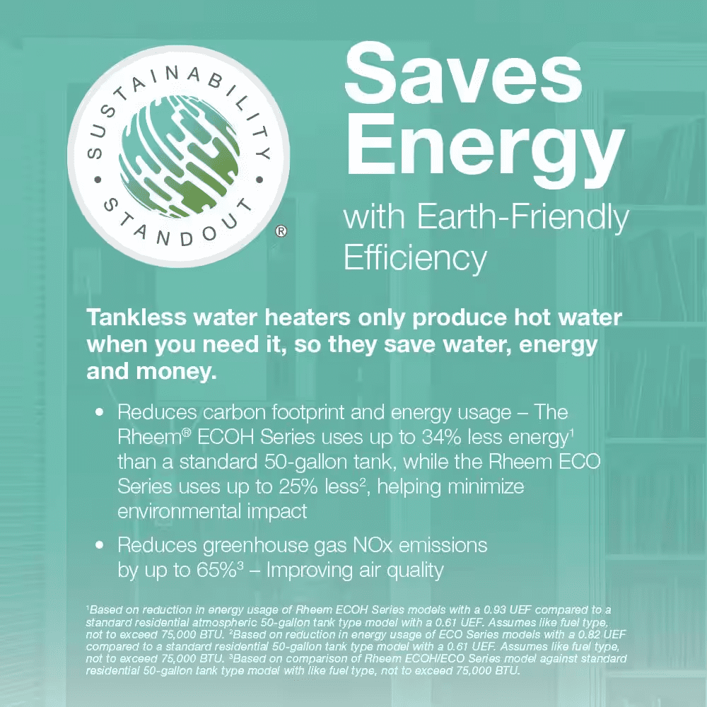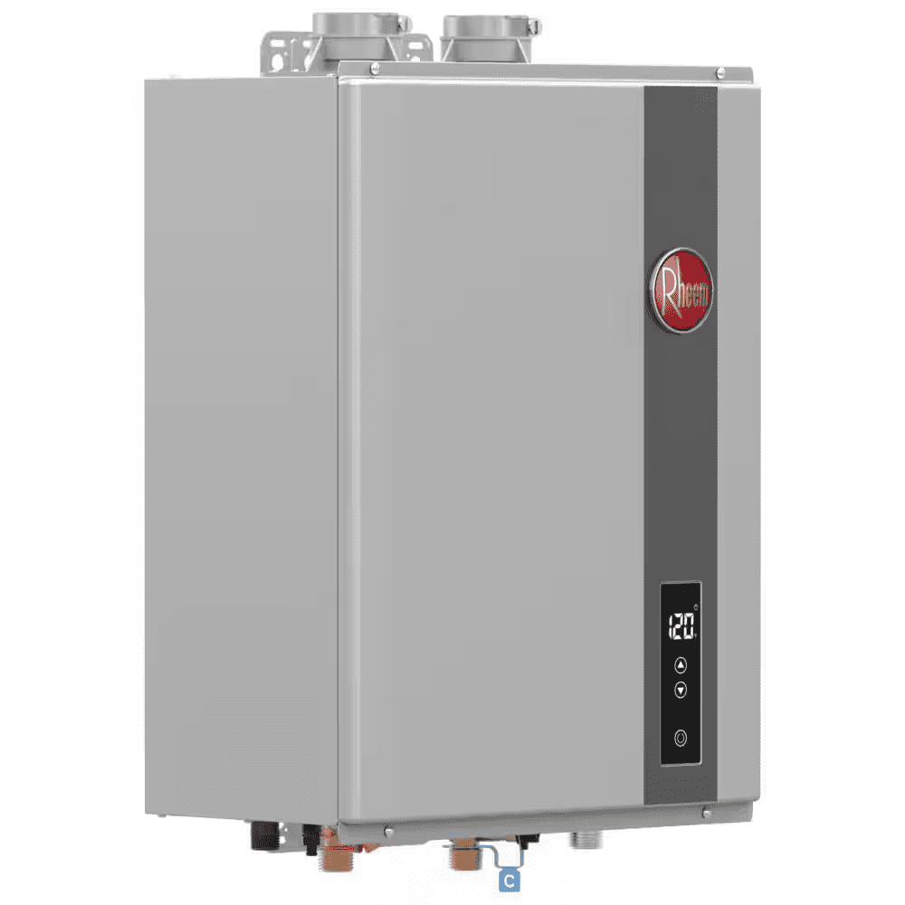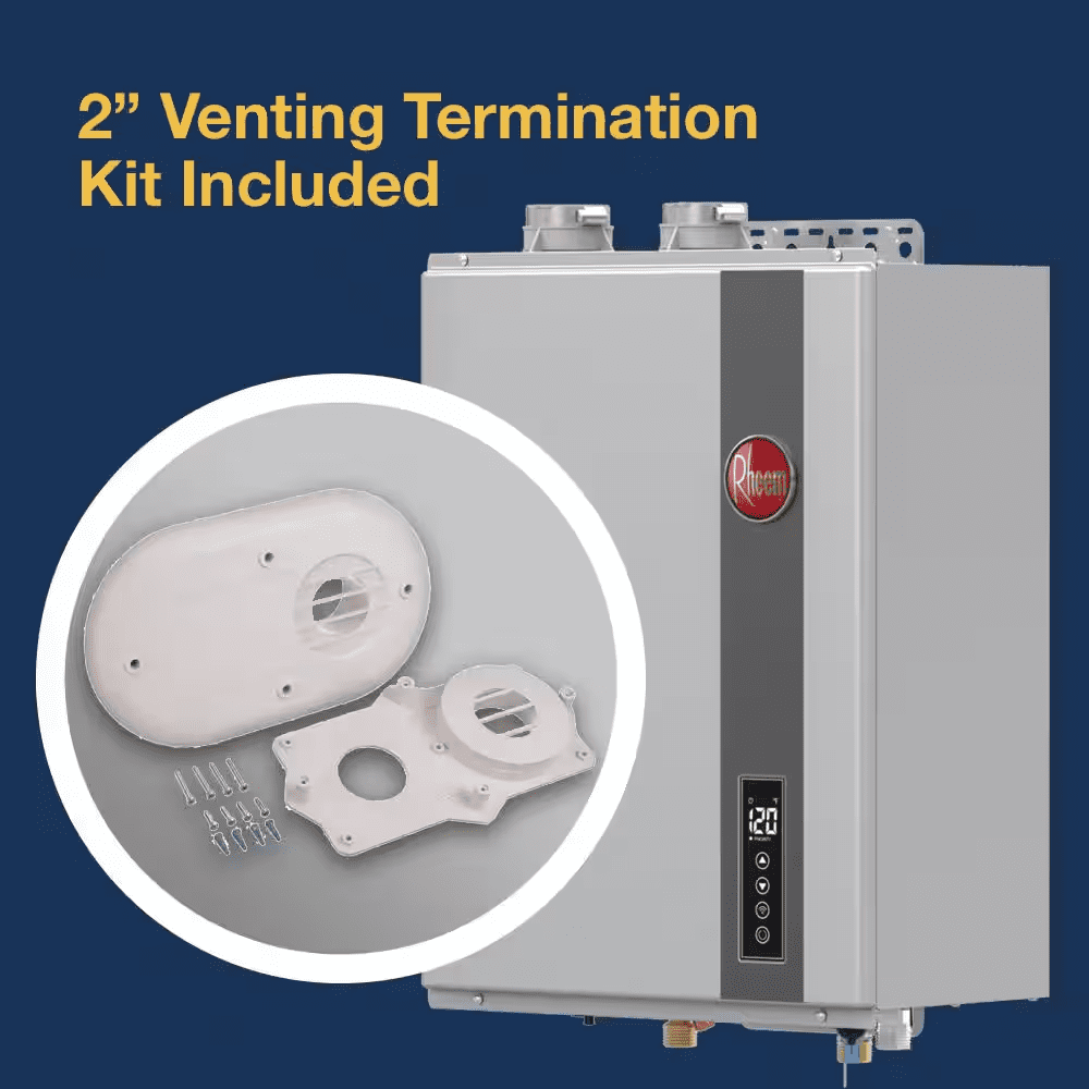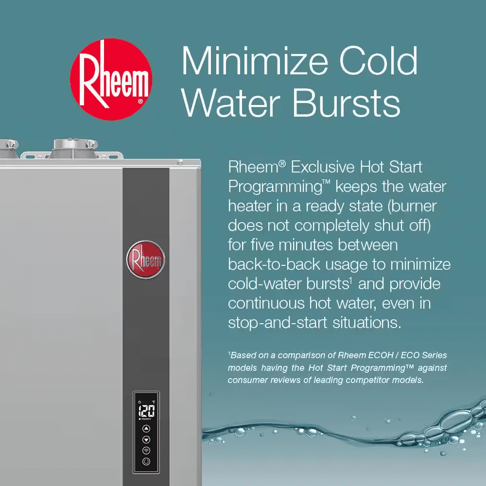 The Rheem 8.4 GPM Performance Platinum Super High Efficiency Indoor Natural Gas Tankless Water Heater delivers more hot water than most tank water heaters. The 160,000 BTU Super High Efficiency Natural Gas Tankless Water Heater can provide enough on demand hot water to supply 1 to 2 bathrooms at the same time (at a 35° water temperature increase). It’s also more efficient than most traditional tanks; it’s up to 52% more efficient than a standard 50 Gal. gas tank water heater. This model has a 0.93 Uniform Energy Factor (UEF), which means it may qualify for local utility rebates and incentives. The Platinum’s venting allows for it to be installed in many locations and it uses PVC for venting enabling an easier installation and reduced installation time; easier installs are just one of the reasons Rheem Tankless Hot Water Heaters are preferred by contractors. This is a natural gas model.