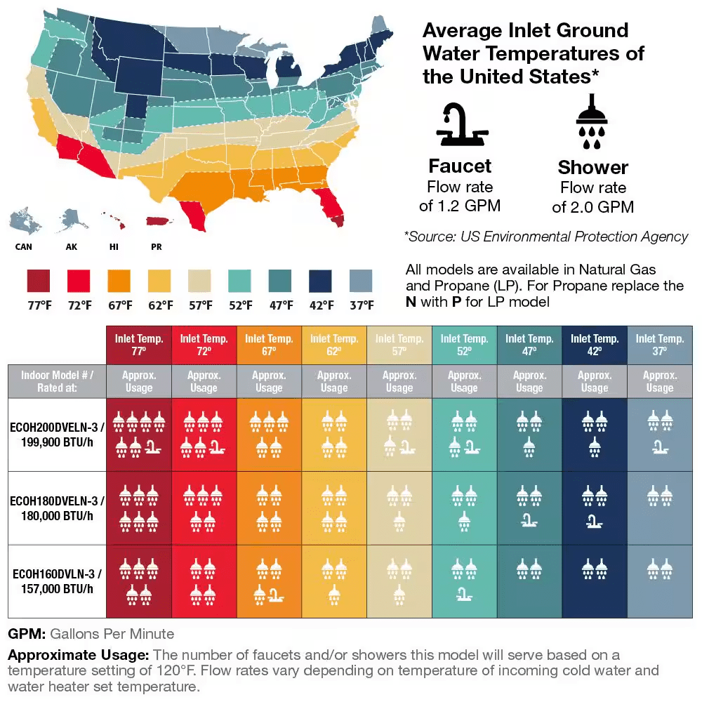 - Continuous hot water; up to 2-showers at once; see sizing guide