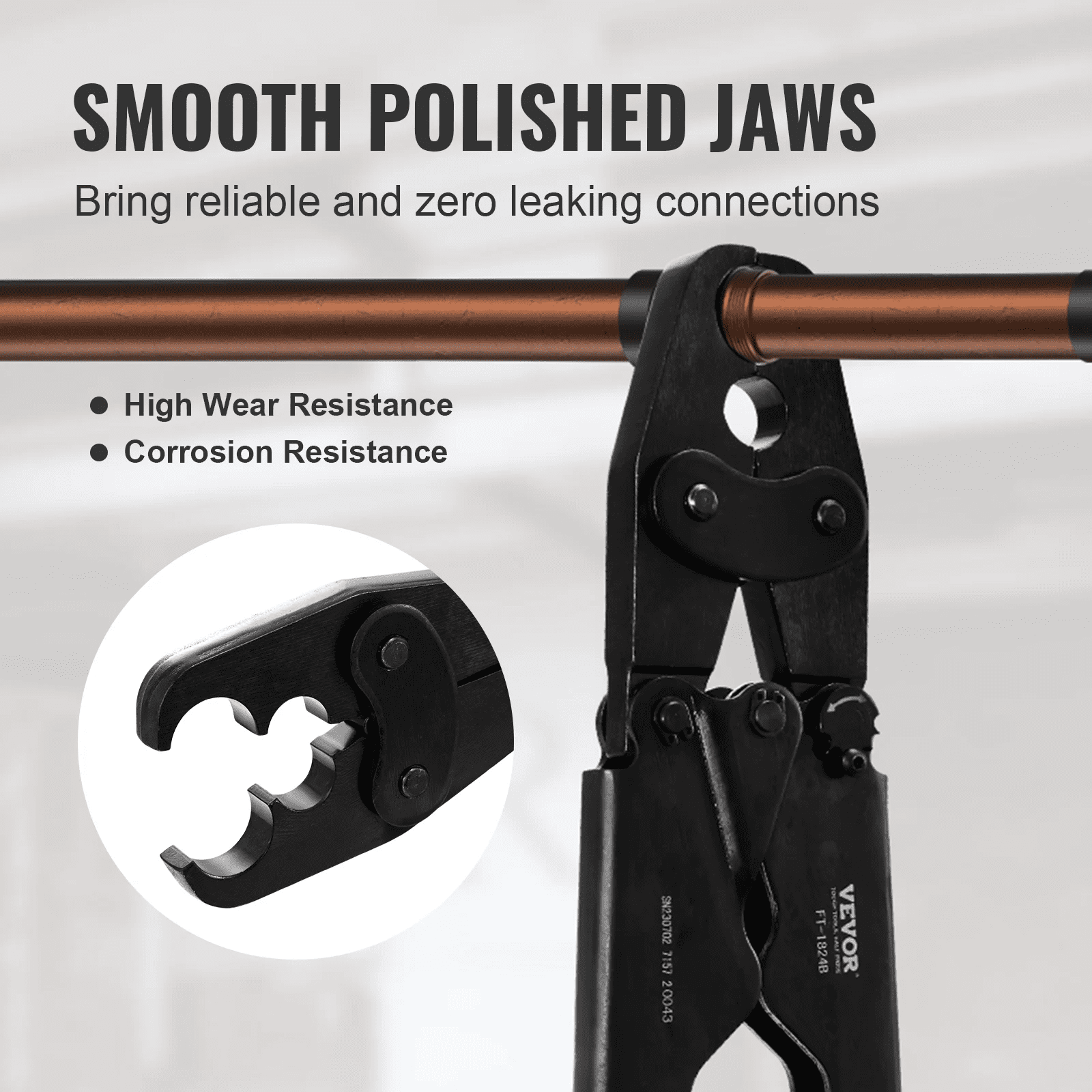 VEVOR 2-head crimping tool exhibits excellent crimping capabilities, allowing for rapid completion of 1/2″, 3/4″ pex crimping and copper ring removal.