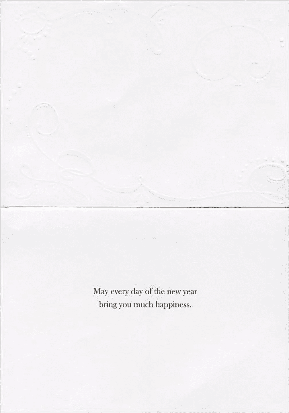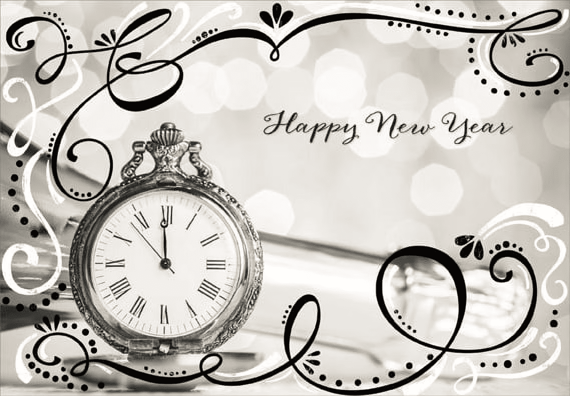 The interior of this Designer Greetings New Year card design reads: May every day of the new year bring you much happiness. The card measures 7.875×5.5 inches and is printed on heavy cardstock. Includes 1 card and 1 envelope. The card has the following special features: glitter, embossed, spot uv coating. This beautiful new year card features a striking black and white image of a pocket watch with the clock hands approaching midnight. Spot UV finishing creates a glossy raised up look and feel to the black swirls and white circles that float in the background while glitter accents sparkle along the white swirls and along the edges of the watch.