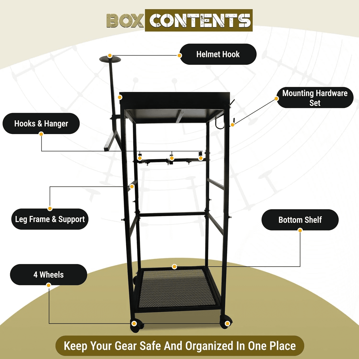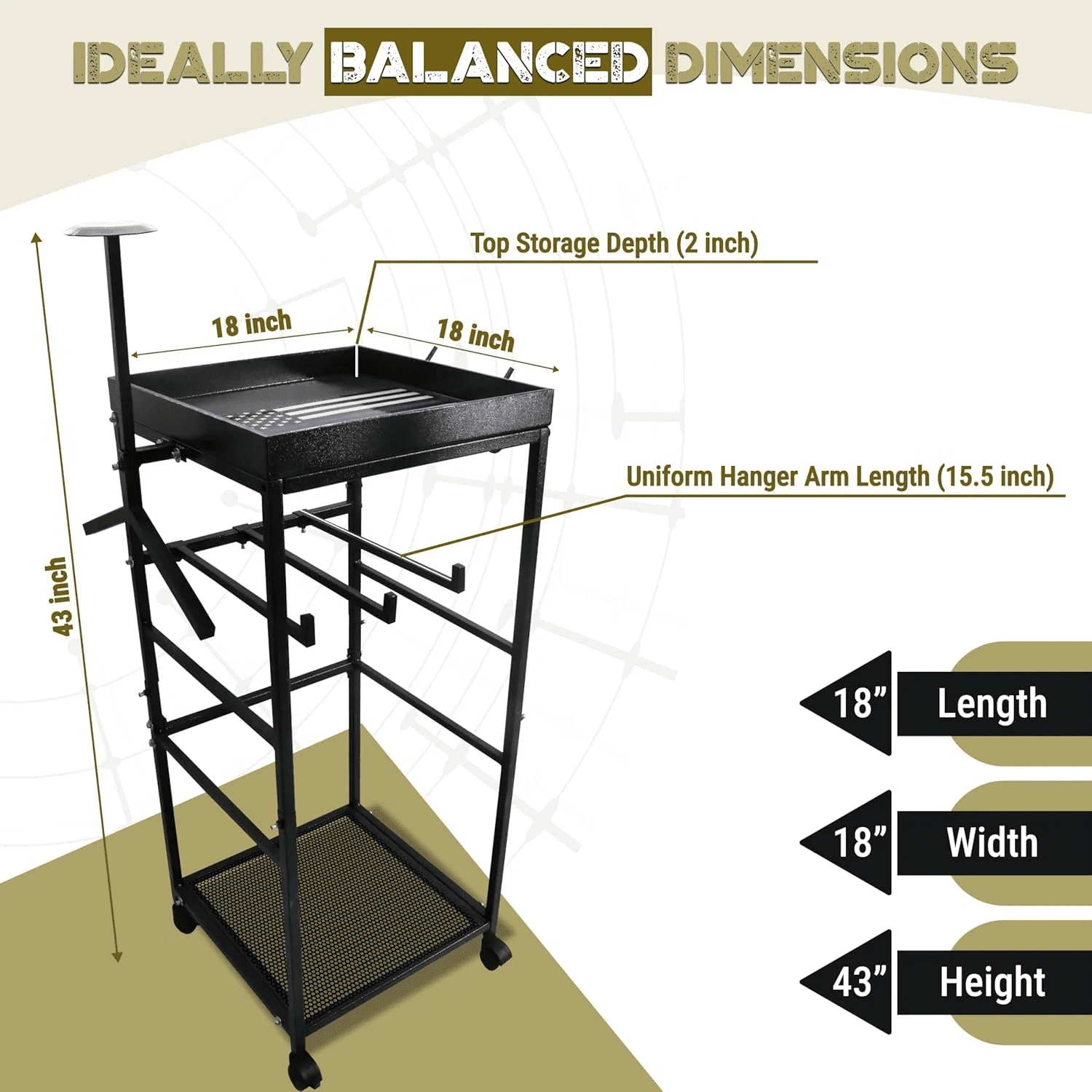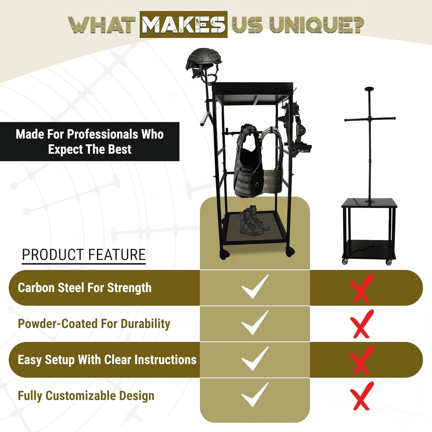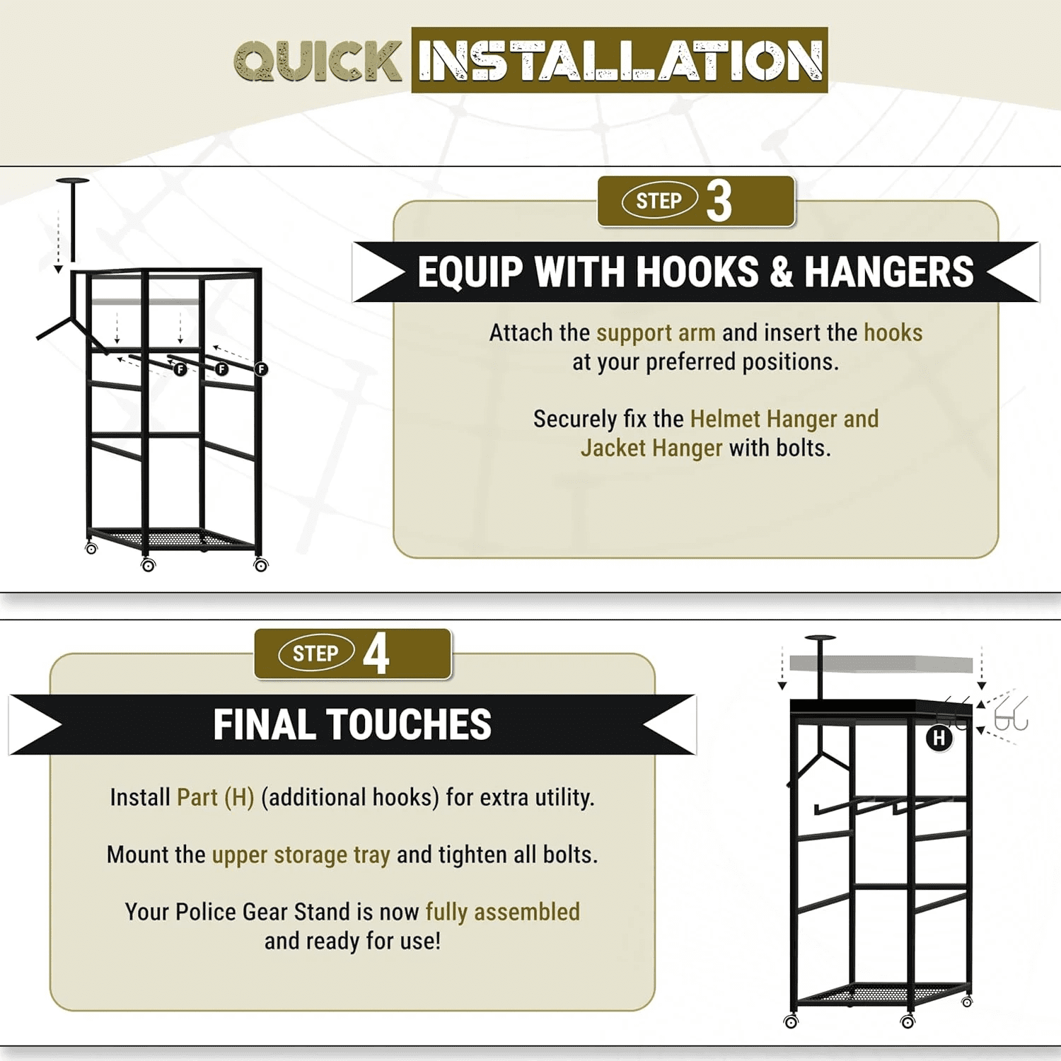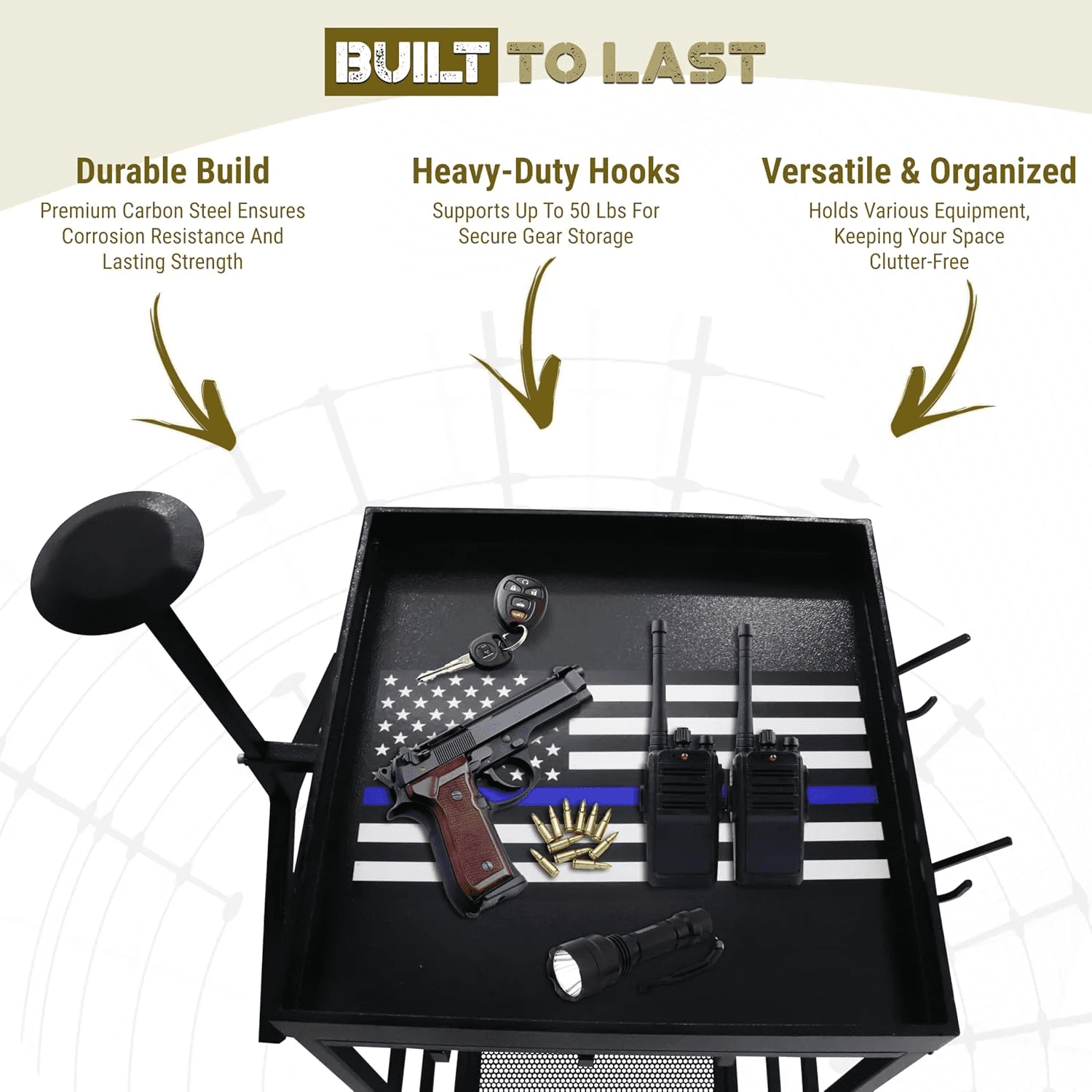 - Compact & Functional Police Gear Storage Organizer : This tactical gear stand for police officers must haves & features multiple hooks and a hanger bar to store police uniforms, helmets, and gear in a compact 18″x18″ footprint.
