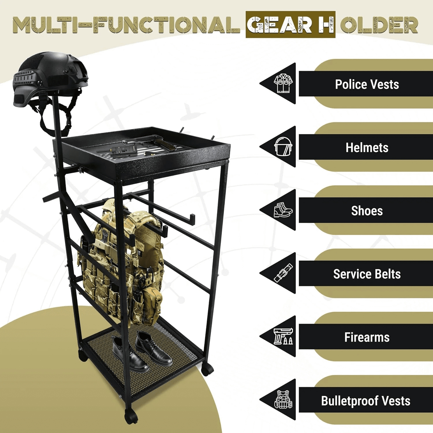 - ‌Heavy-Duty Police Gear Rack Stand : This law enforcement gear rack is made from powder-coated carbon steel. The heavy-duty police stand for gear and uniform holds vests, duty belts, and body armor stand perfect for home or station setup.