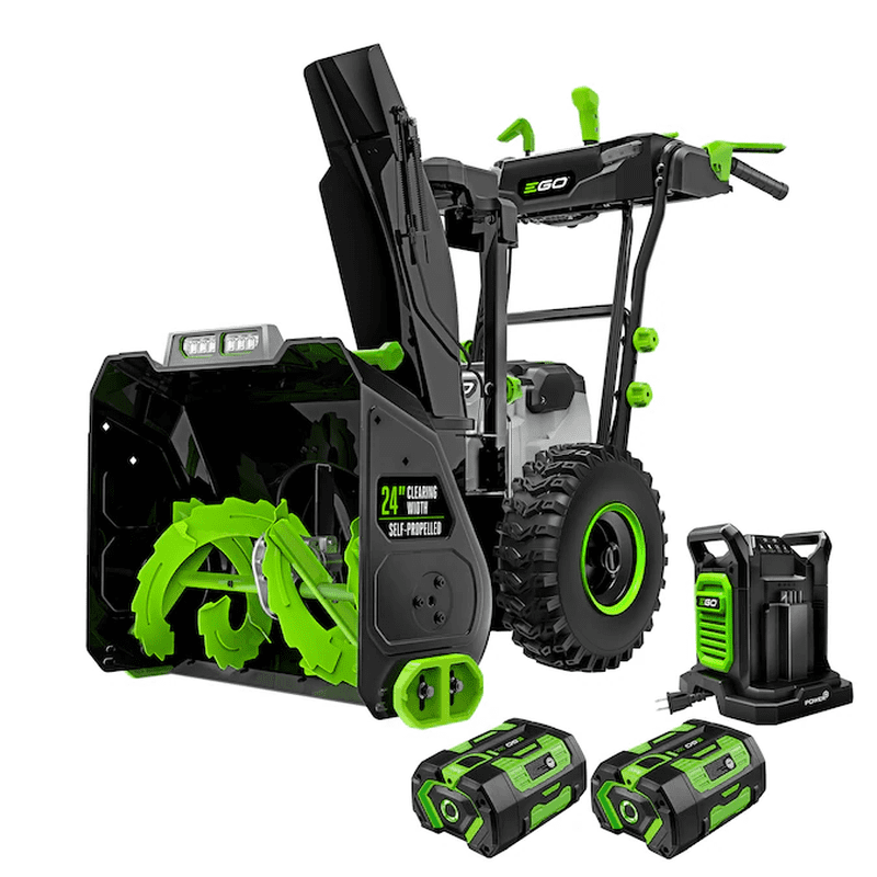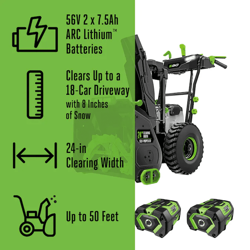 The EGO POWER+ Cordless 2-Stage Snow Blower exceeds the power and performance of gas-powered snow blowers without the noise, fuss, and fumes. Featuring Peak Powerâ„¢ technology, this cordless electric snow blower combines the power of any two EGO 56V ARC Lithiumâ„¢ batteries to tackle the toughest snow conditions and what the snowplow leaves behind with ease and throws it up to 50 feet. Its 24-inch clearing width and 20-inch intake height handles even the deepest snow, and its variable-speed auger and 200-degree chute direction give you complete control to throw snow where you need it. Get the job done easily with variable-speed self-propelled forward and reverse directions along with four LED lights for added visibility in early morning or evening. Clear 8 inches of snow from a 18-car driveway with the two included 7.5Ah batteries. Experience Power Beyond Beliefâ„¢ with the EGO POWER+ 2-Stage Cordless Snow Blower and the entire EGO POWER+ lineup.