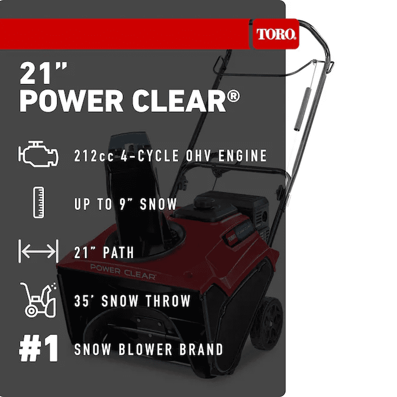 Combining a perfect blend of power and efficiency, the Toro 21-in Power Clear 721 E Single-Stage Gas Snow Blower is second to none for tough jobs. The blower features push-of-a-button electric start, and its powerful 212cc 4-Cycle OHV engine launches snow up to 35-ft away. Shred snow fast with the patented Power Curve system, while the Power Propel self-propel system gets you moving quickly. Garage already filled to the brim? No worries, as the blower’s compact design makes for easy storage. Count on it. ^BASED ON UNIT SHARE AS REPORTED BY OPENBRAND FOR THE U.S. SNOW BLOWER MARKET AS OF JUNE 2025.