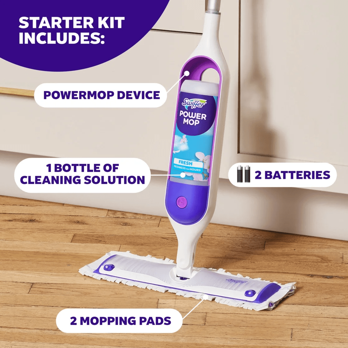 - Floor cleaner kit Includes: PowerMop Spray Mop, 2 Mop Pad Refills, 1 Floor Cleaning solution with Fresh Scent, and 2 batteries