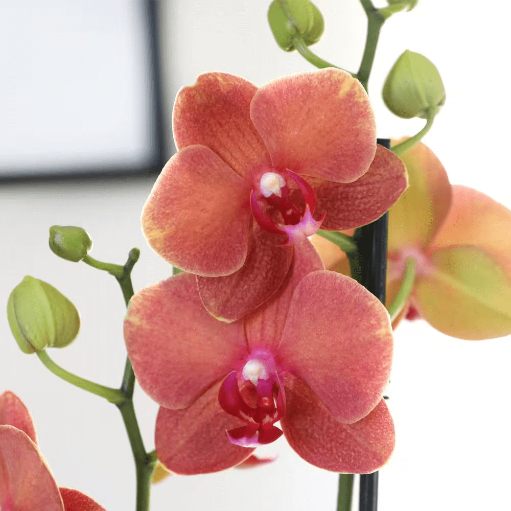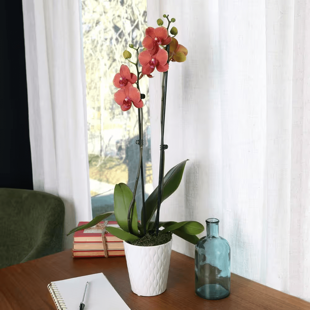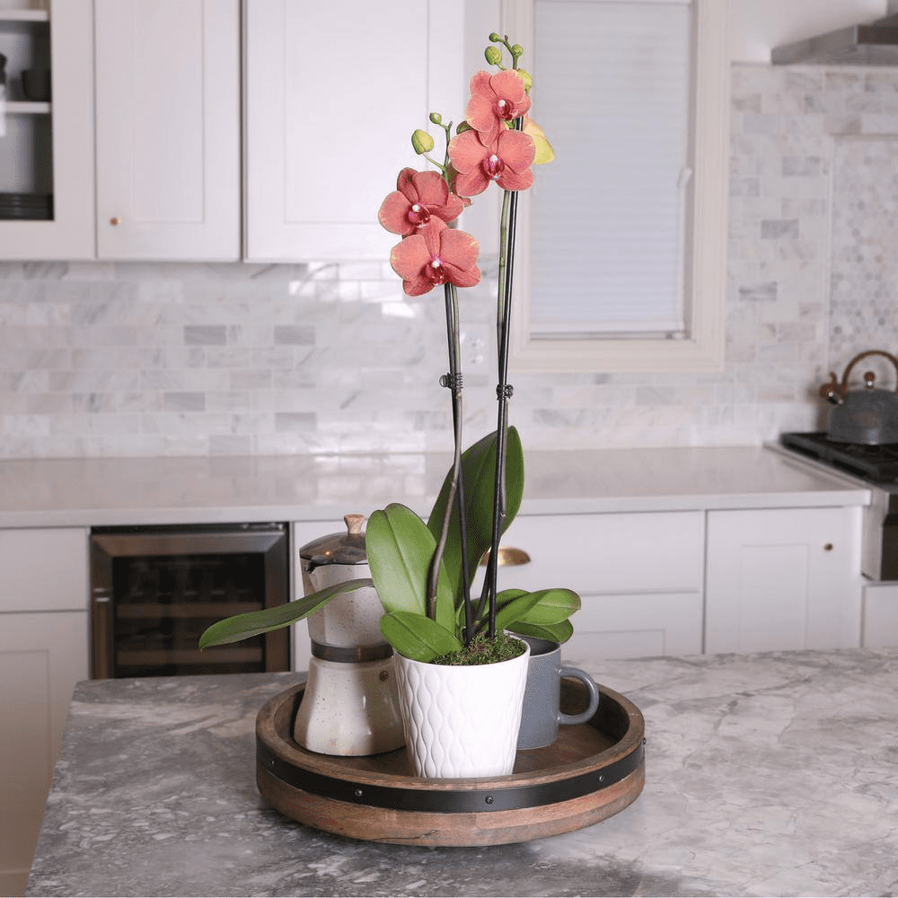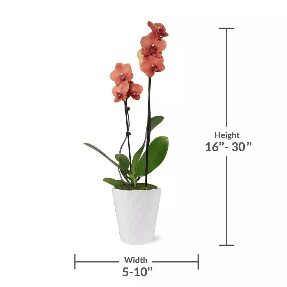 Add beauty to your home with the Just Add Ice 16 in. to 30 in. Salmon Premium Orchid Live Plant in Moss Topped 5 in. White Ceramic Pot. A long-lasting, real orchid plant is a sophisticated and elegant choice for plant decorations. These salmon orchid flowers make a beautiful addition to any space. Keep it in a room with bright, indirect sun. Live orchid plants for delivery are a great choice for birthdays, Valentine’s Day, anniversaries, and all occasions. Orchids are an easy indoor plant. Water your live orchid plants with 1 ice cube weekly. Keep in a room with bright, indirect light. Our advanced packaging technology ensures your live indoor plants arrive beautiful and safely. They ship right from the greenhouse to your home, and go through a transition process to help them adapt to fluorescent lighting, ensuring they can thrive in any room of your home. Care Instructions: Water once a week with 3 ice cubes or 1/4 in. cup of water. Keep in bright, indirect light. Temperatures in the room should remain between 65°F to 85°F, never below 55°F. Avoid placing near drafts.