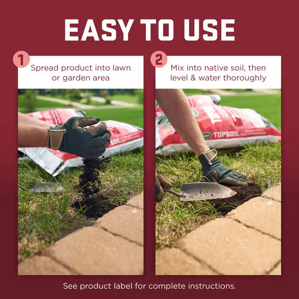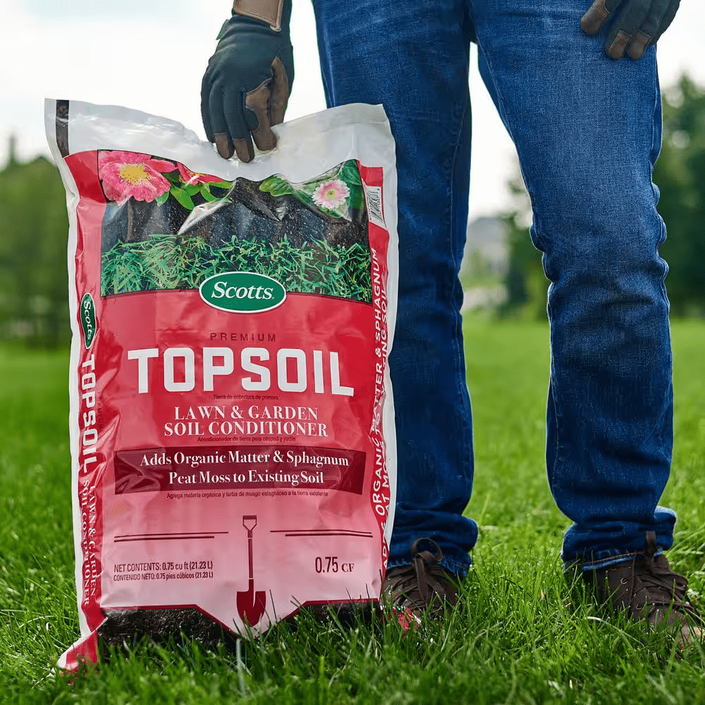 Get your lawn or garden ready for planting with Scotts Premium Topsoil Lawn and Garden Soil Conditioner. This topsoil adds organic matter and sphagnum peat moss to your existing soil to help plants and new grass thrive. Use this product as a lawn soil for planting new grass or as garden soil in new or existing gardens. To condition soil for new lawns, spread 1-2 inches of topsoil into your lawn area and mix into the top 1-2 inches of native soil then level the ground. Water thoroughly after seeding. To condition soil in gardens, spread 2-3 inches of topsoil in new gardens and mix into the top 6-8 inches of native soil then level the ground. In existing gardens, place 1-2 inches of topsoil around plants, spread evenly, and gently mix into the existing soil. Water your new or existing garden thoroughly after application. This product is for in-ground use only. One 0.75 cu. ft. bag of Scotts Premium Topsoil Lawn and Garden Soil Conditioner covers 4 sq. ft. when applied at a 2-inch depth.
