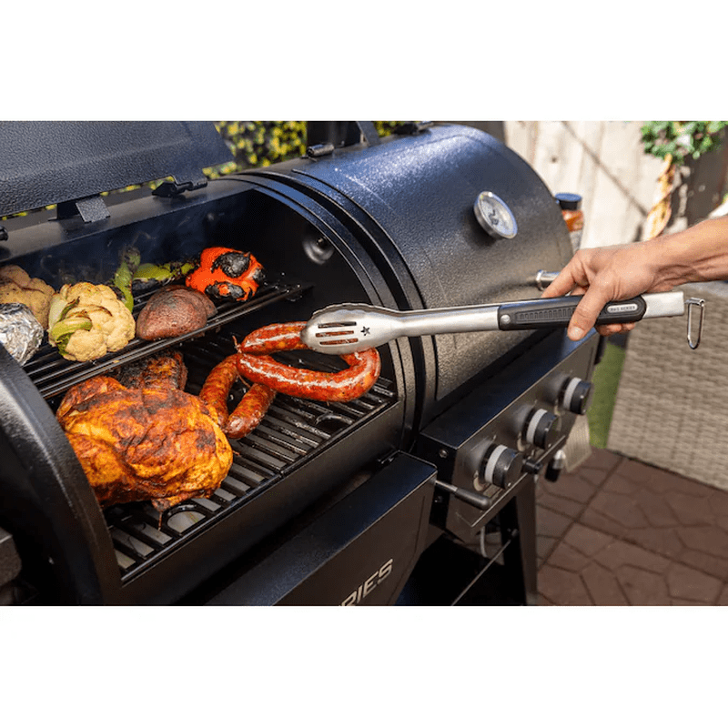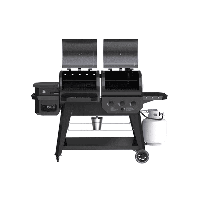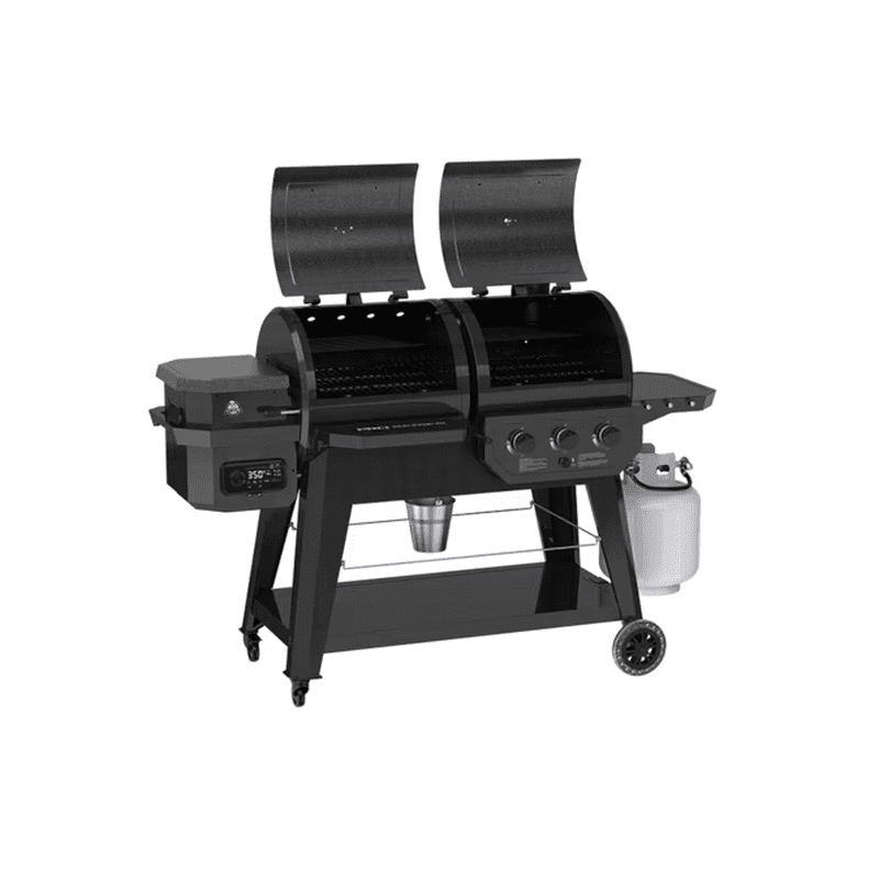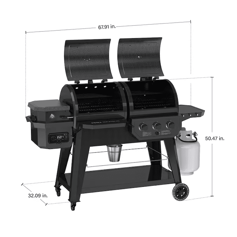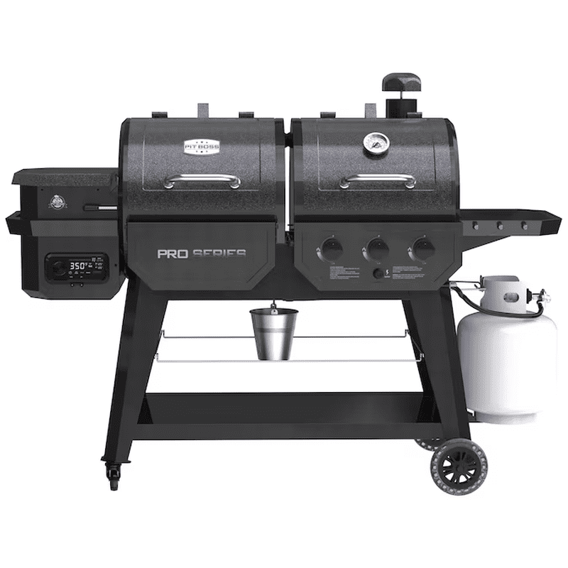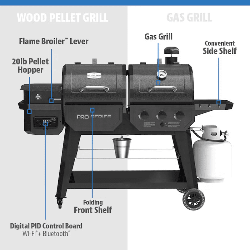 The Pit Boss Pro Series Wood Pellet and Gas Combo Grill combines the best grilling fuels with the smartest technology to bring you a powerful outdoor cooking experience. Equipped with advanced wireless and Bluetooth® technology, you can use the Pit Boss Grills application to control temperature settings, monitor your grill’s meat probes, and much more from the convenience of your phone. Featuring more than 1,262 square inches of cooking surface, the Pro Series 1100 is ready to cook your favorite meals everyday. Its 8-in-1 versatility allows you to smoke, bake, roast, braise, sear, grill, char-grill, or barbeque using 100% all-natural hardwood pellets or liquid propane, allowing you to achieve the rich and smoky aroma of a real wood grill or make your favorite dishes using the convenience of gas. Additional features of the Pit Boss Pro Series 1100 Combination Grill include a 180-500°F temperature range, 20-pound hopper, a premium-gauge stainless steel build, porcelain-coated cast iron cooking grates, one included stainless-steel meat probe, adjustable smokestack, four independent gas burners, locking caster wheels, grease management system, and a front folding shelf.