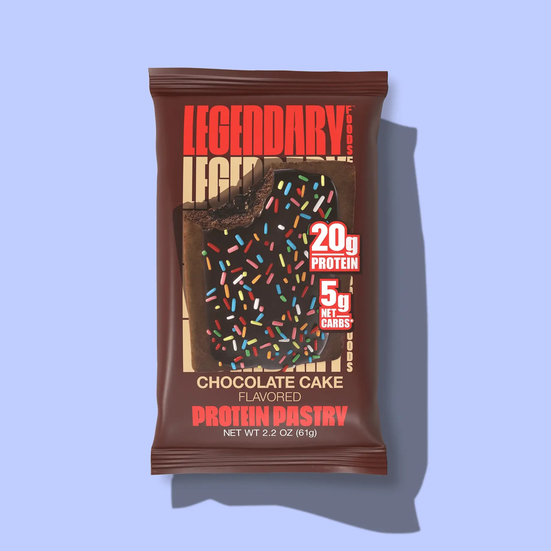 - Each box contains 4 individually wrapped Legendary Foods Chocolate Cake Protein Pastries
