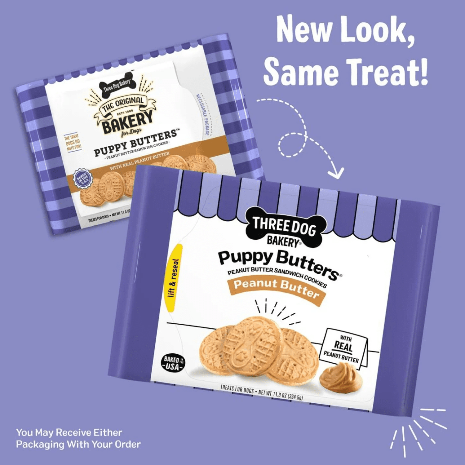 At Three Dog Bakery, we craft people-inspired treats but just for dogs, because we believe that dogs are people, too, and that your dog deserves a treat worthy of the word “treat.” For us humans, a fun peanut butter sandwich cookie will always be a beloved treat, whether you’re snacking after school or munching at the movies. But why should your dog be left out of one of their favorite flavors while you enjoy? To stop tableside begging guilt, we were inspired to craft a tasty version made just for your four-legged family member. Puppy Butters are two peanut butter cookies with a smooth peanut butter filling inside that makes for an irresistable combination of textures. The drool-worthy aroma will keep your pup coming back for more. Crafted with love and real ingredients, Puppy Butters are sure to be a fast favorite for the dogs you love in your life.