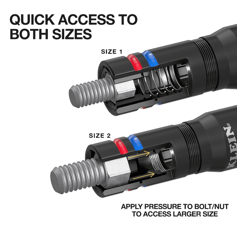The Quad-8 deep well heavy-duty impact flip socket set contains 8 SAE hex sizes combined into 2 convenient color coded sockets. Small 1/4″ – 7/16″ and medium 1/2″ – 11/16″. These impact sockets have a spring-loaded action which allows for hands-free access to the hex size by simply applying pressure to the smaller socket to compress it out of the way. The quad socket adapts to and stores on any Klein Tools proprietary 1/4″ hex flip socket impact shaft.