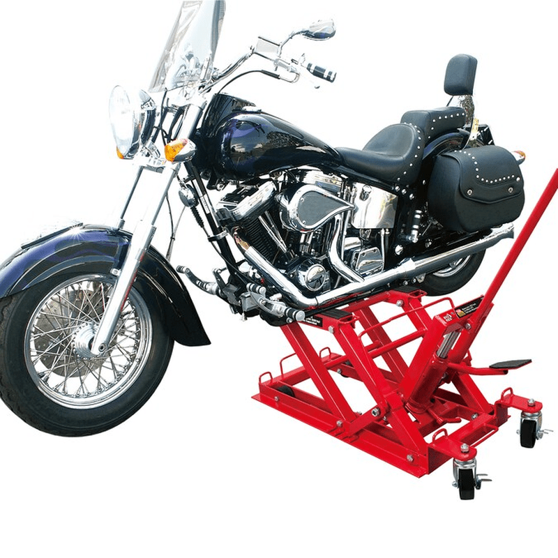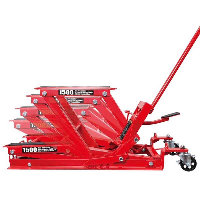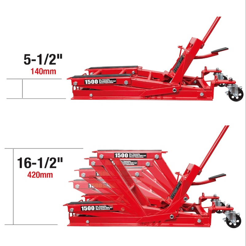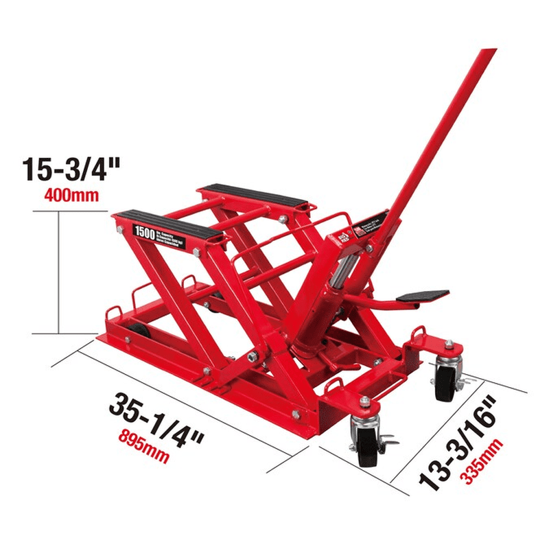 The big red motorcycle jack is the ideal solution to your motorcycle, snowmobile, ATV, and UTE lifting needs. It features a lifting range of 5-1/2″ to 16-1/2″ with a 3/4 ton (1,500 lb) load capacity. This wide-load bearing jack is intended for the power sports enthusiast for maintenance or even lifting for off-season storage. It is equipped with 4 locking positions and includes 2 locking swivel casters, a bottle jack, and a pulling bar. The fully welded bottle jack prevents leakage and extends life cycle.