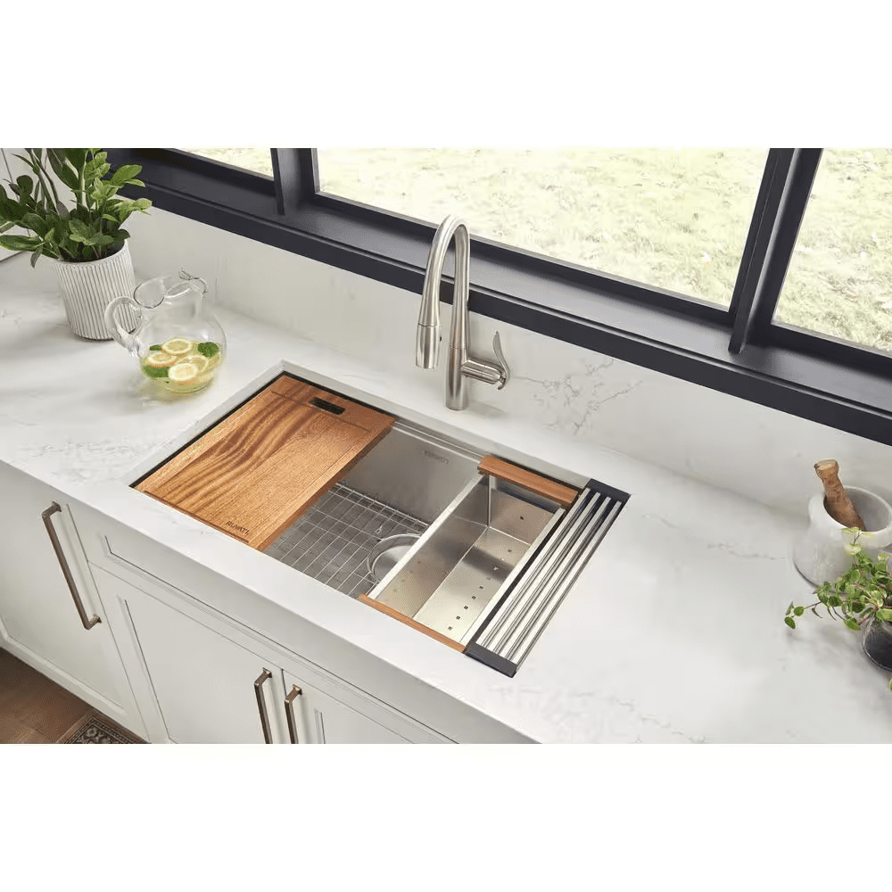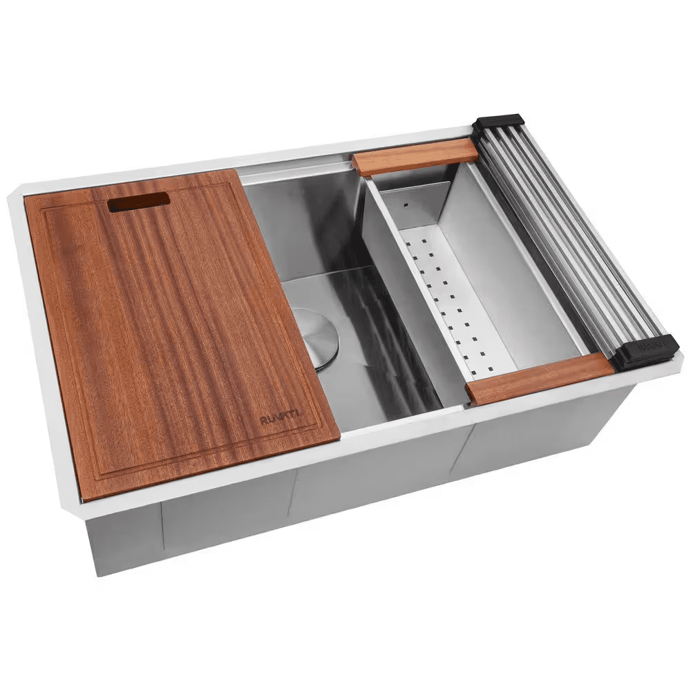 Convert your kitchen sink into a fully functional workstation with the Roma collection from Ruvati. Featuring an undermount installation and sharp inside corners, modernity is apparent. The workstation design features a built-in ledge that provides a platform for Ruvati’s unique accessories. Each sink in the Roma collection features a solid hardwood cutting board and decorative drain cover. Some also include a stainless steel colander or Ruvati’s patented foldable drying rack. With the Roma collection, you can do all your prep work on top of your sink and keep your countertops free of mess.