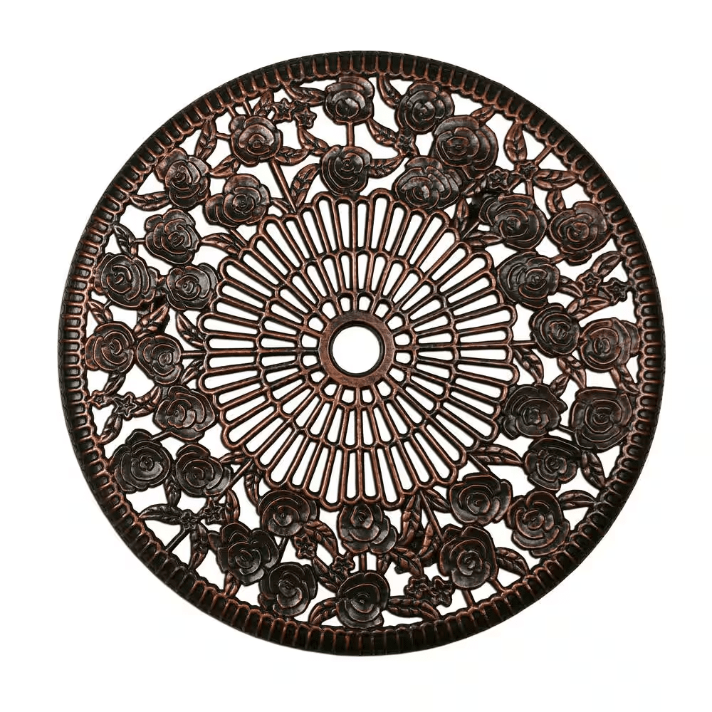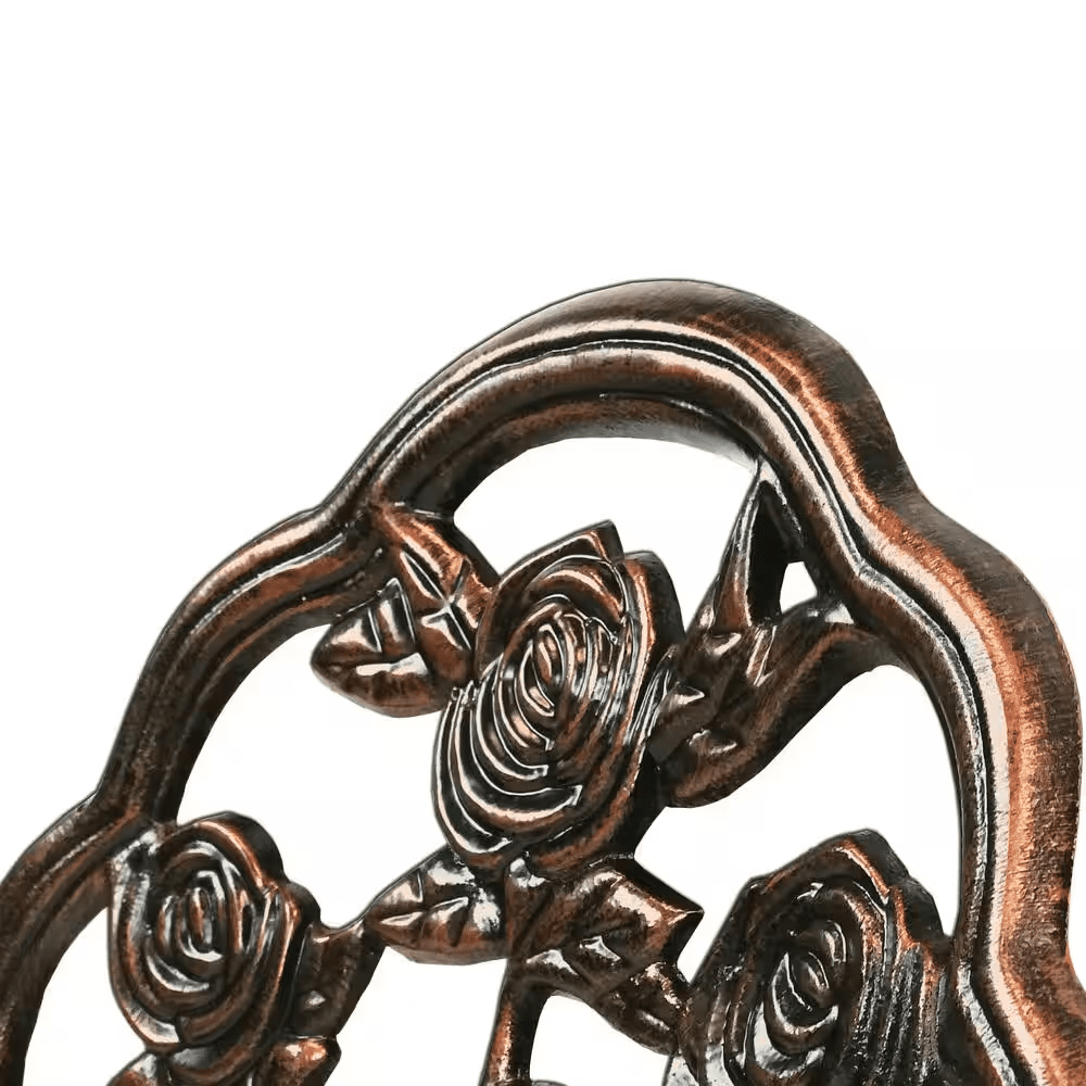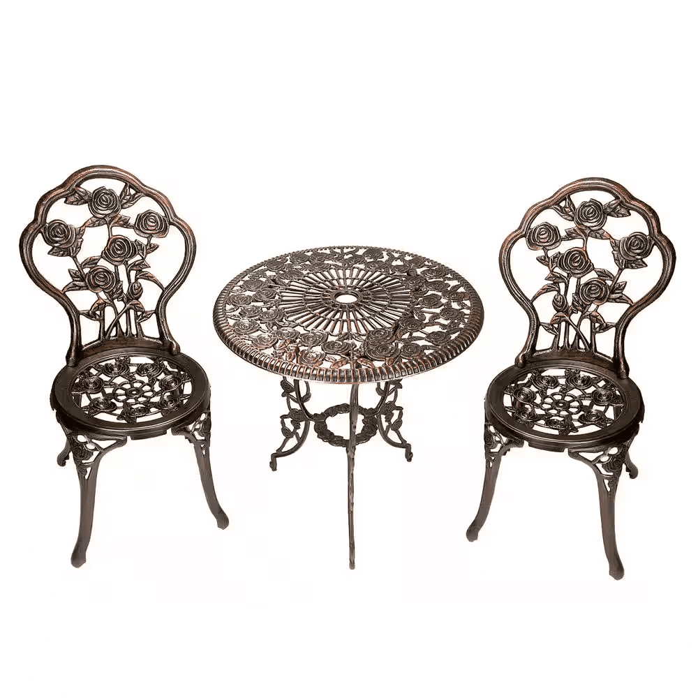 The Oakland Rose collection is perfect for flower lovers. Each piece is adorned with several roses in full bloom. The attractive flowers will add beauty and style to any home or outdoor patio garden setting. Each piece is hand casted and finished for the highest quality possible. This Rose Cast Metal 3 Pc. Bistro Set will be a beautiful addition to your front porch, patio, deck, balcony, garden or other entertainment area. Bistro sets are perfect for any small space or to accent a larger space. It is constructed of rust-free cast aluminum and durable cast iron. This Bistro Set features a hardened powder coat finish for years of beauty. The set includes a bistro table with umbrella opening and 2 bistro chairs.