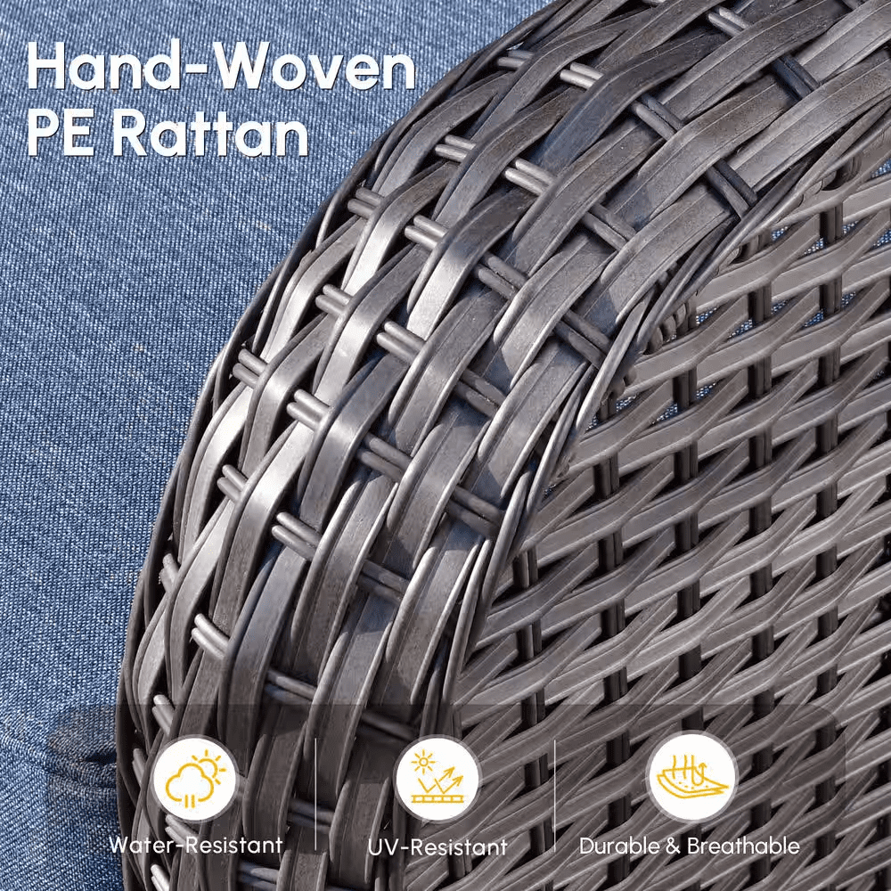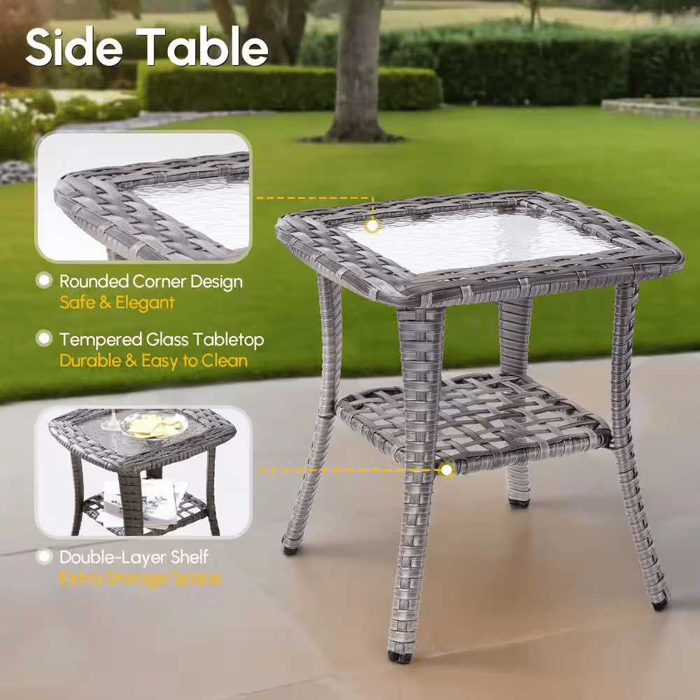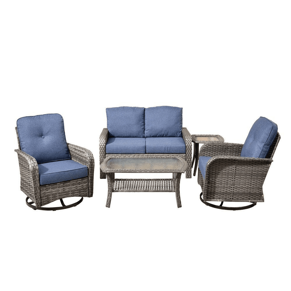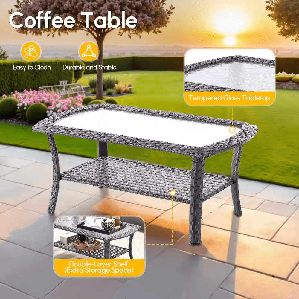 Elevate your outdoor living with the Ruby Grey 5-Piece Wicker Patio Conversation Set-the perfect gathering spot for family and friends in your patio or deck. This chic and compact set includes a loveseat, two swivel rocking chairs, a coffee table and a side table, ideal for smaller patios or balconies. Built to last, the set features a sturdy, powder-coated iron frame wrapped in handwoven PE rattan that resists fading, UV exposure, and water. The high-density foam seat cushions and supportive back cushions offer outstanding comfort, while the fade-, UV-, and water-resistant cushion covers include zippers for easy removal and cleaning. Plus, the stylish coffee table and the side table bring you convenient places for resting drinks, snacks, or decor, and tempered glass tabletop is easy to clean and built to withstand sudden temperature shifts. With all hardware and easy-to-follow instructions included, assembly is simple. Don’t miss out! Create a cozy and stylish outdoor retreat with the Ruby 5-Piece Patio Set today!