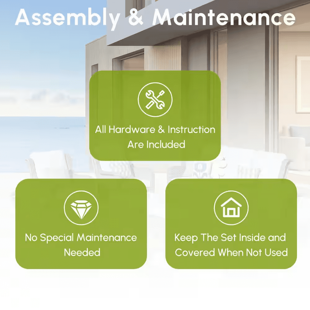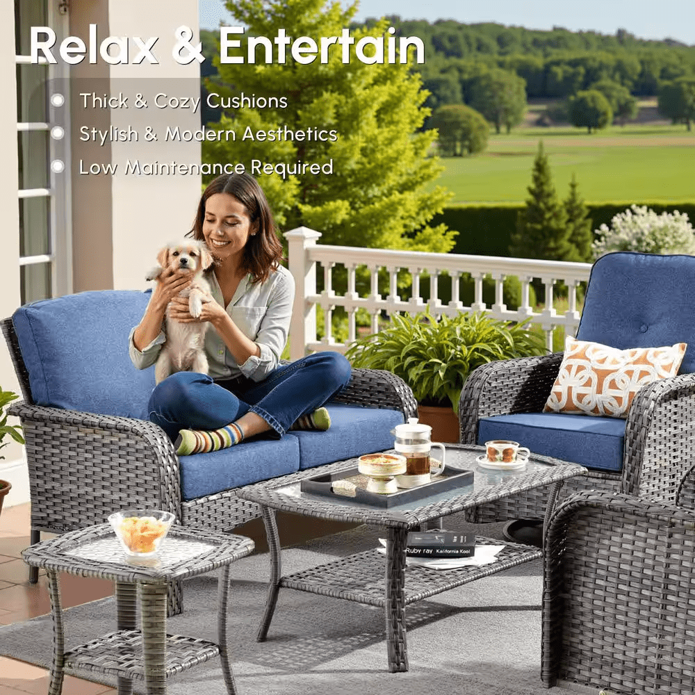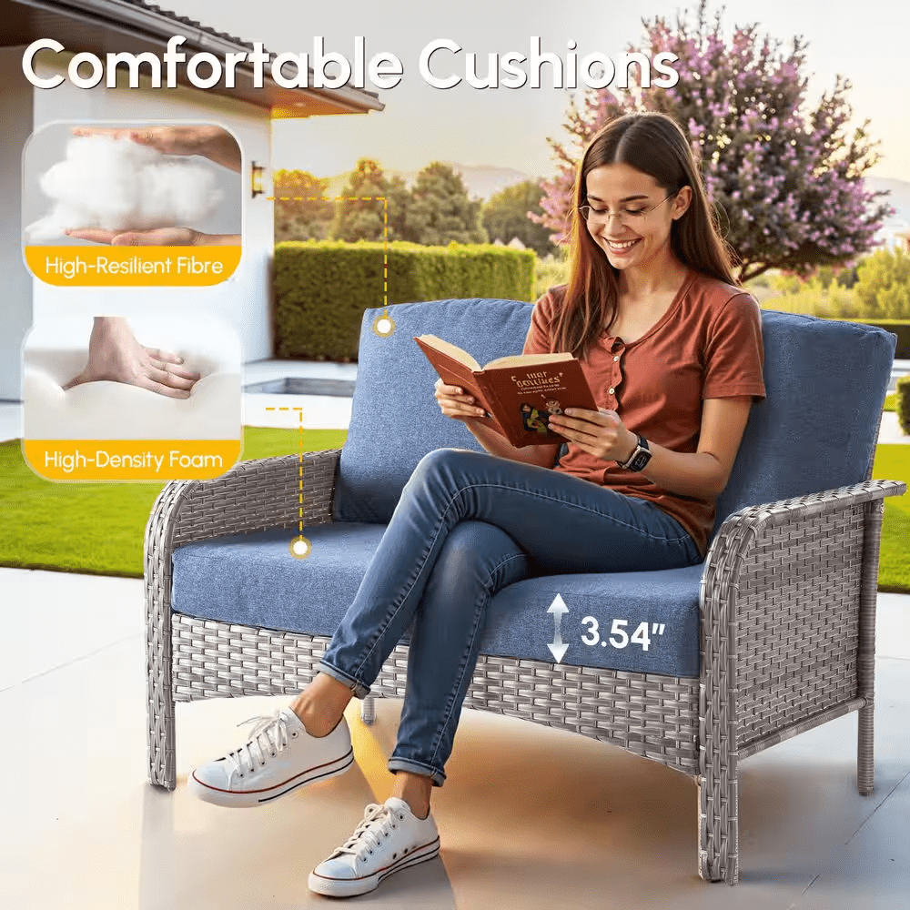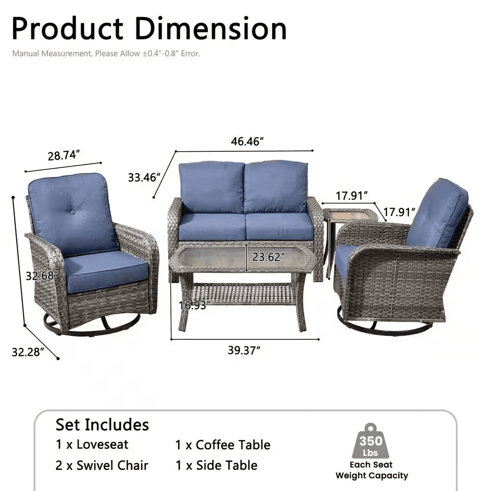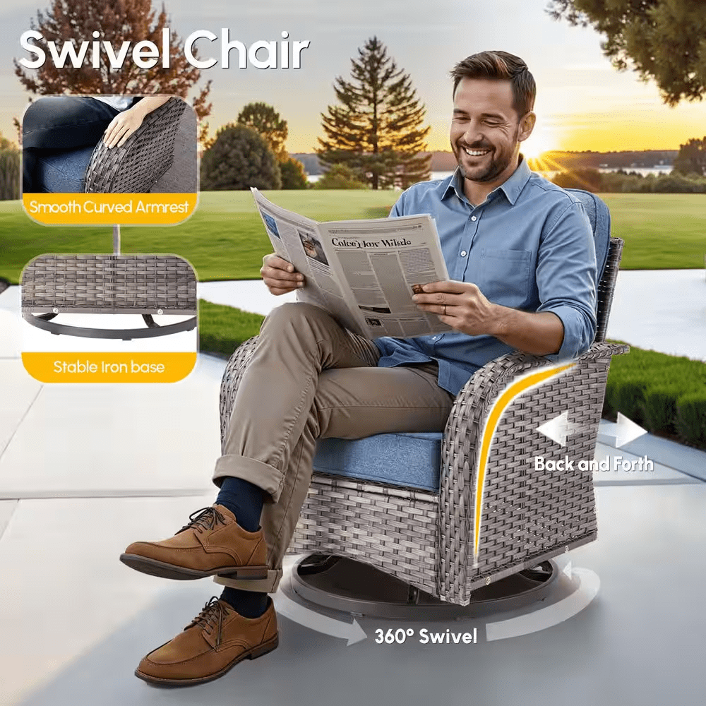 Elevate your outdoor living with the Ruby Grey 5-Piece Wicker Patio Conversation Set-the perfect gathering spot for family and friends in your patio or deck. This chic and compact set includes a loveseat, two swivel rocking chairs, a coffee table and a side table, ideal for smaller patios or balconies. Built to last, the set features a sturdy, powder-coated iron frame wrapped in handwoven PE rattan that resists fading, UV exposure, and water. The high-density foam seat cushions and supportive back cushions offer outstanding comfort, while the fade-, UV-, and water-resistant cushion covers include zippers for easy removal and cleaning. Plus, the stylish coffee table and the side table bring you convenient places for resting drinks, snacks, or decor, and tempered glass tabletop is easy to clean and built to withstand sudden temperature shifts. With all hardware and easy-to-follow instructions included, assembly is simple. Don’t miss out! Create a cozy and stylish outdoor retreat with the Ruby 5-Piece Patio Set today!