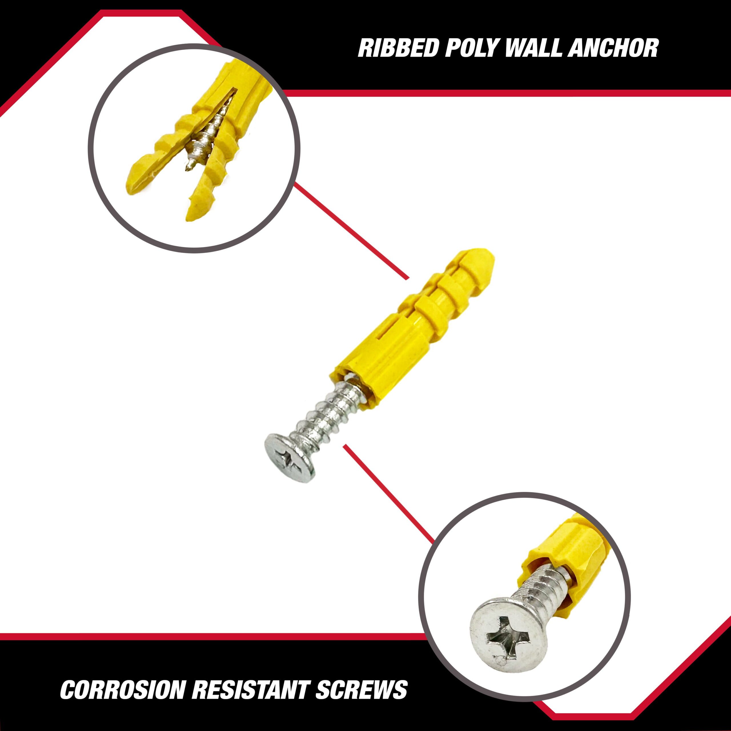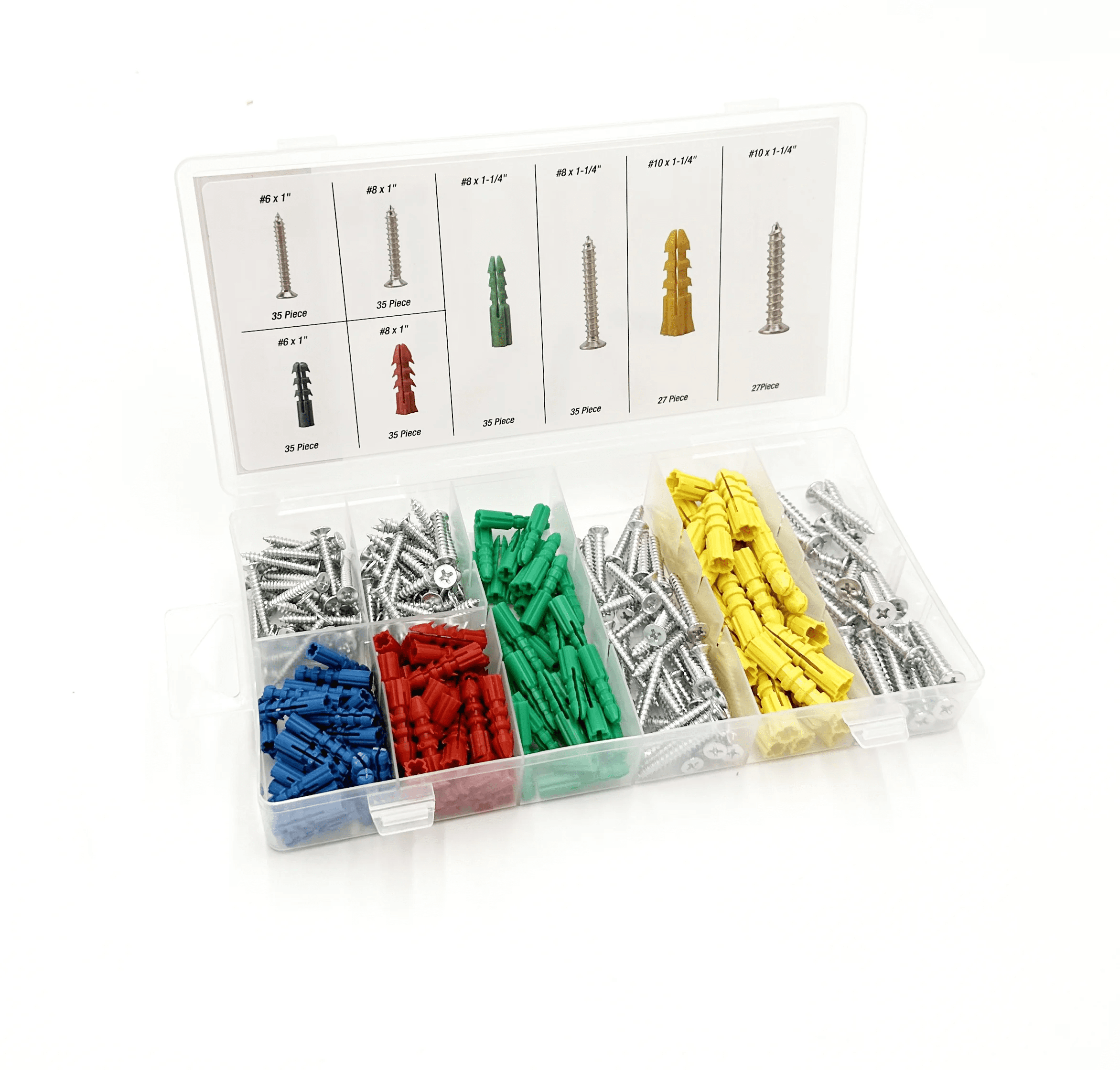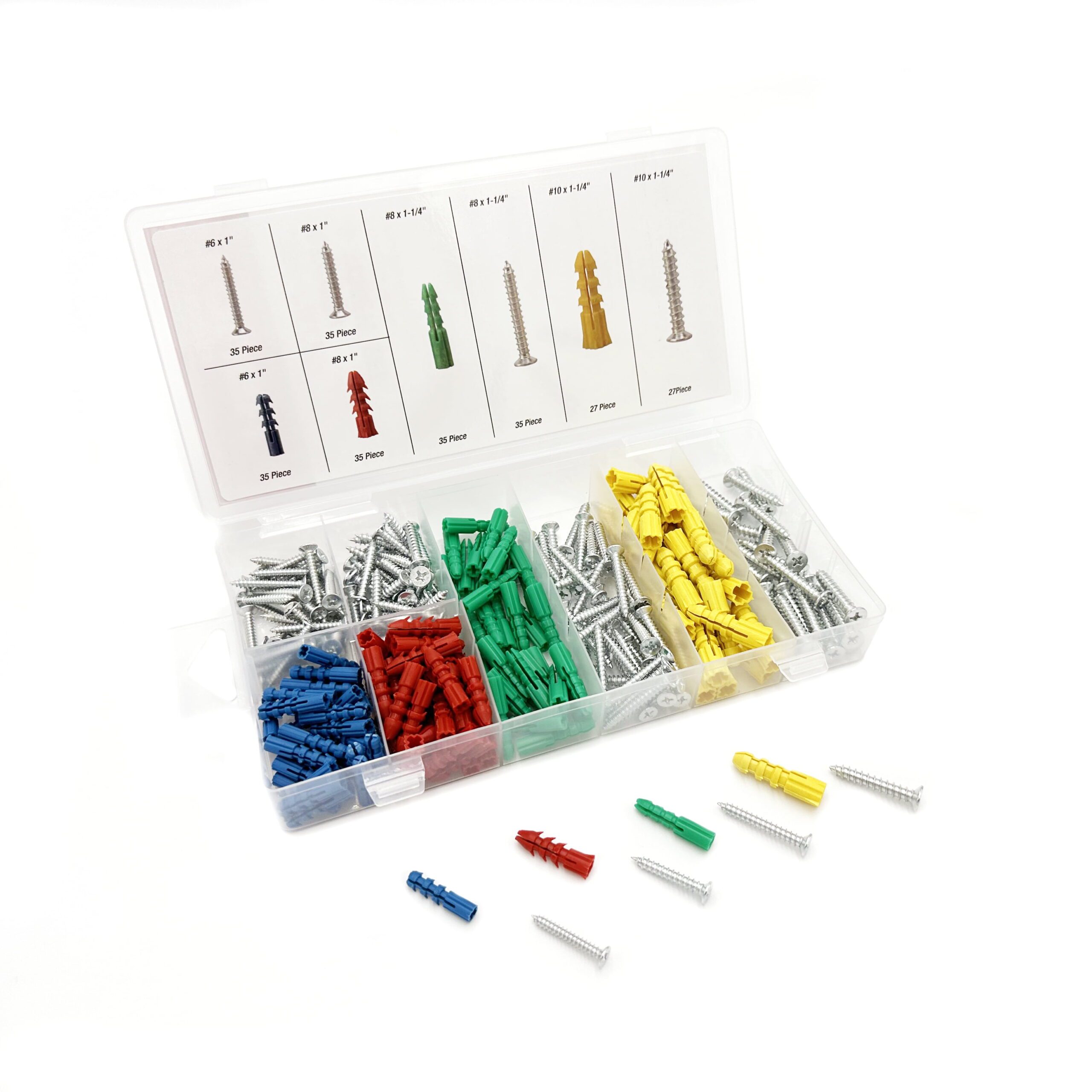 - Includes: Phillips Screws: #10 x 1-1/4″ – 27 PC, #8 x 1-1/4″ – 35 PC, #8 x 1″ – 35 PC, #6 x 1″ – 35 PC, Wall Anchors: #10 x 1-1/4″ – 27 PC, #8 x 1-1/4″ – 35 PC, #8 x 1″ – 35 PC, #6 x 1″ – 35 PC