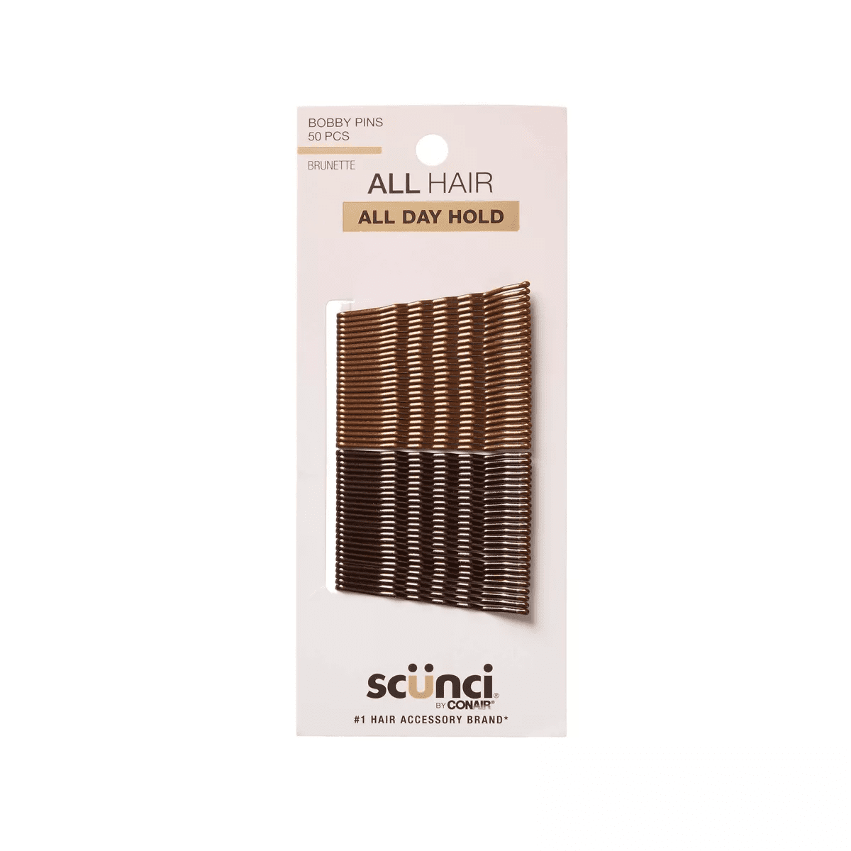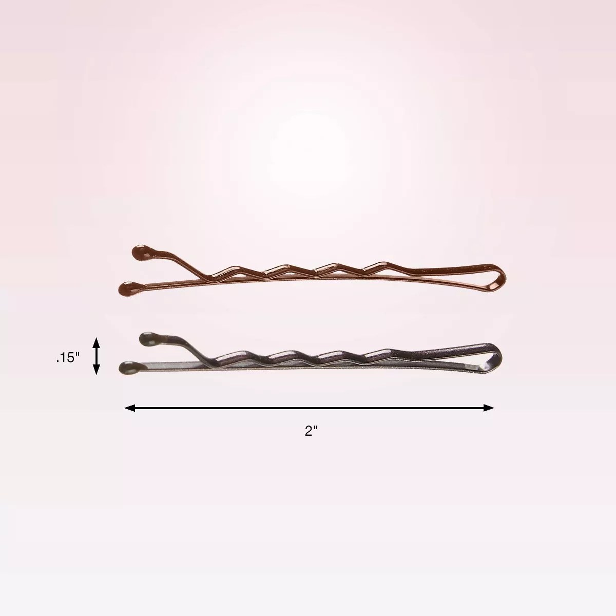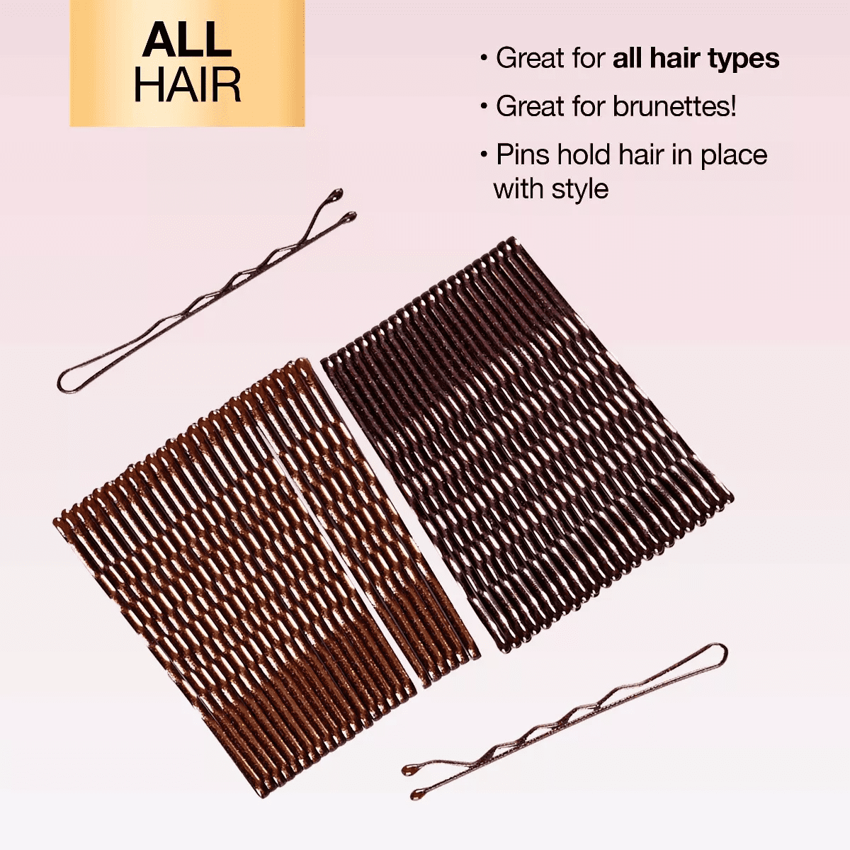 Keep every hair in place with this 50-pack of shiny metallic-finished Bobby Pins. Keep a supply at home, school, office, or at the gym. 25 light brunette and 25 dark brunette pins.