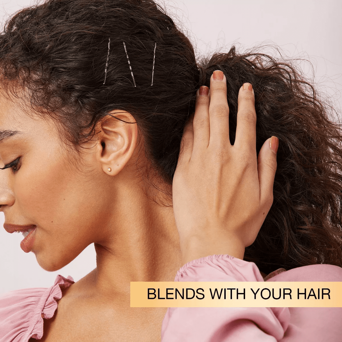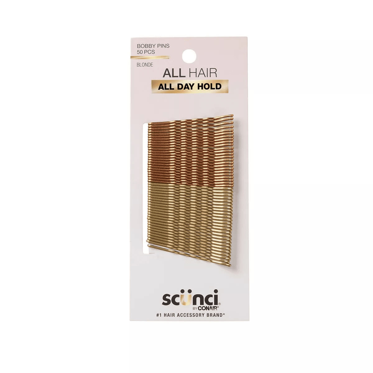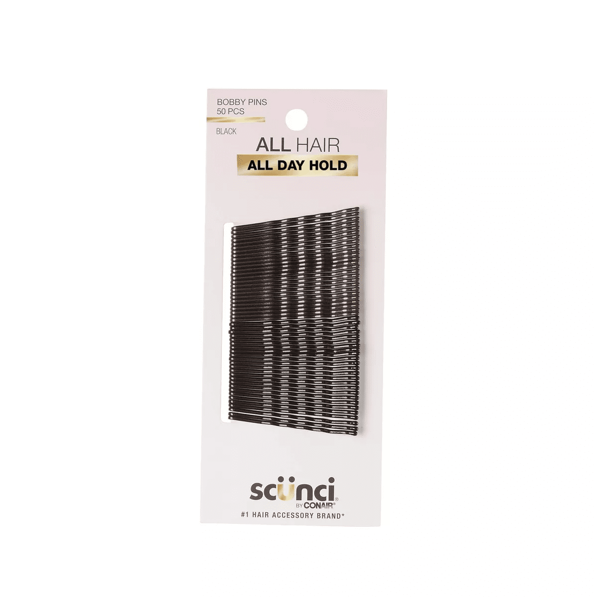 Keep every hair in place with this 50-pack of shiny metallic-finished Bobby Pins. Keep a supply at home, school, office, or at the gym. 25 light brunette and 25 dark brunette pins.