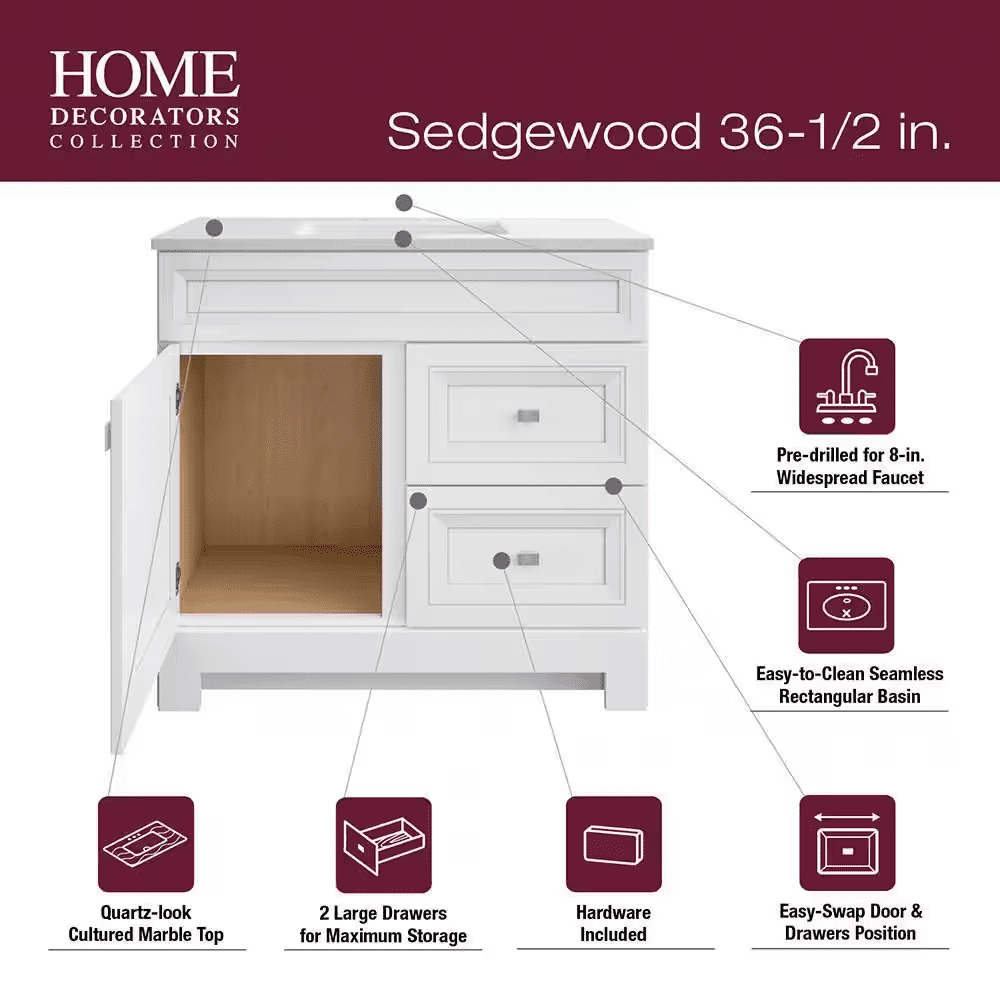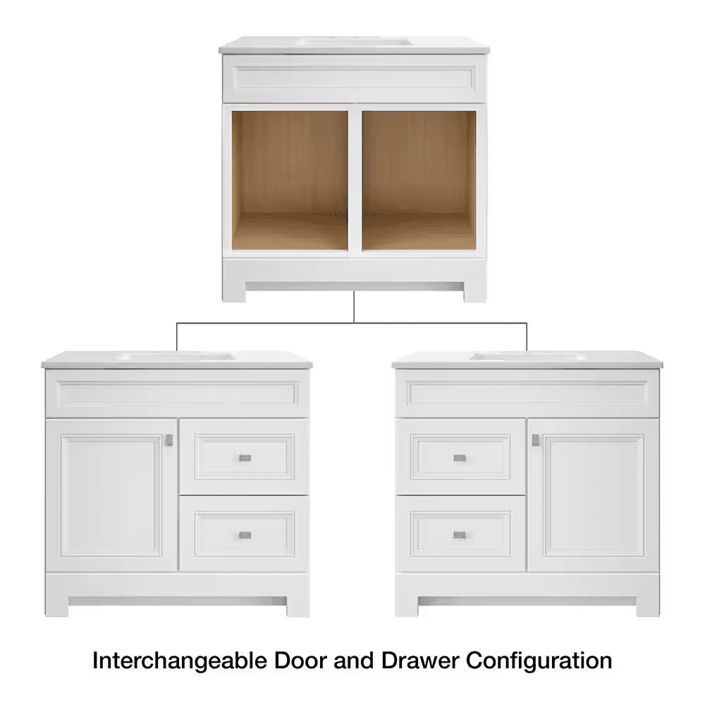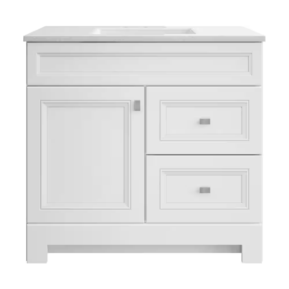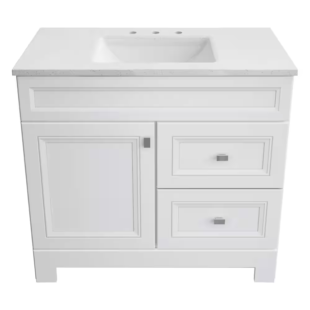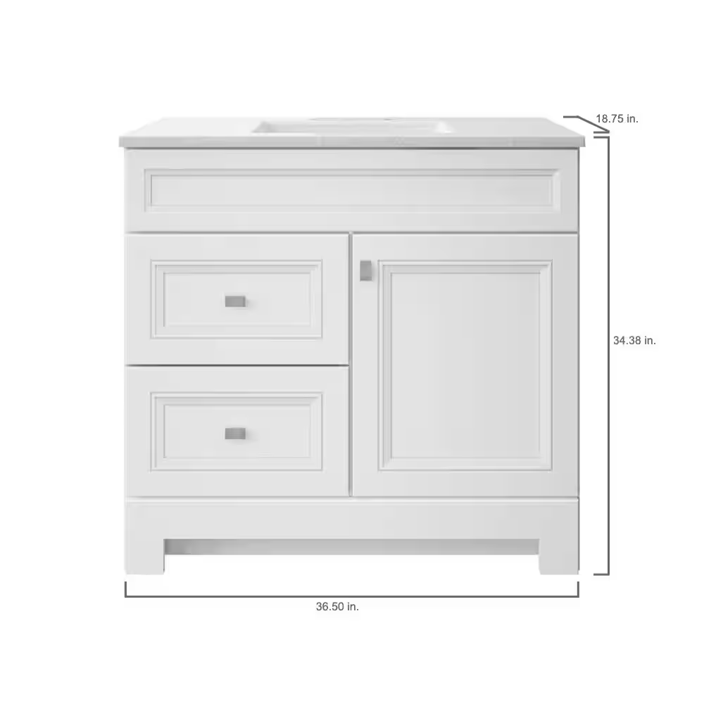 Brighten your bathroom with the Sedgewood vanity collection. Make the most of your space with the Sedgewood bathroom vanity—a stylish yet functional storage solution for any bathroom. Measuring 36.5” W x 18.75” D x 34.375” H, this vanity is constructed with durability in mind. Finished in a clean, durable white laminate, the Sedgewood vanity complements any bathroom decor, from classic to modern. Its transitional-style door features concealed adjustable hinges for a smooth, seamless look. For easy setup, the drawers and soft-close door can be swapped to be on the left or right with the innovative swap technology. Brushed nickel hardware pulls are included to match your bathroom’s aesthetic. Topped with an arctic-colored solid surface vanity top and white integrated rectangular sink basin, this vanity adds brightness and easy-clean convenience to your daily routine. Built to last, the Sedgewood vanity arrives fully assembled and delivers dependable quality and classic style for years to come.