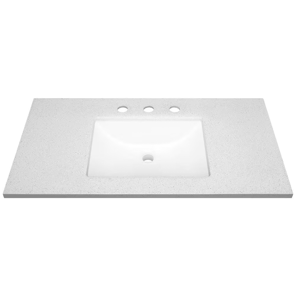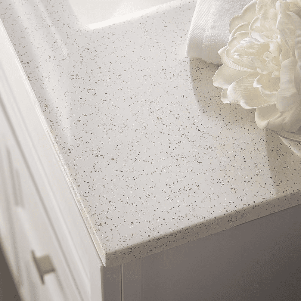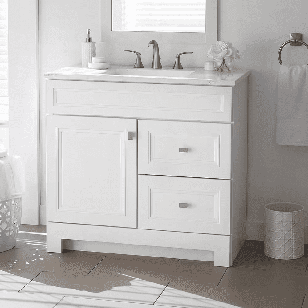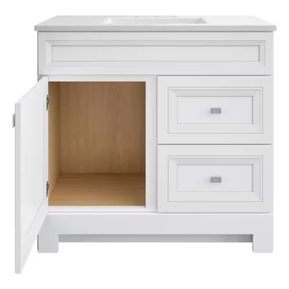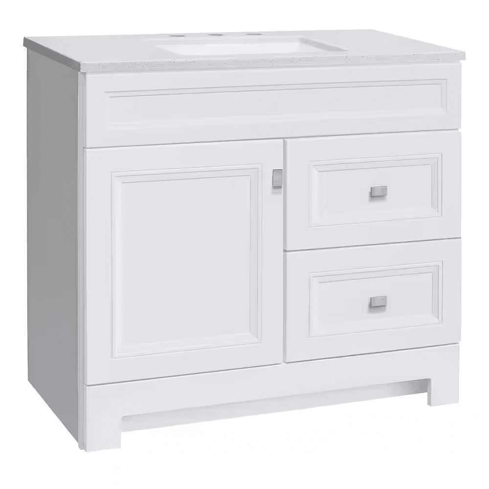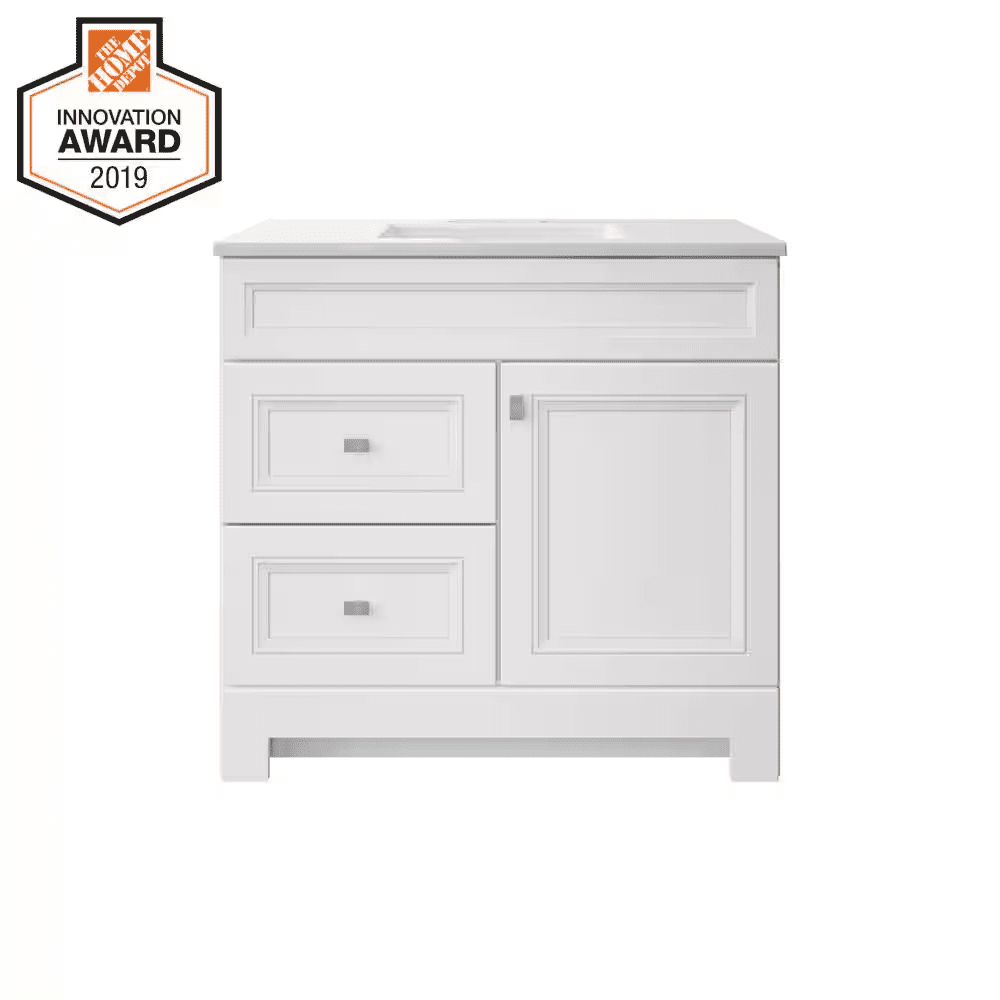 Brighten your bathroom with the Sedgewood vanity collection. Make the most of your space with the Sedgewood bathroom vanity—a stylish yet functional storage solution for any bathroom. Measuring 36.5” W x 18.75” D x 34.375” H, this vanity is constructed with durability in mind. Finished in a clean, durable white laminate, the Sedgewood vanity complements any bathroom decor, from classic to modern. Its transitional-style door features concealed adjustable hinges for a smooth, seamless look. For easy setup, the drawers and soft-close door can be swapped to be on the left or right with the innovative swap technology. Brushed nickel hardware pulls are included to match your bathroom’s aesthetic. Topped with an arctic-colored solid surface vanity top and white integrated rectangular sink basin, this vanity adds brightness and easy-clean convenience to your daily routine. Built to last, the Sedgewood vanity arrives fully assembled and delivers dependable quality and classic style for years to come.