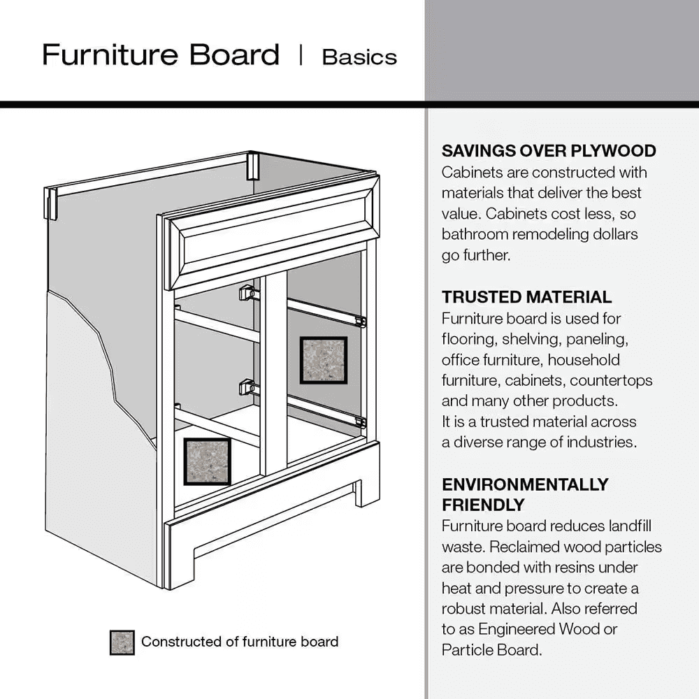 - Includes vanity top, cabinet soft close hinges, cabinet hardware