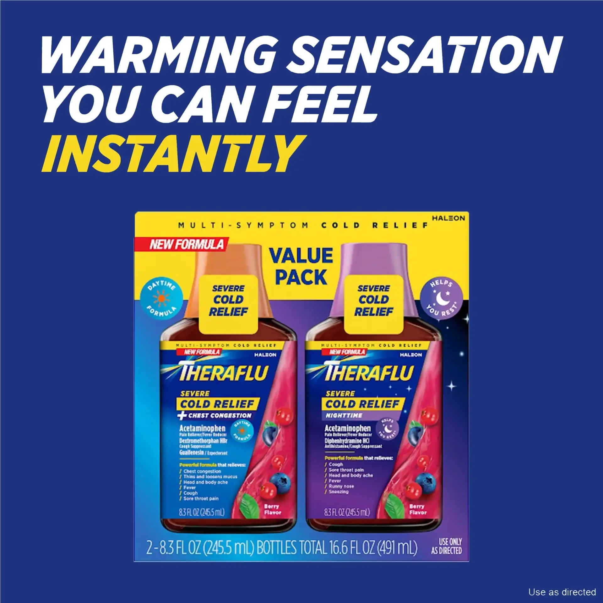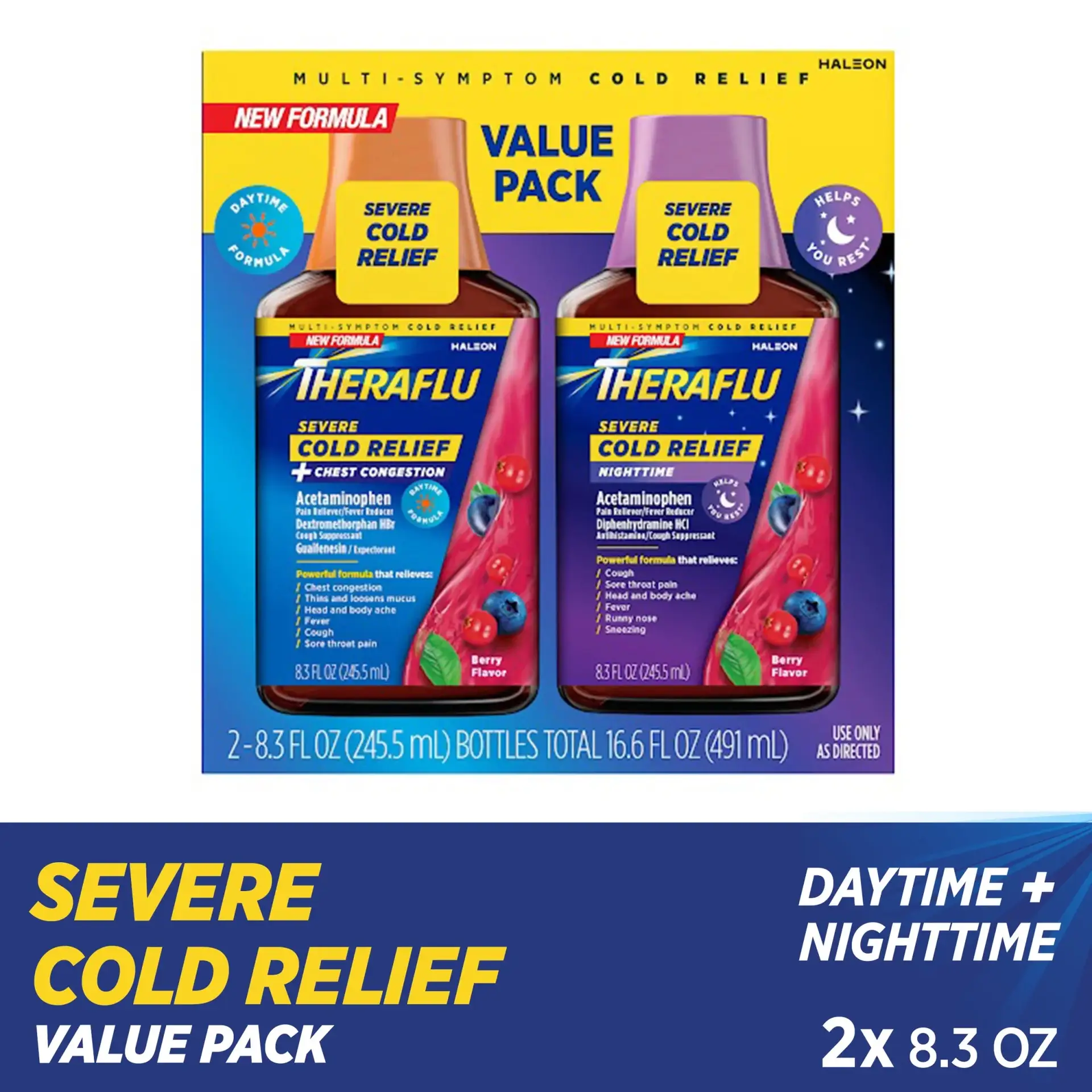 Theraflu Severe Cold and Cough Daytime and Nighttime Cold Medicine delivers serious cold and cough relief with each power-packed dose. Featuring a tasty berry flavor, this nighttime and daytime cough medicine for adults contains prescription-free, maximum strength medications that provide a unique warming sensation with each dose. Theraflu daytime and nighttime cough syrup for adults helps relieve your worst cold symptoms, like headache and body aches, sore throat, fever and cough. In addition, Theraflu nighttime cold medicine relieves runny nose and sneezing so you can rest easy. Both Theraflu nighttime and daytime cold medicine for adults contain maximum strength medications that deliver fast cold symptom relief, including a fever reducer, pain reliever and cough suppressant. Adults and children 12 years and older may take 30mL of either daytime or nighttime severe cough and cold medicine every four hours as needed. Say goodbye to your cold and flu symptoms for good, and get back on your feet with the power of daytime and nighttime Theraflu.