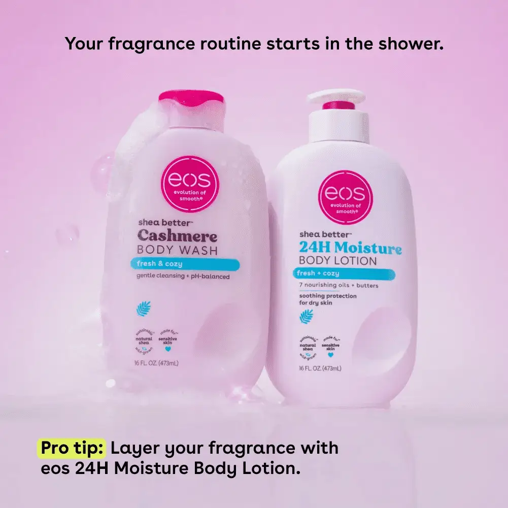 eos Shea Better Fresh & Cozy Body Wash is pH-balanced to gently cleanse from head to toe. This incredible formula combines the fresh, foamy clean of a gel with the nourishing, non-stripping care of a cream, leaving your skin feeling silky-smooth and cashmere-soft. Made with our Cashmere Smooth Complex, a rich blend of shea butter, cocoa butter, and argan butter. Say hello to your perfect everyday body wash.