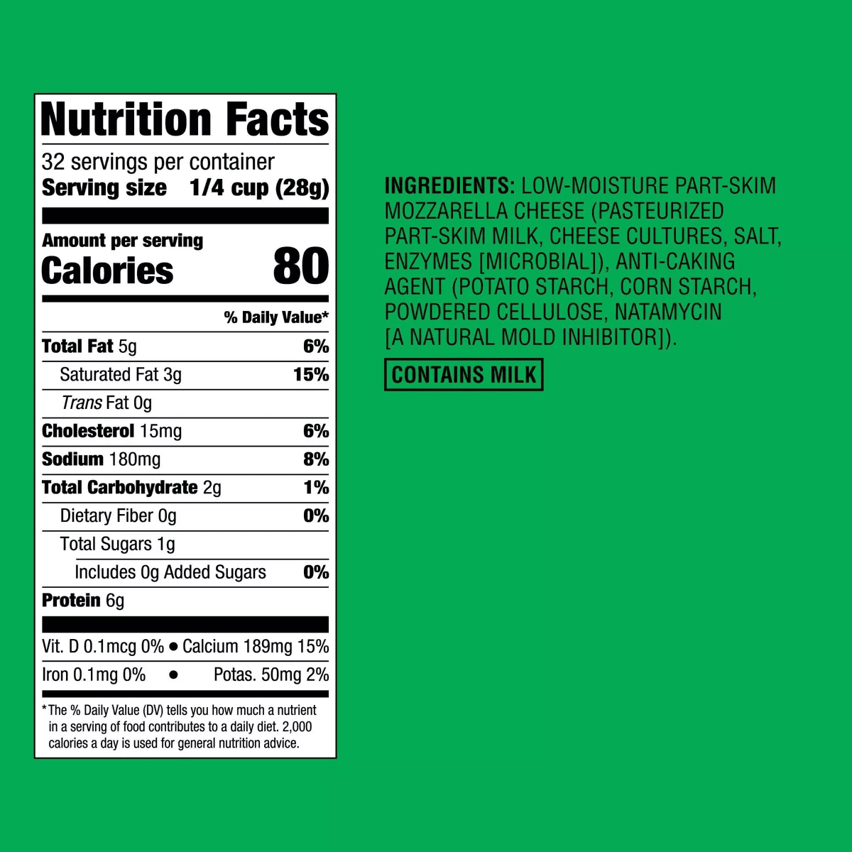 • 32oz package of shredded low-moisture part-skim mozzarella cheese is great for pizza, pasta dishes, appetizers and much more