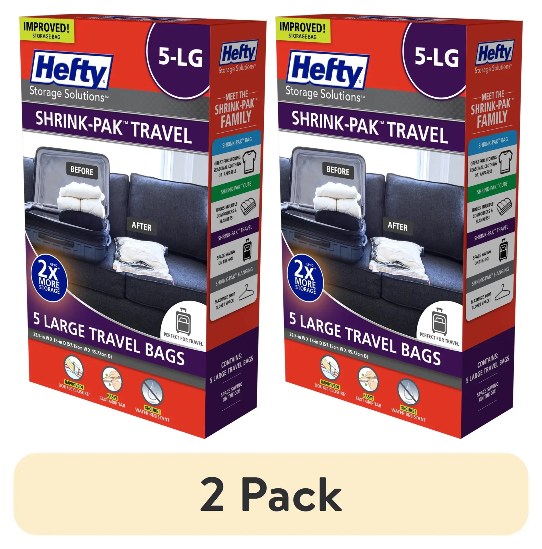 Hefty branded Compression Travel Storage Bags! 1 Box contains (5) Travel Bags. Simply roll your bags to compress air out of the bag…no vacuum required! Travel Bag Dimensions = 22.5″ x 18″. Adults and Tweens. When you’re traveling use SHRINK-PAK travel bags to easily take all your necessities with you, and still have room for all your extra just-in-case items. SHRINK-PAK travel bags are so effective at saving space that you don’t have to worry about overpacking. Roll up to remove air from the bag and save up to 2 times more space*. Conveniently use for all kinds of travel.