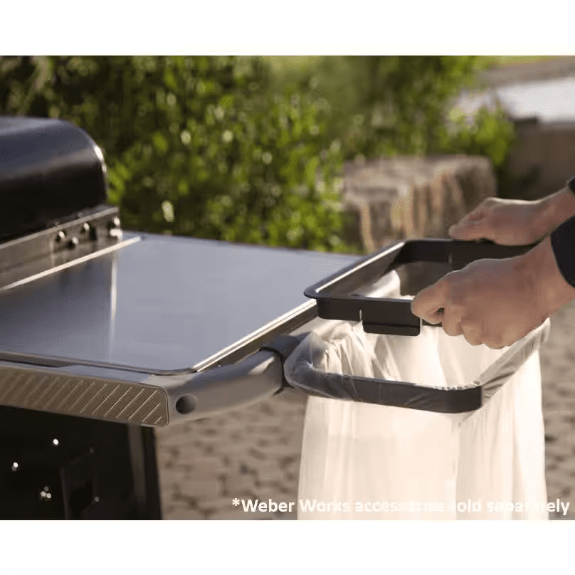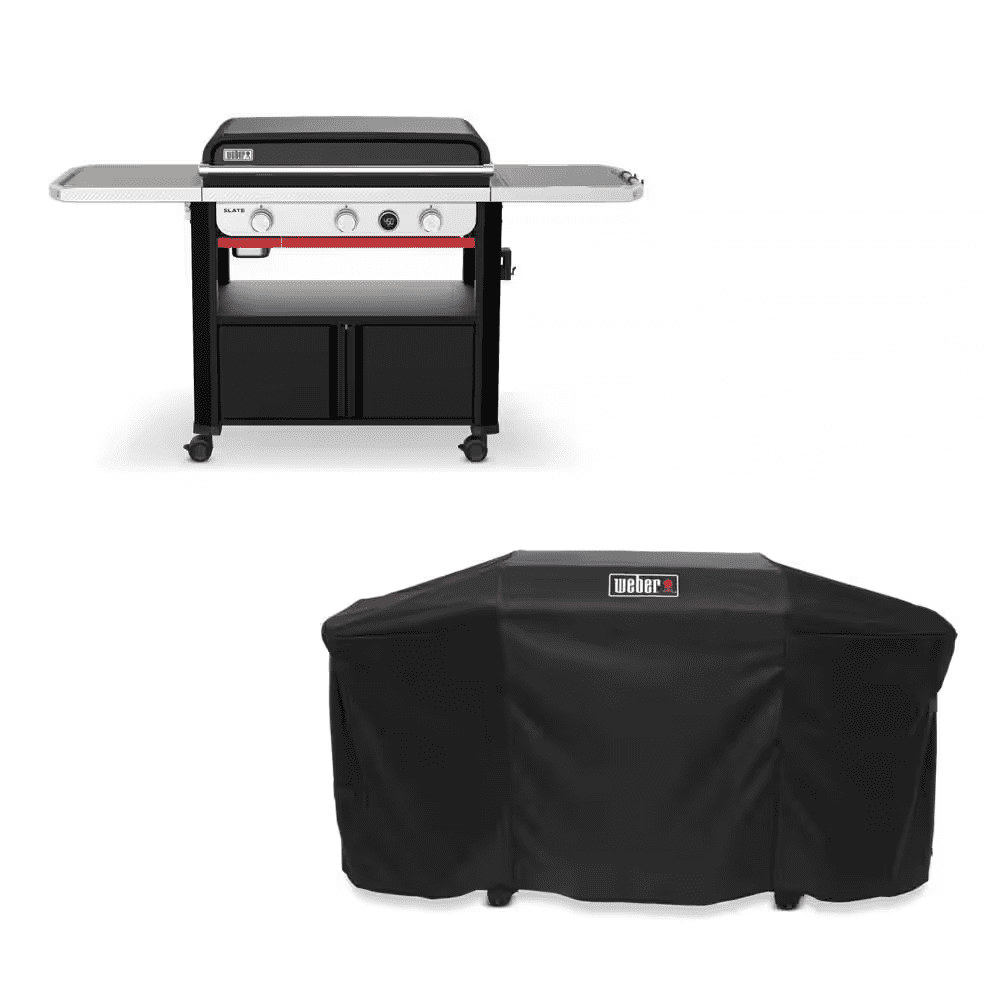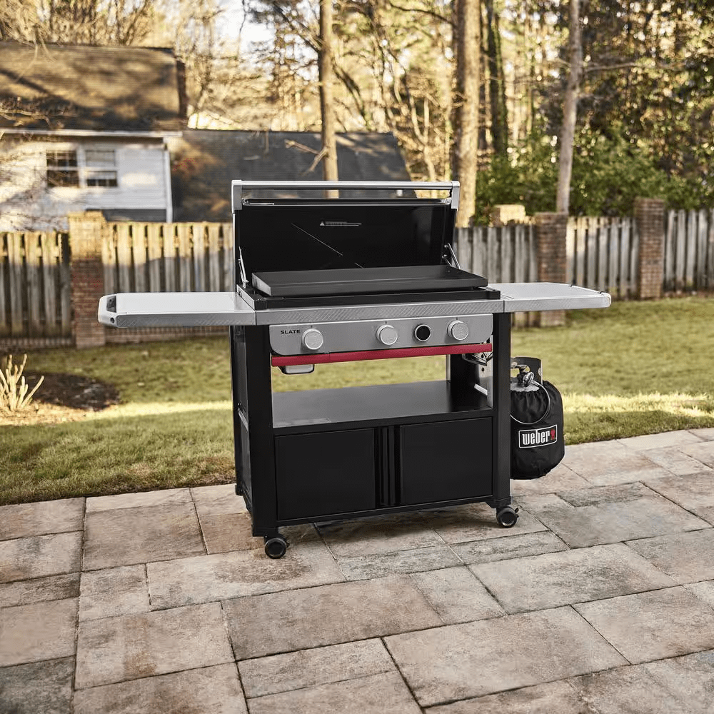 Have more fun griddling on the game changing, Home Depot exclusive, 30 in. rust-resistant Weber SlateTM Griddle with convenient closed cabinet storage. It features a pre-seasoned carbon-steel cooktop that is ready to cook on right out of the box and stays ready, not rusty, use after use. It reaches over 500°F and heats evenly edge-to-edge, so your food cooks consistently no matter where you place it on the griddle, while its digital display lets you easily keep an eye on the griddle surface temperature. Create crispy smashed burgers and bacon, beautifully browned pancakes and paninis, flavorful fajitas and stir-fries, and more. Plus, with the Weber WorksTM Prep, Cook, and Store System you can keep cooking and cleaning supplies handy, carry food and condiments from the kitchen to the griddle, convert the side table into a prep station and stow gear in tightly sealed containers (accessories sold separately).