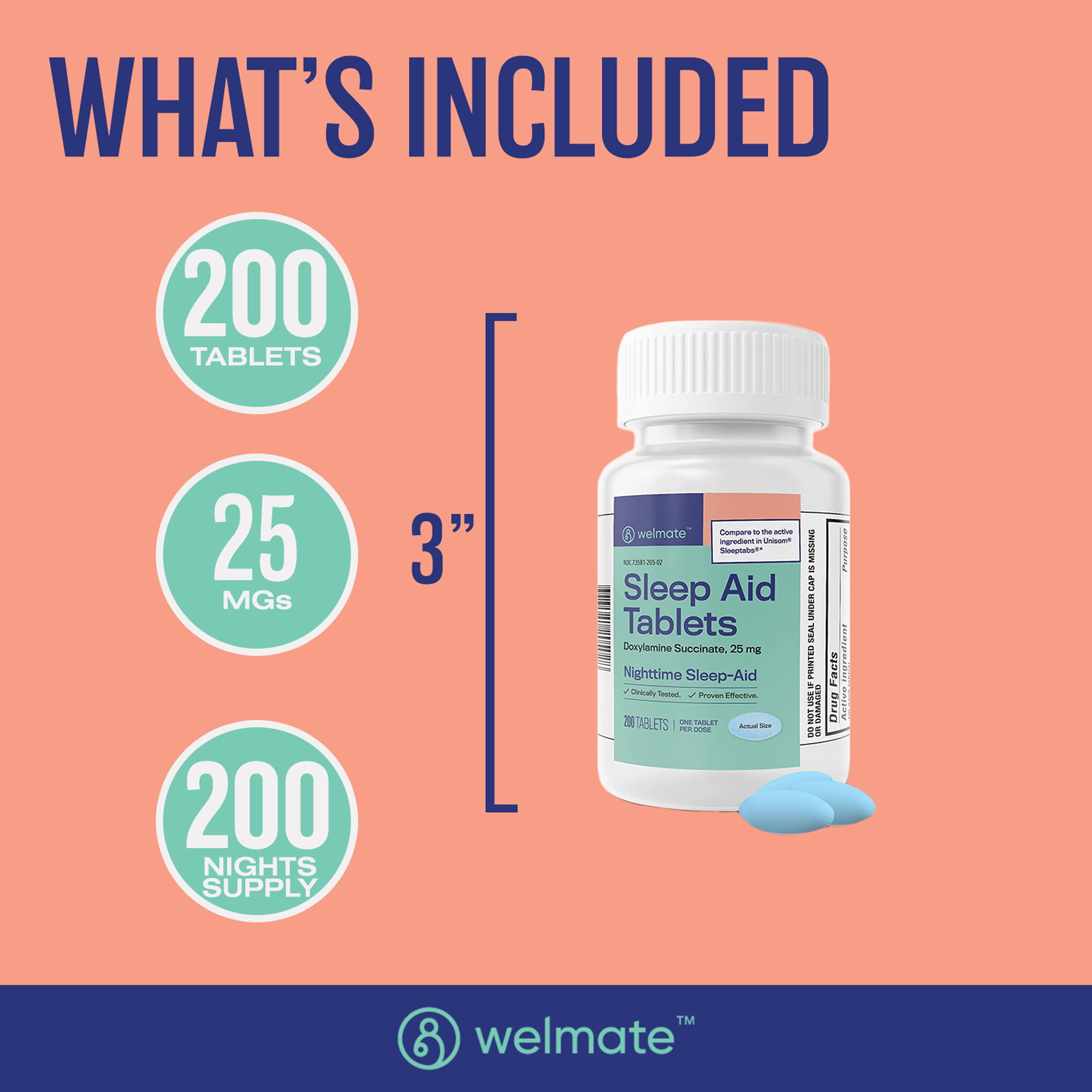 - FOCUS ON SLEEP: With a single one-tablet dose, Welmate Sleep Aid Tablets with doxylamine succinate 25 mg as the active ingredient help reduce difficulty in falling asleep. This nighttime sleep aid contains no pain reliever