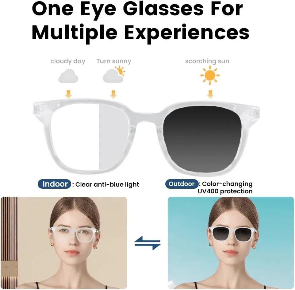 - 【New Design】 Smart glasses with UV400 polarized photochromic lenses, the lenses of the audio glasses can be discolored from clear and blue light resistant indoors to dark and UV resistant outdoors, providing superior color, clarity and contrast while effectively filtering out harmful glare and sunlight damage to protect your eyes anytime, anywhere!