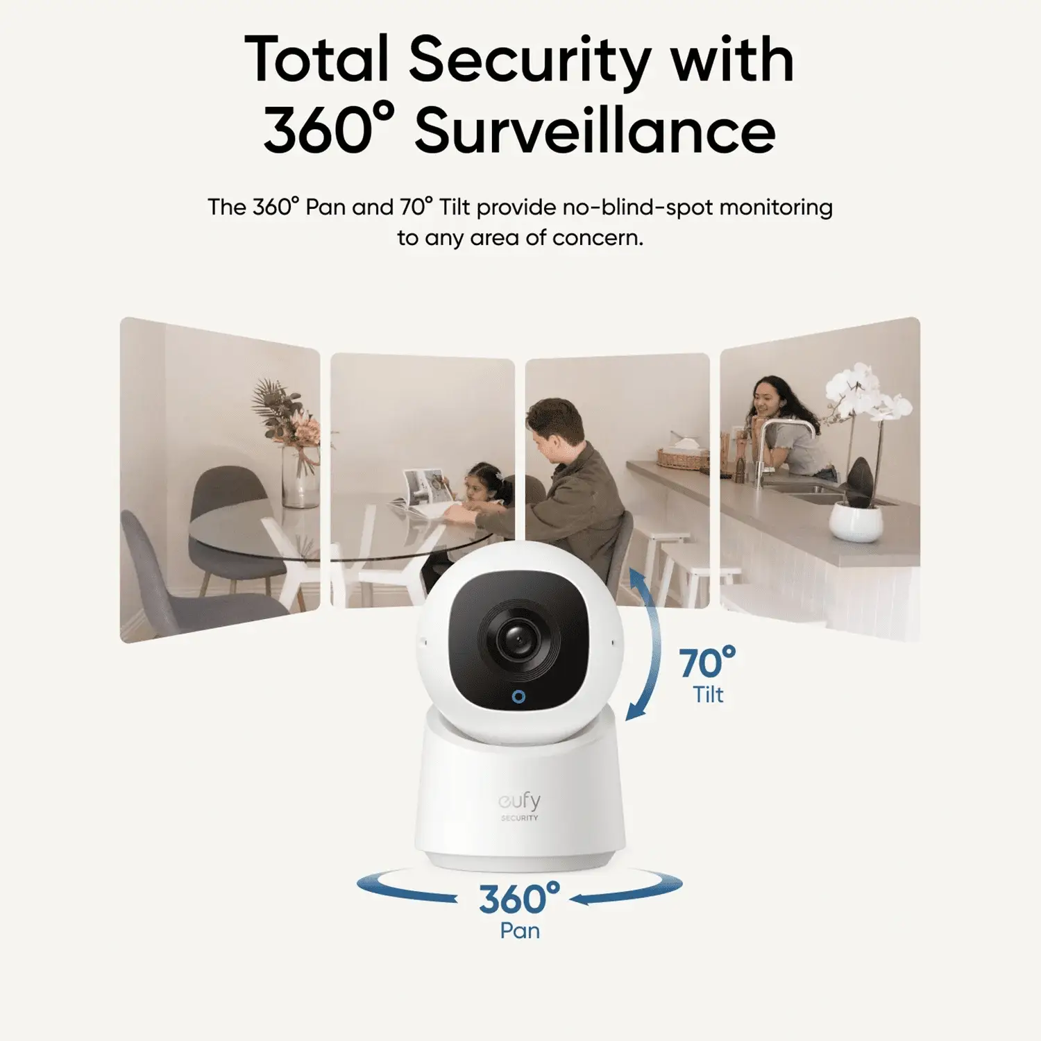 Gain 360° views of what’s occurring inside your home or apartment in vivid 2K clarity with eufy Indoor Cam C220. The 2K full HD indoor camera captures enhanced, detailed sights in your house as 360° Pan and Tilt capability eliminates blind spots ensuring corner to corner visibility on the eufy app. Exclusive AI-powered Tracking and Motion Detection tracks movement, following people, pets, or objects around a room, while sending you instant notifications via the eufy app for enhanced peace of mind. Keep an eye on specific areas such as the front door or a media console when you set up Customizable Detection Zones that will send relevant alerts upon detecting activity. Effortlessly speak to family or interact with guests from wherever you are with Two-Way Audio. With eufy, enjoy local on-device storage, keeping your recorded video and data under your control without monthly cloud storage fees.