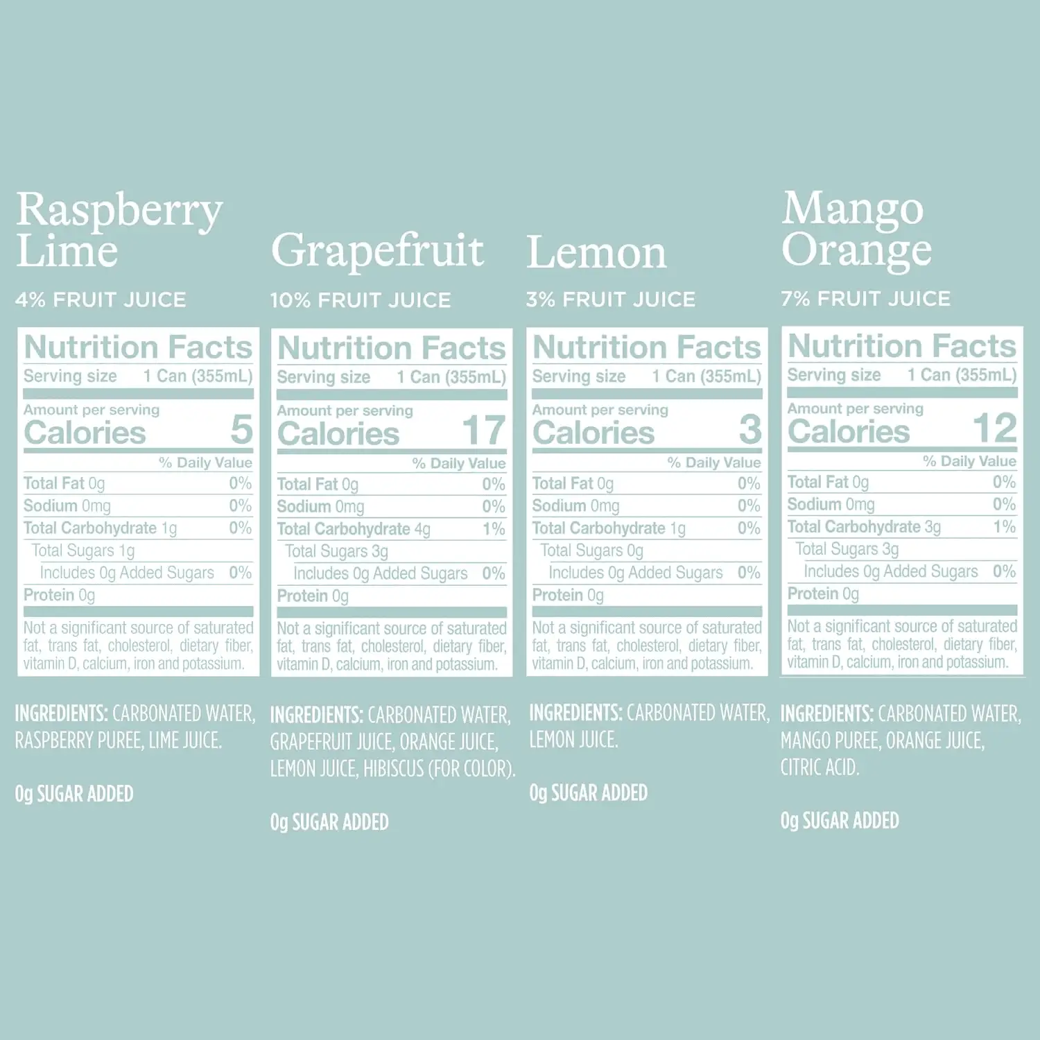 - Pack includes 20 sparkling water cans (12 fluid ounces per can): lemon (5 cans), grapefruit (5 cans), raspberry Lime (5 cans), and orange Mango (5 cans)