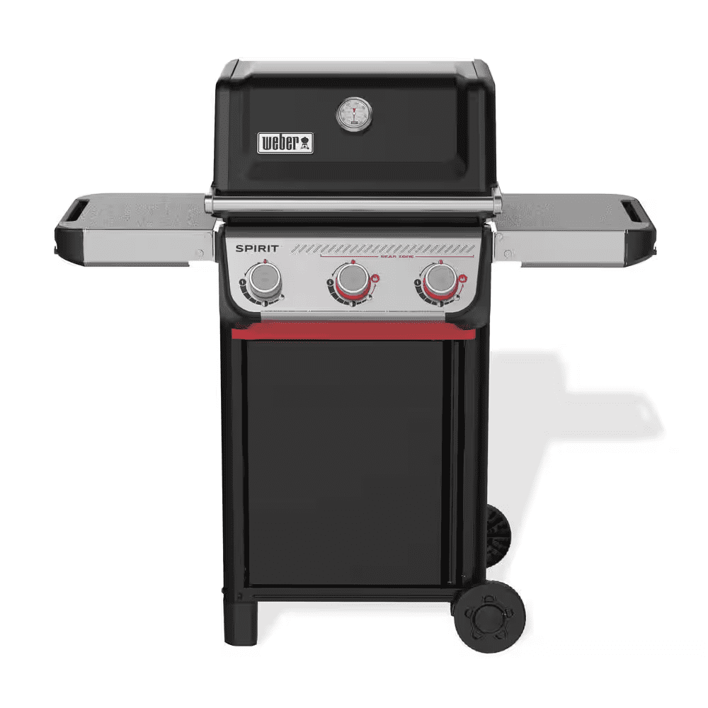 Grill delicious food on the reinvented black 3-burner Spirit E-325 propane gas grill with Sear Zone. Two red Boost Burner knobs unleash 40% more power in the Sear Zone. Ignite each burner easily with one hand with Snap-Jet Ignition. Control heat precisely with a full range of temperatures from high to low. You can add a variety of Weber Works snap-on accessories (sold separately) to the side rails. If you’re looking for a rotisserie grill, consider adding the compatible Weber rotisserie accessory (sold separately). Scratch-resistant Hammertone metal side tables fold down for smaller spaces. The warming rack keeps food warm, toasts buns, or grills smaller items. This gas grill is backed with a warranty. Liquid Propane tank sold separately.