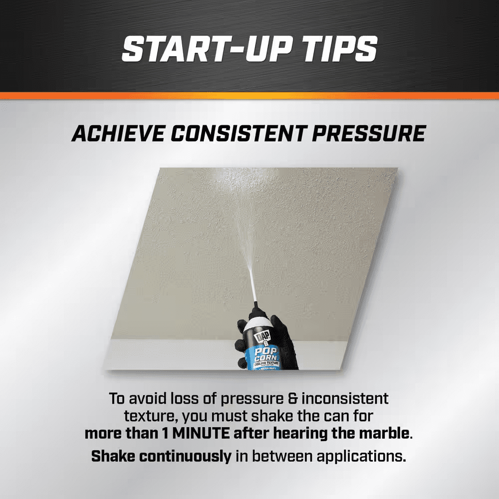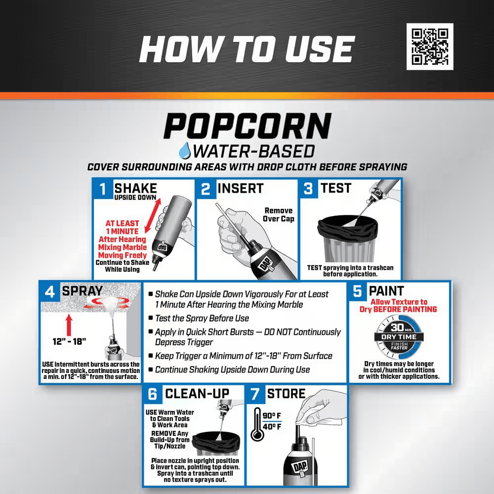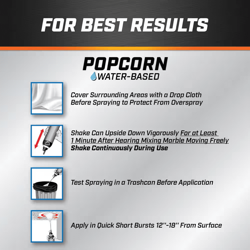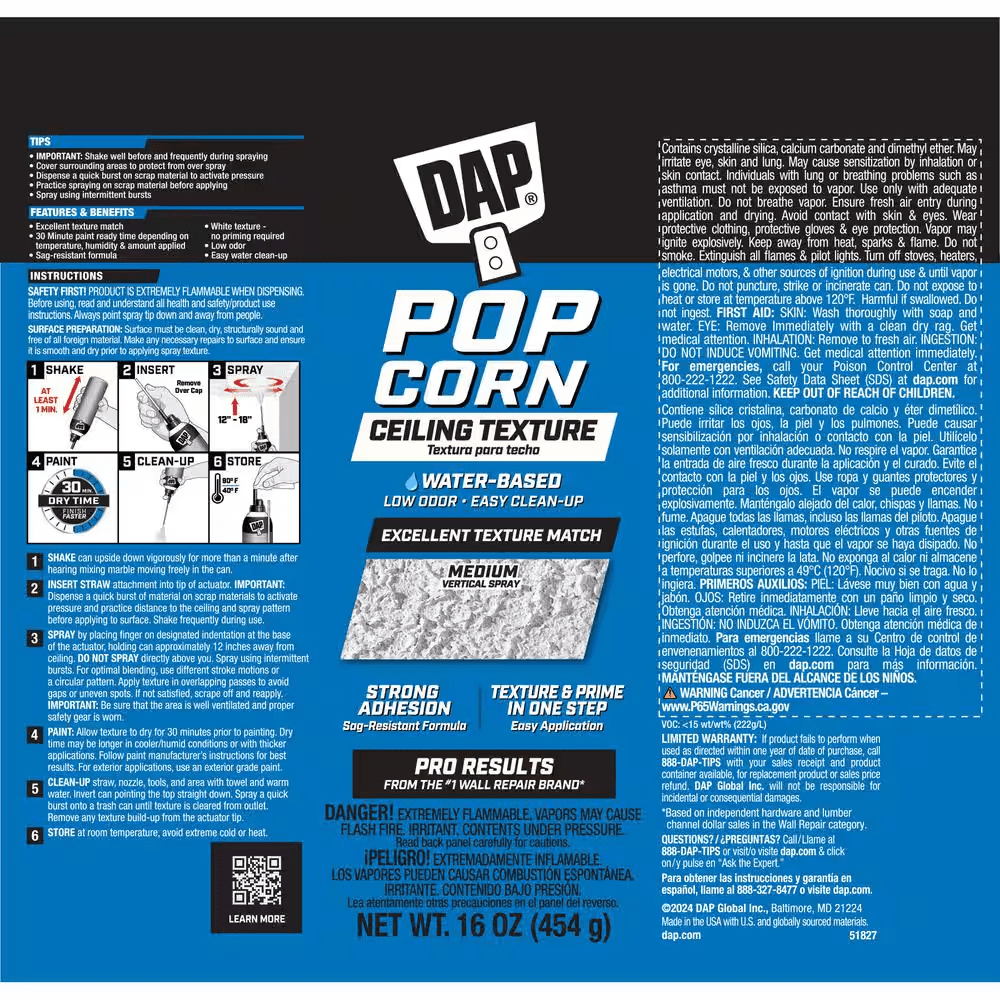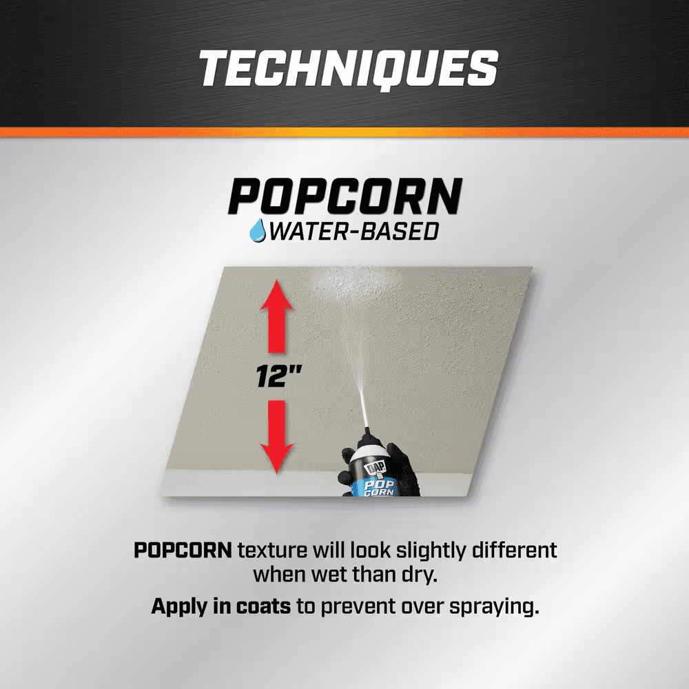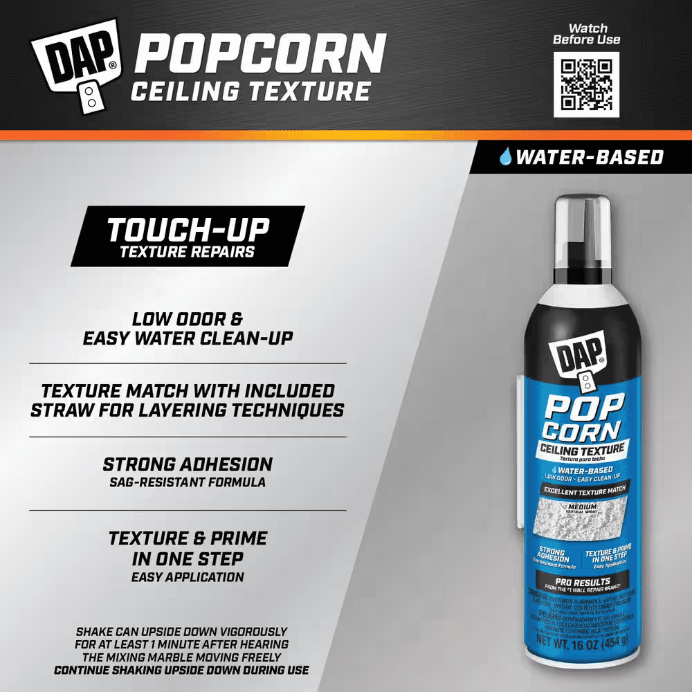 DAP Ceiling Spray Texture Popcorn Water Based is an easy to use aerosol for targeted ceiling repairs that provides excellent texture match with included straw, circular patterns and different stroke motions. Apply texture in overlapping patterns to avoid gaps or uneven spots in finish. Quick repair spray texture in a white finish and a non sag formula has strong ceiling adhesion. Product does not require priming or painting. Fast dry time of 30 minutes. Works as a popcorn spray texture for ceilings to repair textured surfaces on drywall, stucco, and plaster. Use for popcorn texture ceiling repairs and touch ups including small holes, and minor repairs. Before applying, shake vigorously for one minute after mixing ball rattles in a variety of directions including upside down. Next, remove over cap and insert straw attachment into tip of actuator. Spray by pushing on trigger while keeping the can 12 inches from the surface. When applying, use different stroke methods or a circular pattern in overlapping passes to avoid gaps. Works on Interior/Exterior surfaces.
