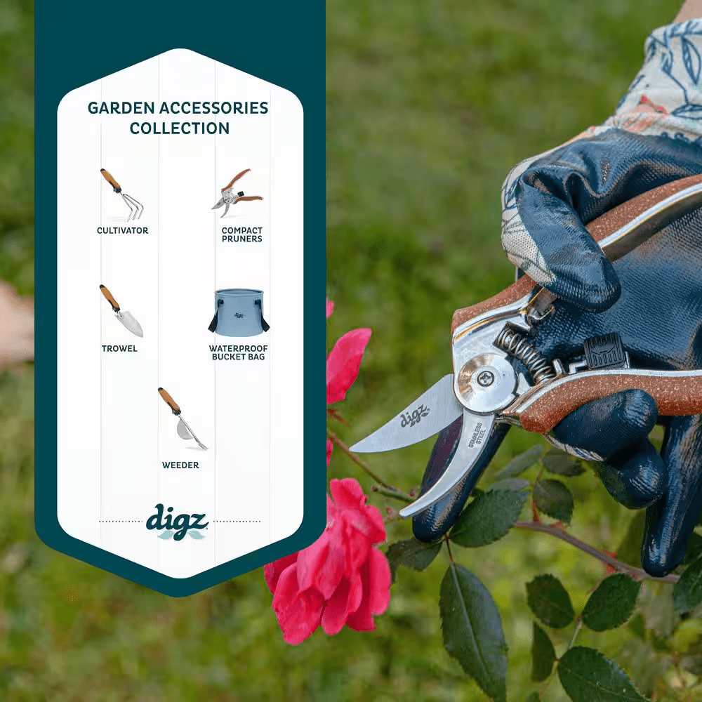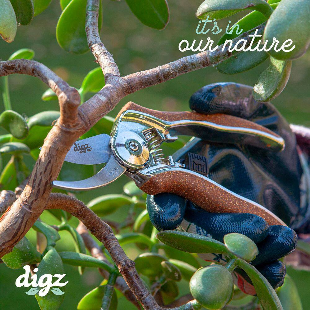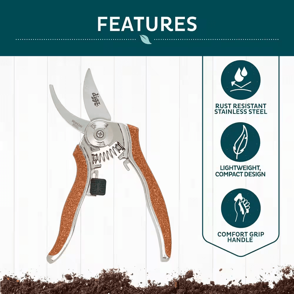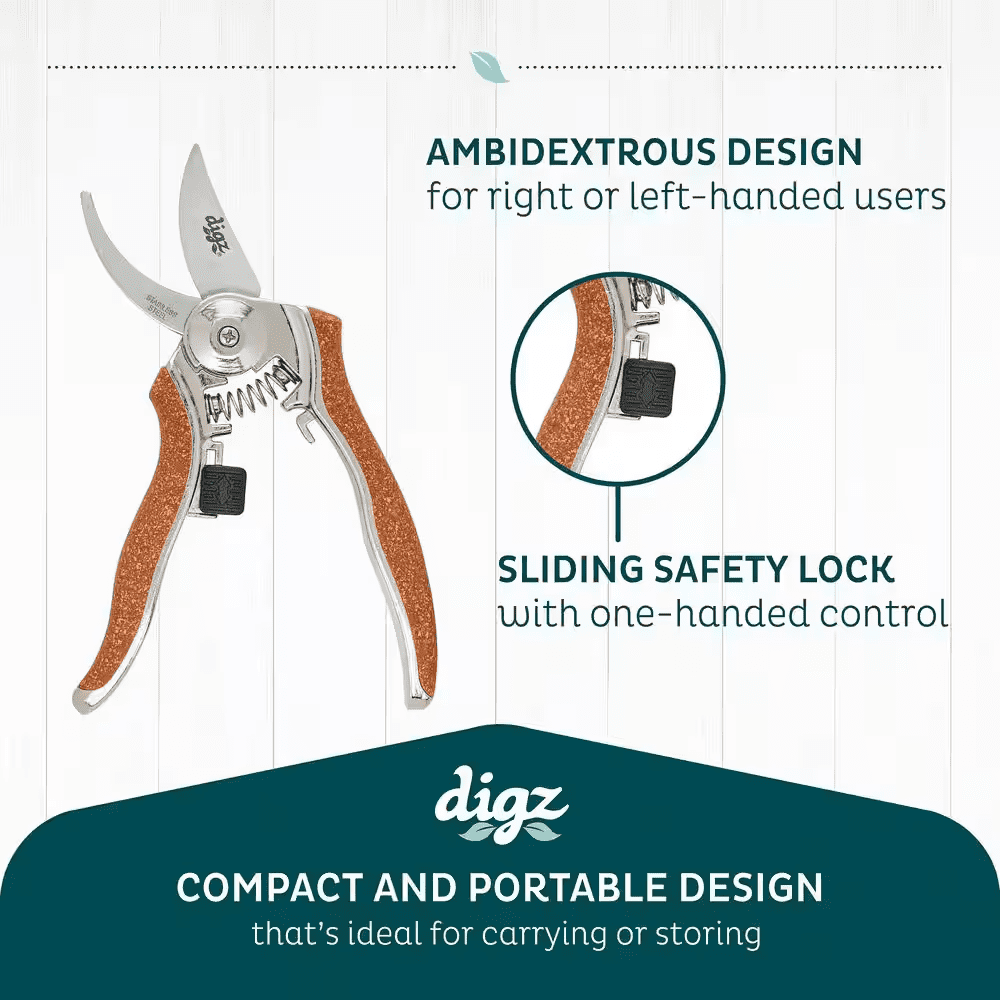 An essential garden tool to help keep your garden and landscaping tidy, Digs Compact Garden Pruner Shears provide a lightweight, portable design that’s ideal for carrying in your gardening tool belt or pocket. These garden pruners feature rust-resistant, stainless-steel blades that easily cut through stems and light branches. The ergonomically designed handle delivers enhanced control and is ambidextrous for right or left-handed users. A must have for your garden tool set, these hand garden pruners also include a sliding safety lock mechanism with easy-to-use, one-handed control to keep your hands safe.