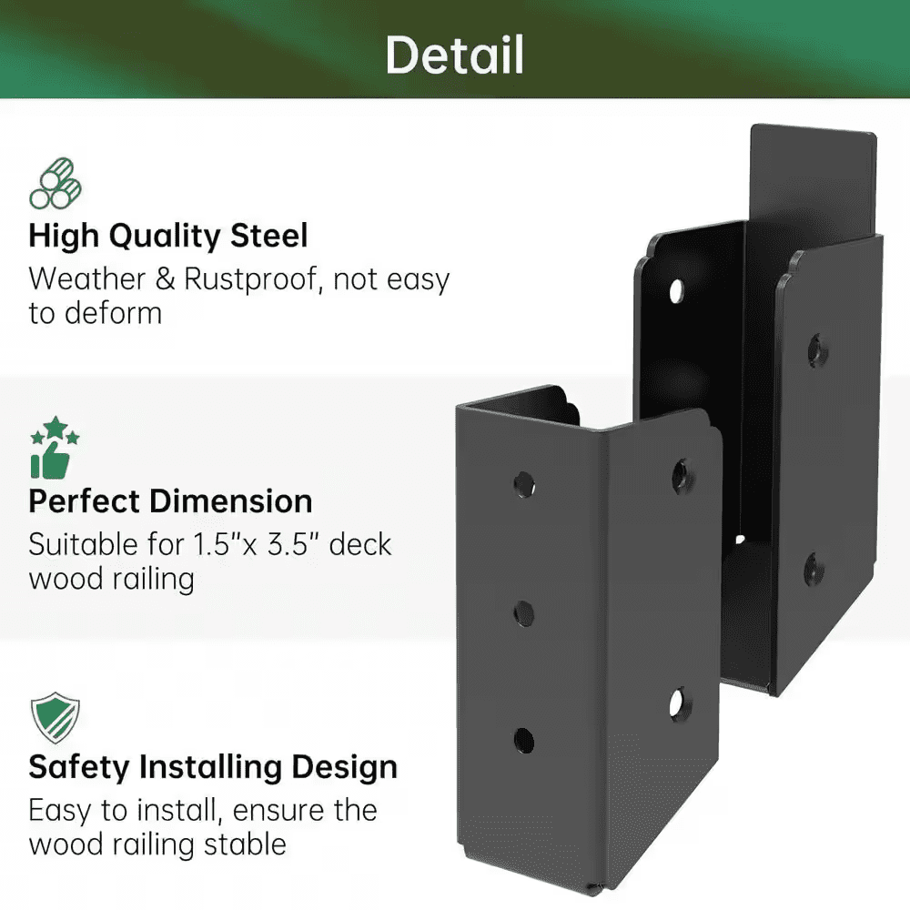 Enhance your deck or stair railing with these robust Stainless Steel Deck Railing Brackets, designed to securely connect 25°-35° oblique angles between wooden handrails and posts. Made from durable 304 stainless steel with a weather and rust-proof powder-coated finish, these brackets provide superior strength and longevity over traditional nylon connectors. Perfect for a variety of applications, including porch railings, wooden fences, and more, these brackets are your go-to solution for a reliable and sturdy connection.