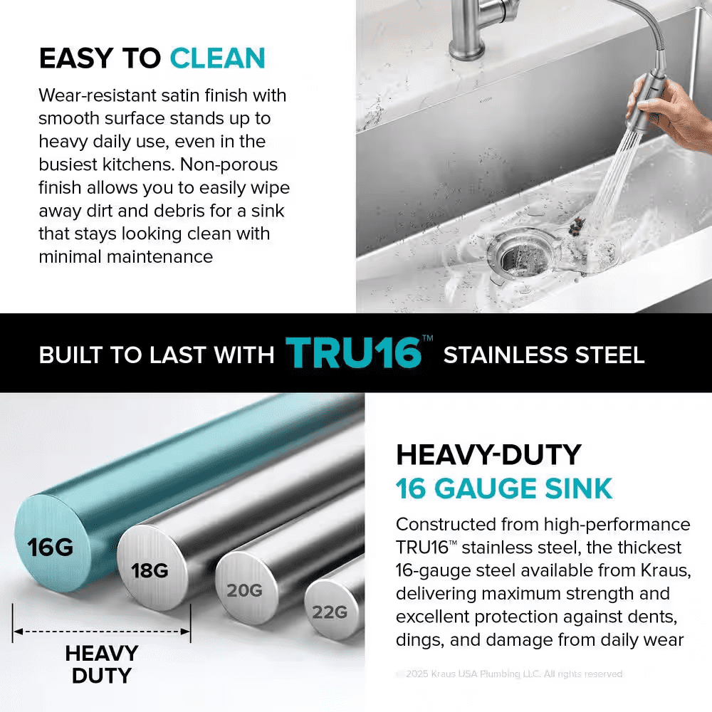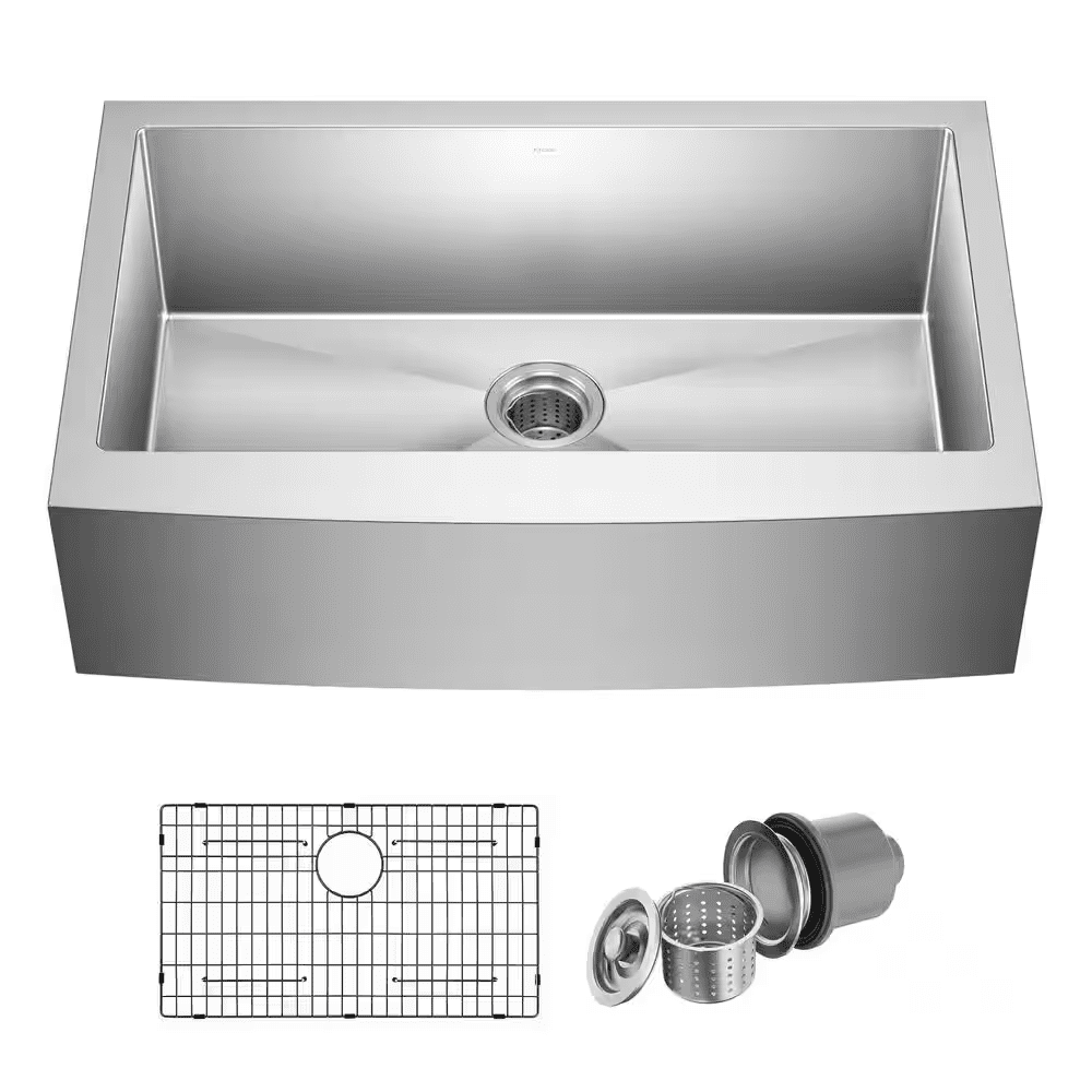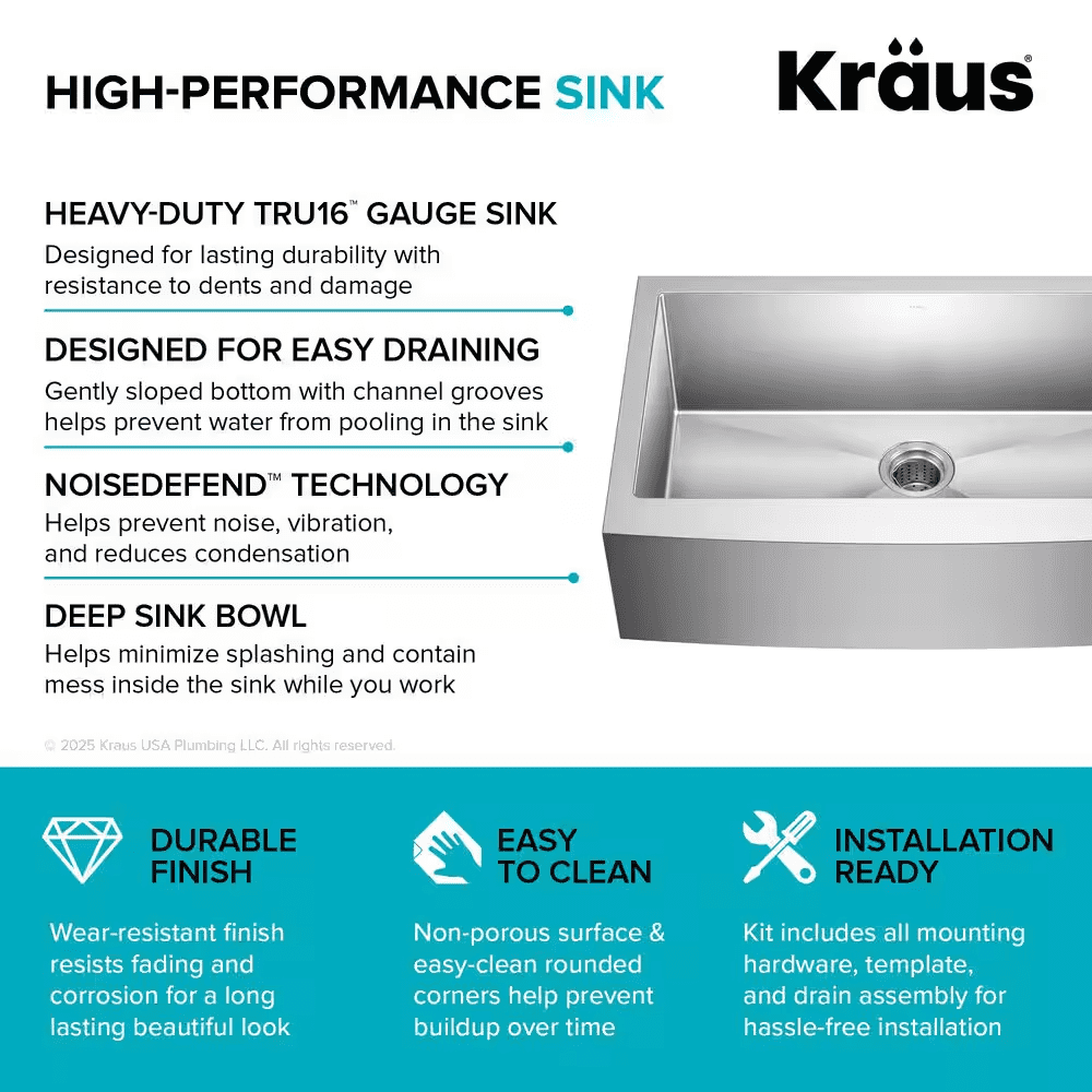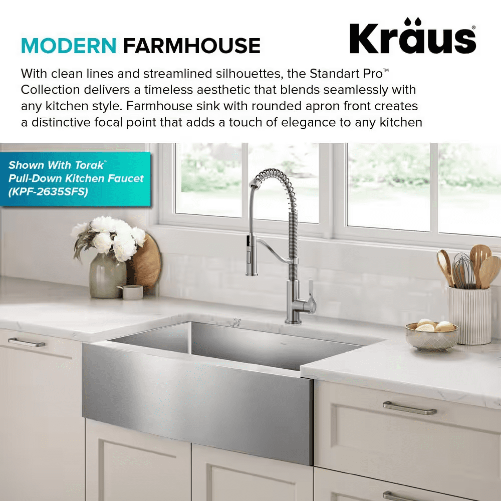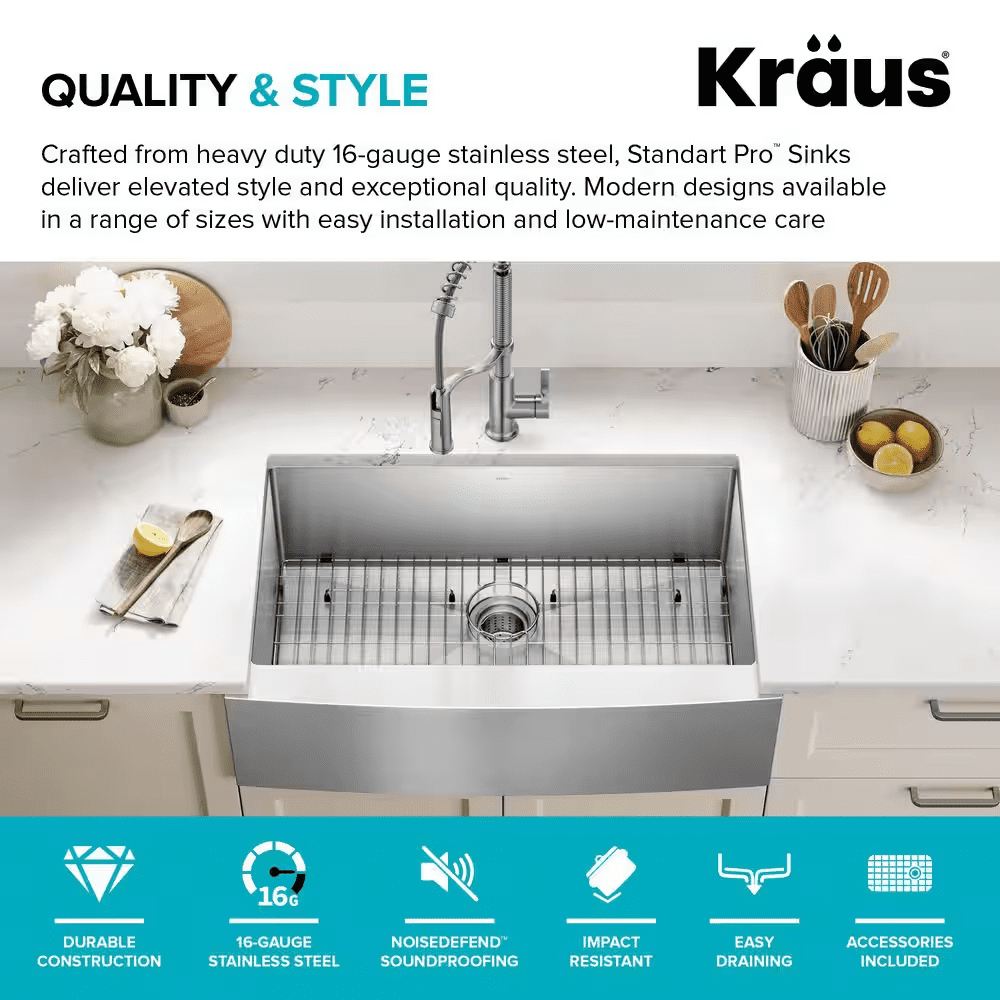 The Standart PRO stainless steel kitchen sink features a modern design with easy-to-clean rounded corners. Heavy-duty TRU16 gauge stainless steel construction offers durability with great resistance to corrosion and damage. The farmhouse sink features a bold apron front design that creates a distinctive focal point in any kitchen. Undermount sink installation creates a clean transition from apron sink to countertop and simplifies cleanup by letting you wipe debris right into the sink. Large NoiseDefend sound dampening pads help absorb noise and vibration. Smooth satin finish and rounded corners make this stainless steel sink easy to keep clean, with channel grooves for easy draining. Comes with bottom grid, drain, template, and mounting hardware for undermount kitchen sink installation.