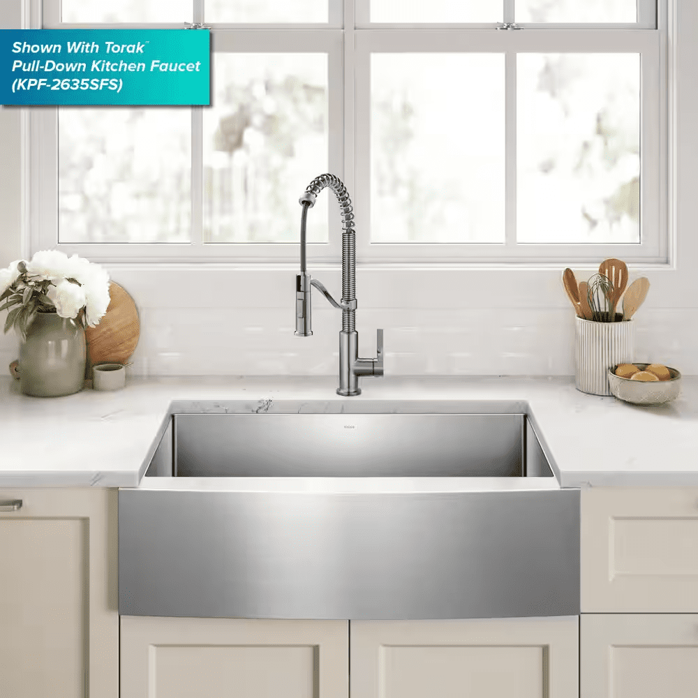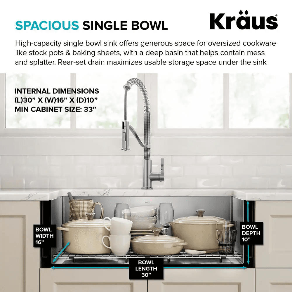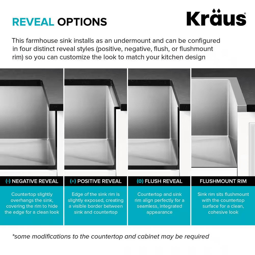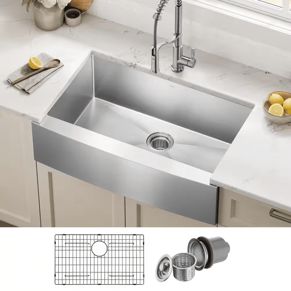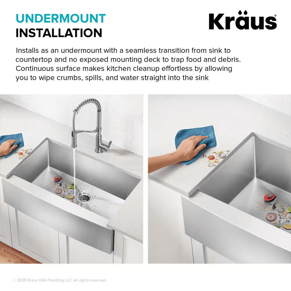 The Standart PRO stainless steel kitchen sink features a modern design with easy-to-clean rounded corners. Heavy-duty TRU16 gauge stainless steel construction offers durability with great resistance to corrosion and damage. The farmhouse sink features a bold apron front design that creates a distinctive focal point in any kitchen. Undermount sink installation creates a clean transition from apron sink to countertop and simplifies cleanup by letting you wipe debris right into the sink. Large NoiseDefend sound dampening pads help absorb noise and vibration. Smooth satin finish and rounded corners make this stainless steel sink easy to keep clean, with channel grooves for easy draining. Comes with bottom grid, drain, template, and mounting hardware for undermount kitchen sink installation.