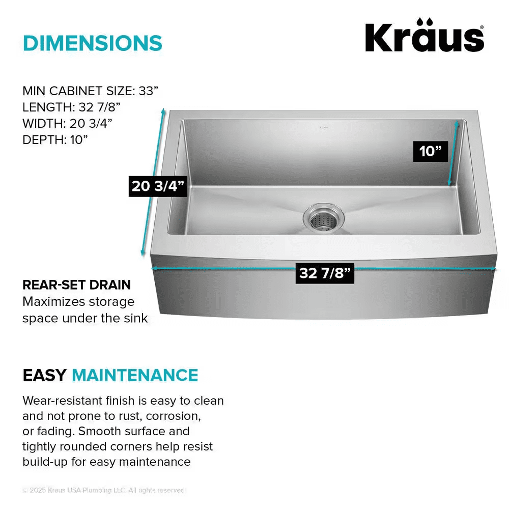 - Kitchen sink: 32.88 in x 20.75 in x 10.5 in, min cabinet 33 in