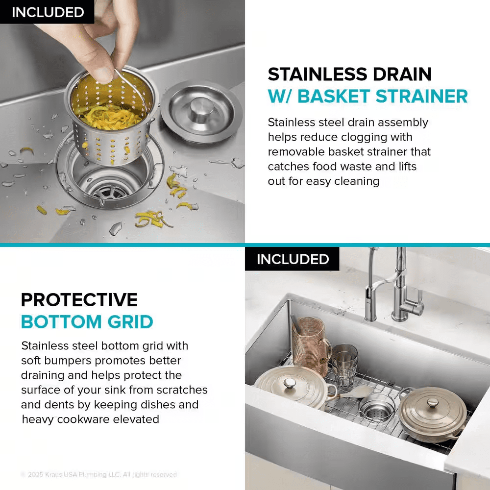 - Heavy-duty 16-gauge stainless steel sink with grid and strainer