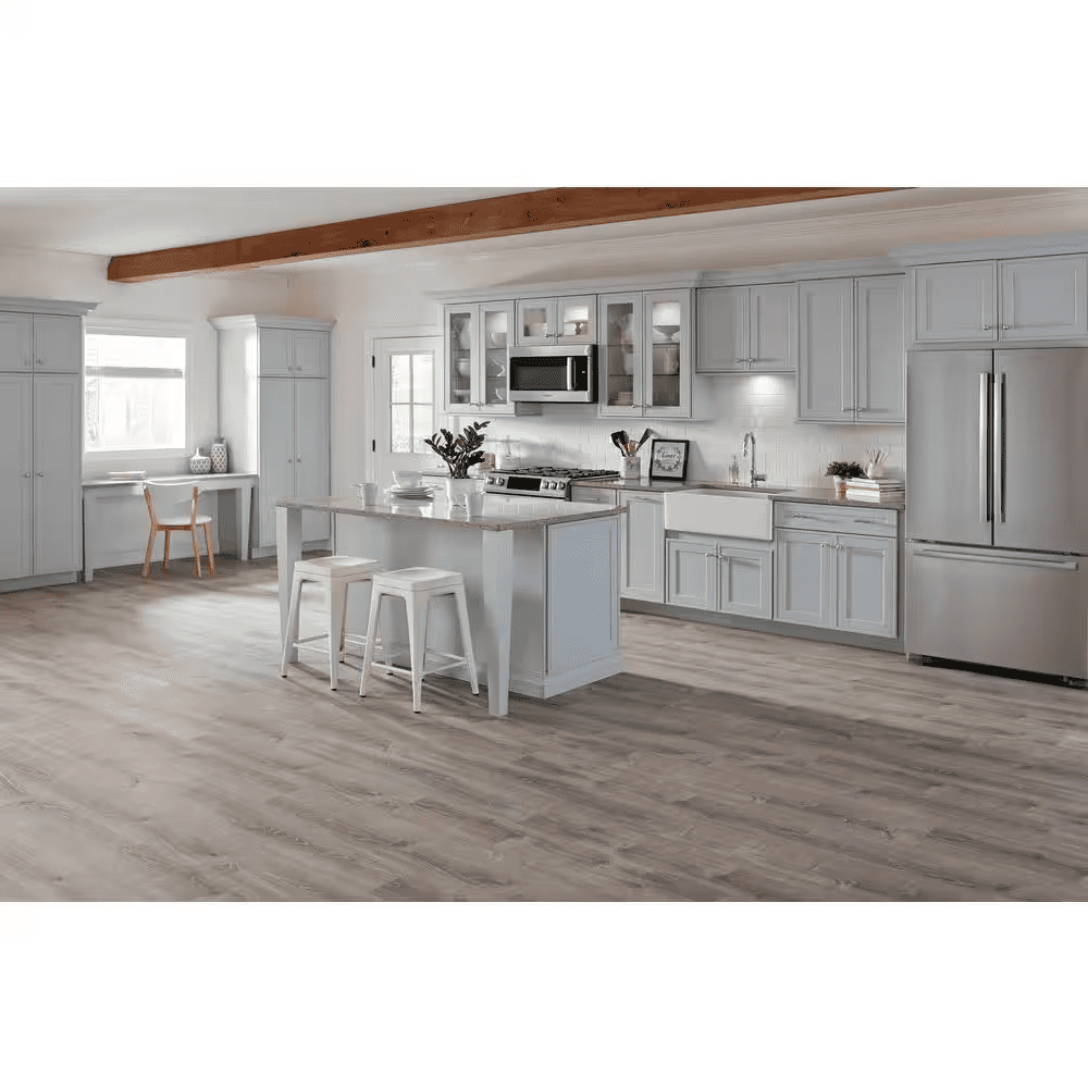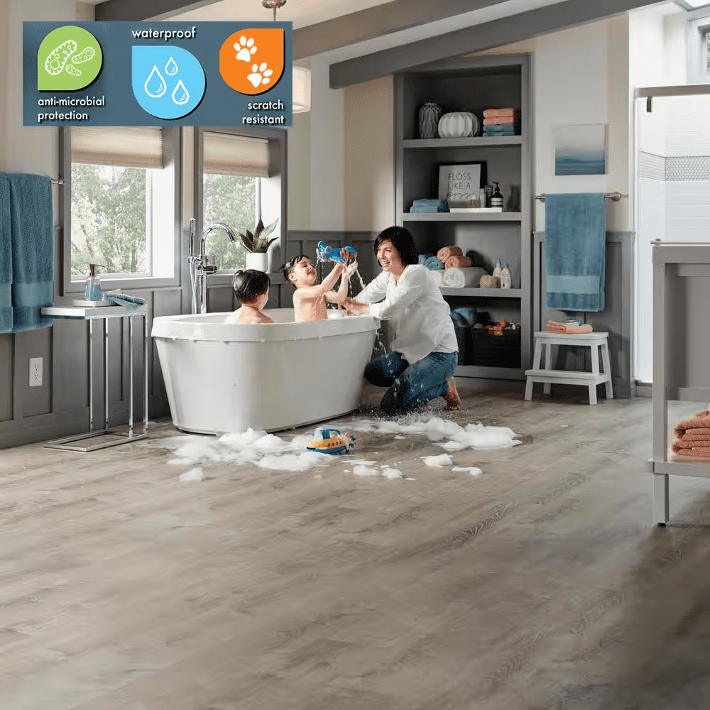 For durability and versatility, add 100% waterproof Lifeproof Rigid Core luxury vinyl flooring to your home. Flooring is the foundation to any home and that’s why we’ve formulated this product with beauty and durability in mind – families with kids and pets will enjoy exceptional flooring performance. Lifeproof is an easy DIY or PRO installation – the pre-attached underlayment is quiet and comfortable underfoot. Install throughout your home in the bathroom, kitchen, basement and living areas – simply drop, lock, and tap into place and the room is done. Worried about wear and tear? The surface of Lifeproof flooring is coated with ultimate scratch and stain resistance. This flooring has an Ultra-Fresh treatment on the flooring surface to inhibit the growth of mold and mildew that causes odor and stains. Lifeproof flooring is embossed to look and feel like authentic hardwood, without all of the typical maintenance concerns. Cleaning your floor has never been easier – just sweep, vacuum, or damp mop with a pH neutral cleaner. Lifeproof is FloorScore Certified, phthalate and formaldehyde free; giving you confidence you made the right flooring choice for your family! Backed by a Lifetime Residential Warranty. 100% Lifeproof, 0% worries.