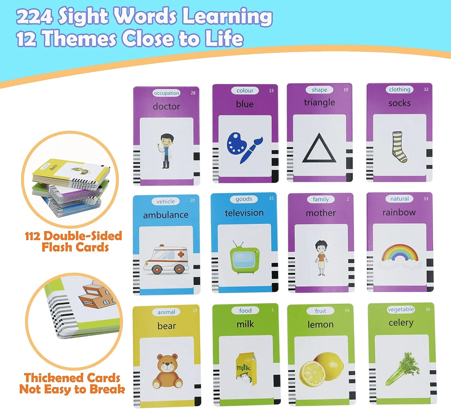 【224 Sight Word Flash Cards】Talking flash cards for toddlers are double-sided reading in 224 words ranging from animals, vehicles, people, and food. The autism sensory toys have well-presented images, clear pronunciation, and funny simulation sounds along with easy-to-read text, greatly arousing kids’ learning interests and sparking the imagination.