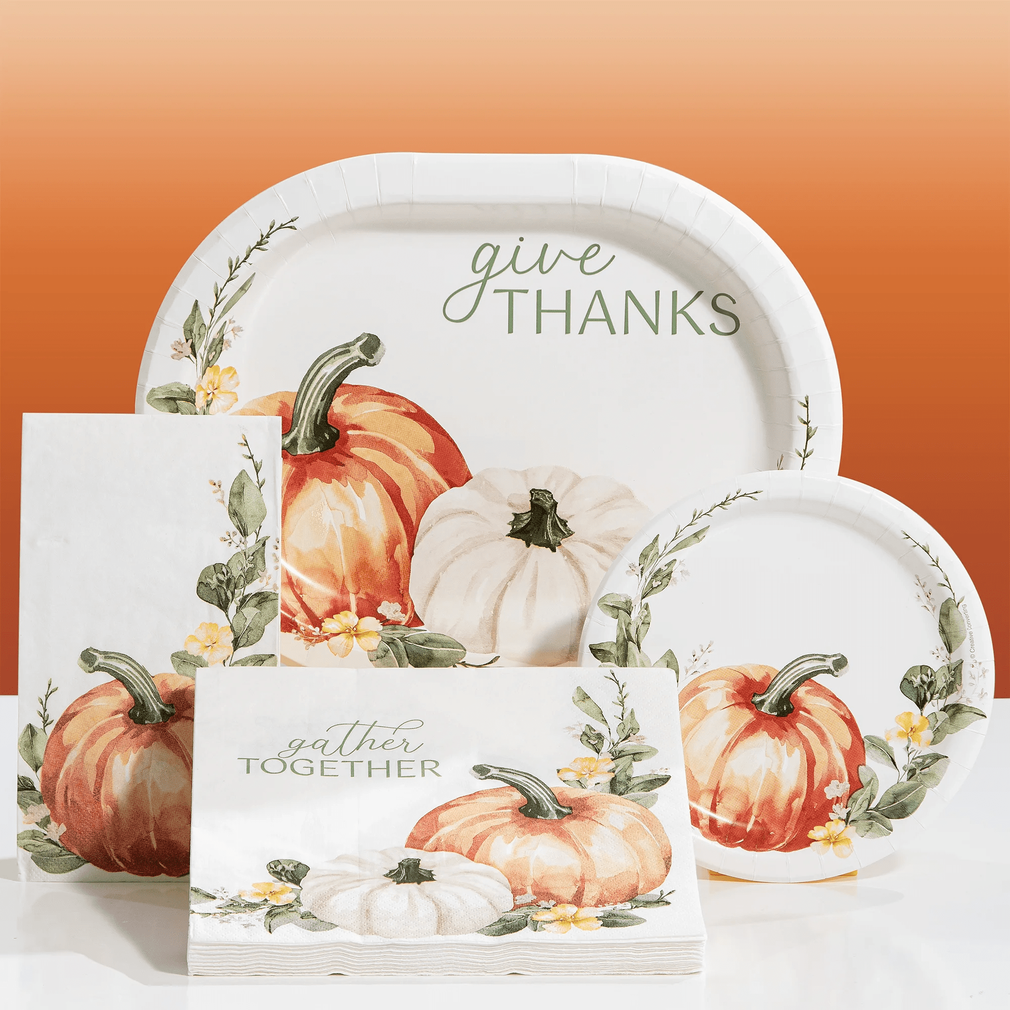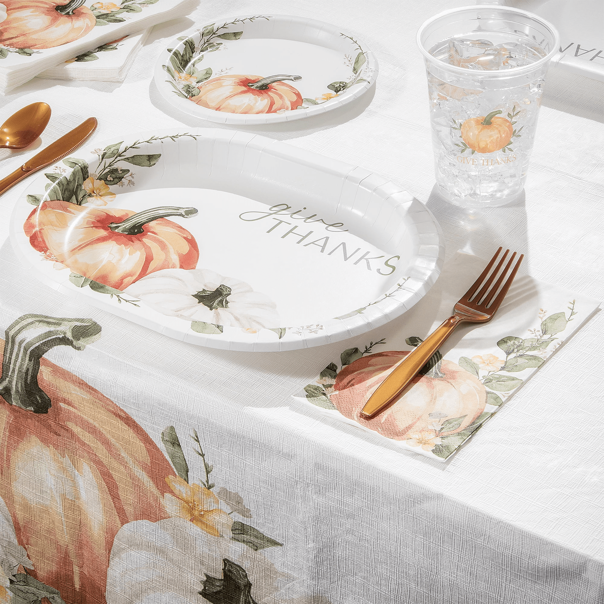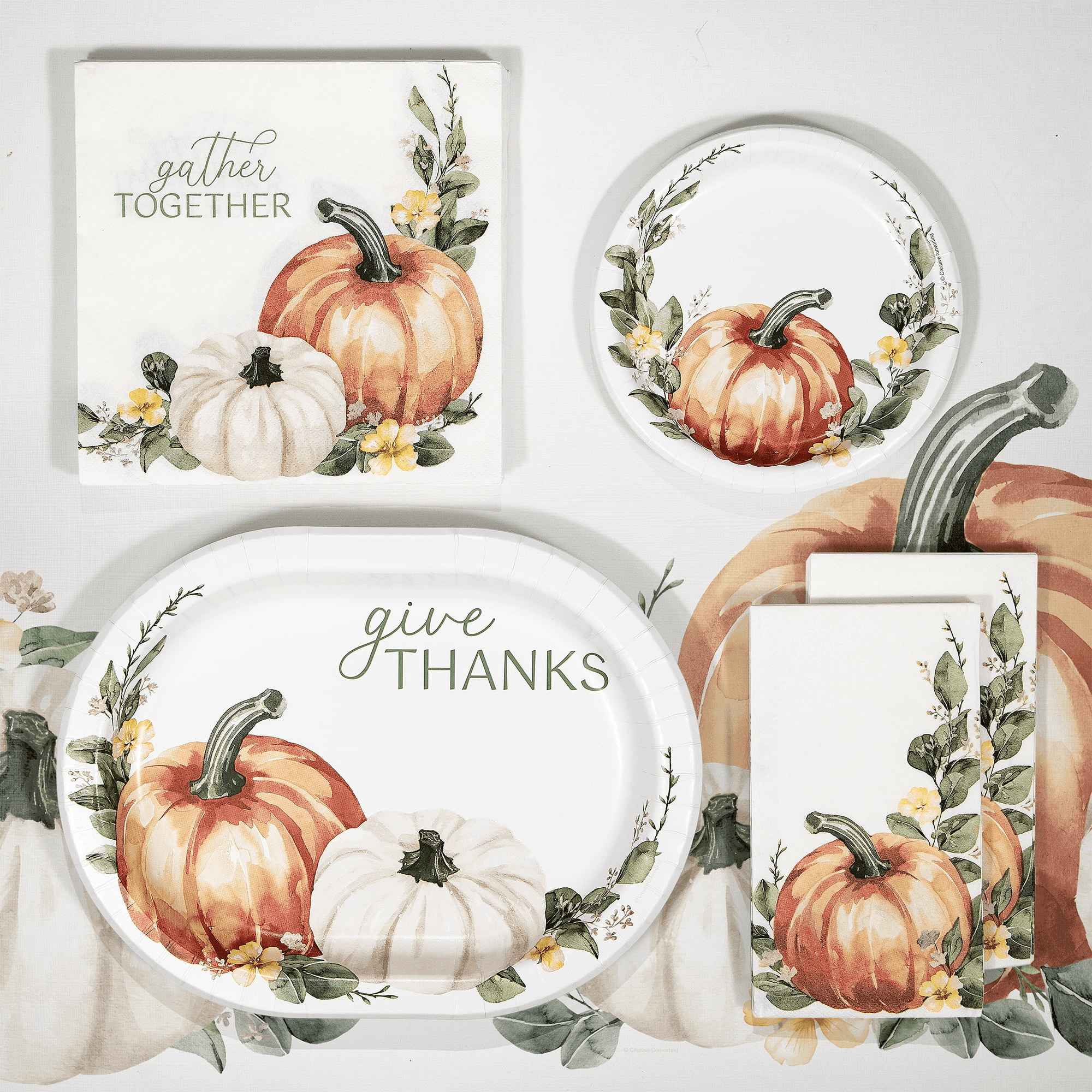 - Beautiful fall design features two pumpkins, fall greenery, and the message “Give Thanks” for a festive Thanksgiving look