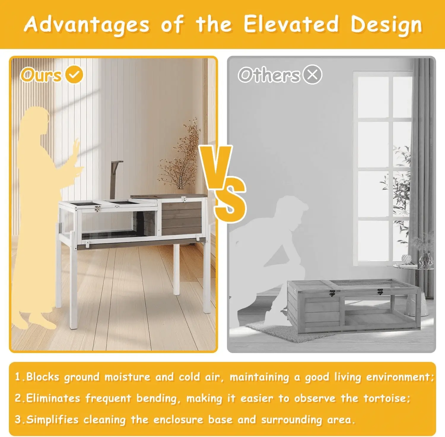 - 【Two-Room Tortoise Habitat】Create a comfortable home for your tortoise with our spacious habitat featuring a unique two-room design. Your pet will appreciate the Resting Area and a Visualize Play Area. Size: 37.2”W x 22.8”D x 46.8”H.