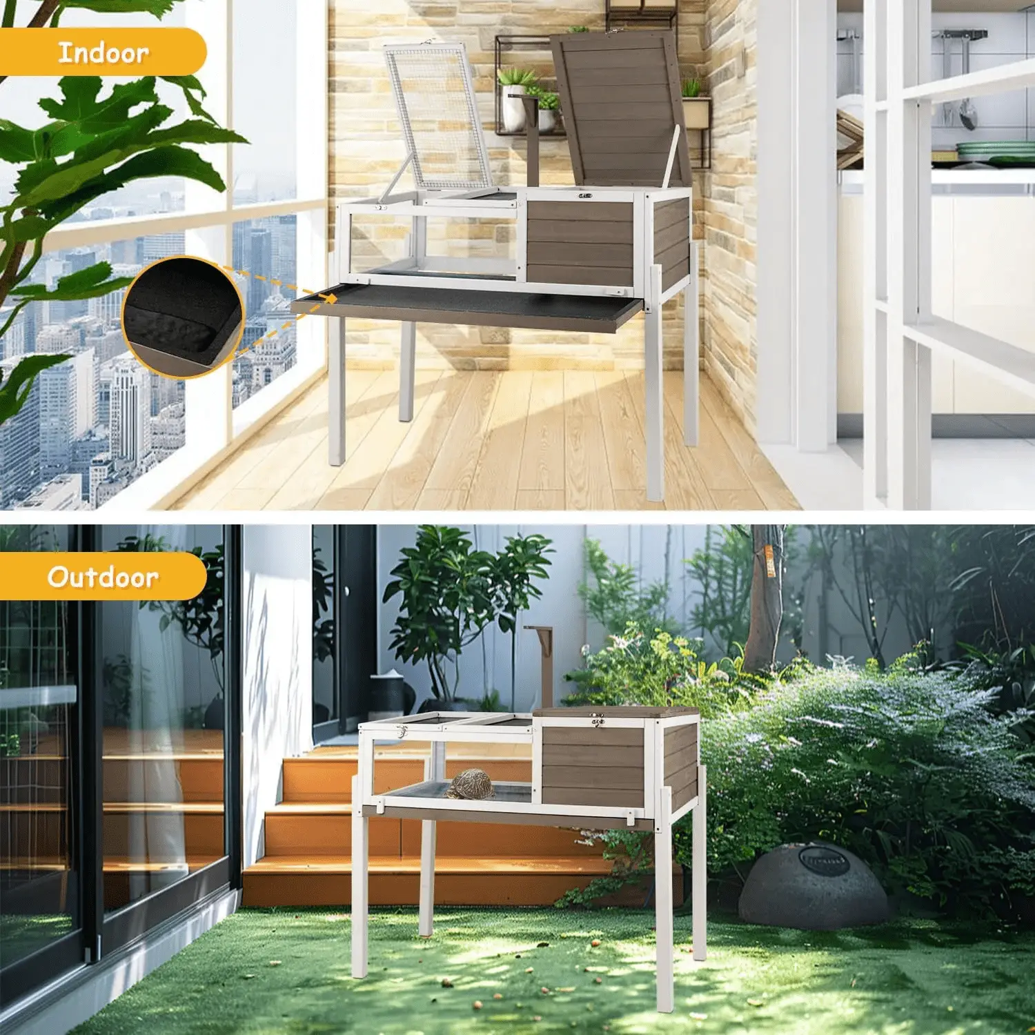 Check out the Petscosset Tortoise Habitat! It’s a versatile living space designed for small animals like tortoises. Made from natural fir wood, it features a spacious two-room design providing ample space for your pet. The detachable legs can be adjusted or removed based on your preferences and needs. This tortoise house is equipped with a durable, weather-resistant hide box for outdoor use and a cozy hide for indoor comfort. The solid construction includes a leak-proof pull-out tray for easy cleaning and maintenance. It offers a secure and comfortable environment for your pet.