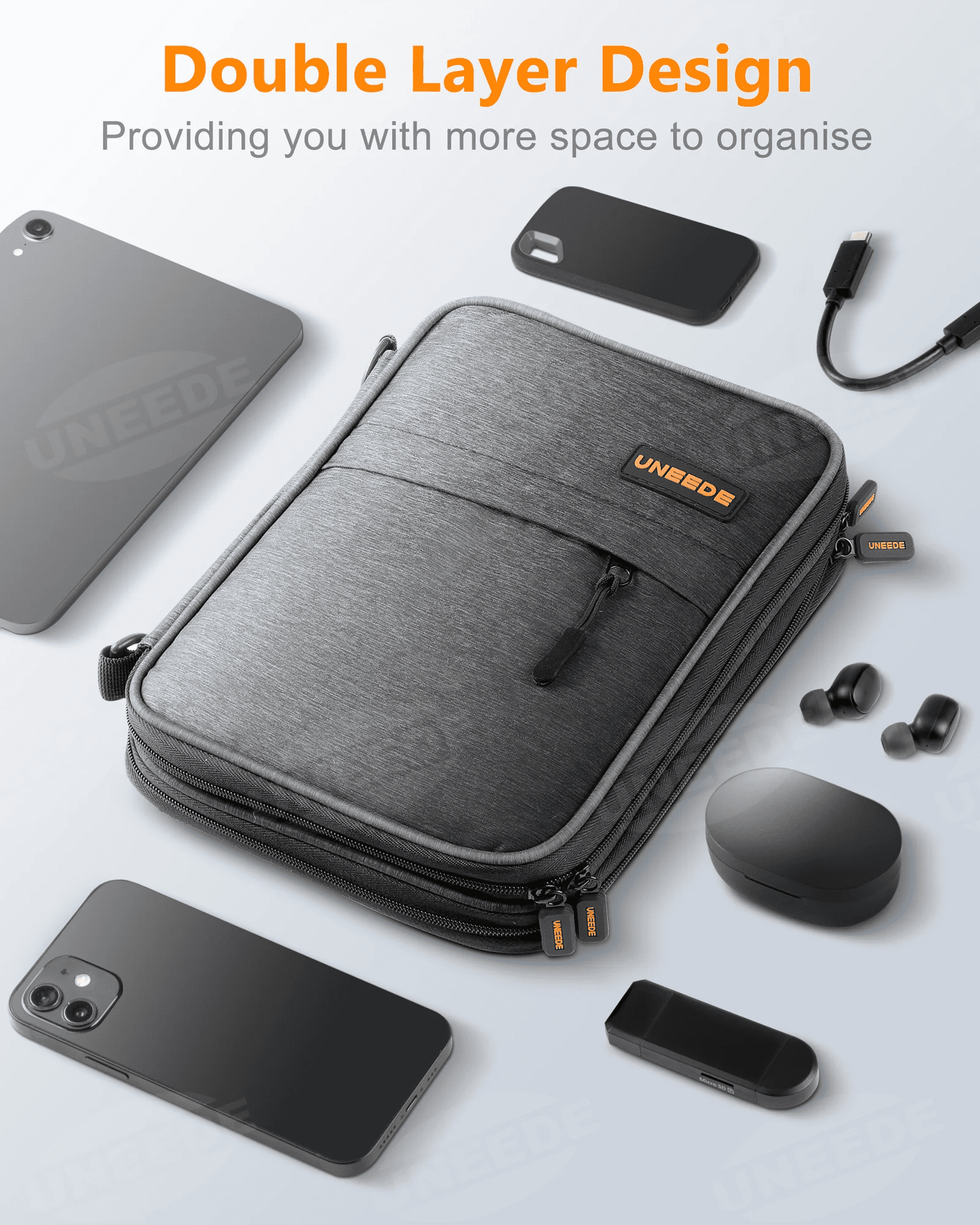 The UNEEDE Travel Accessories Large Capacity Cable Organiser Bag offers smart and multi-functional storage for all your electronic essentials. Its double-layer design provides ample space with intelligent separation for charger cables, power banks, USB sticks, SD cards, and even tablets. Measuring 25cm by 19.5cm, this compact organizer fits perfectly into backpacks and suitcases, making it ideal for travel or daily use. Constructed from wear-resistant materials with fine sewing and a smooth, durable double-ended zipper, it ensures long-lasting quality. The bag also features convenient, hidden pockets for quick access to frequently used items, helping you stay well-organized whether at home, work, or on the go.