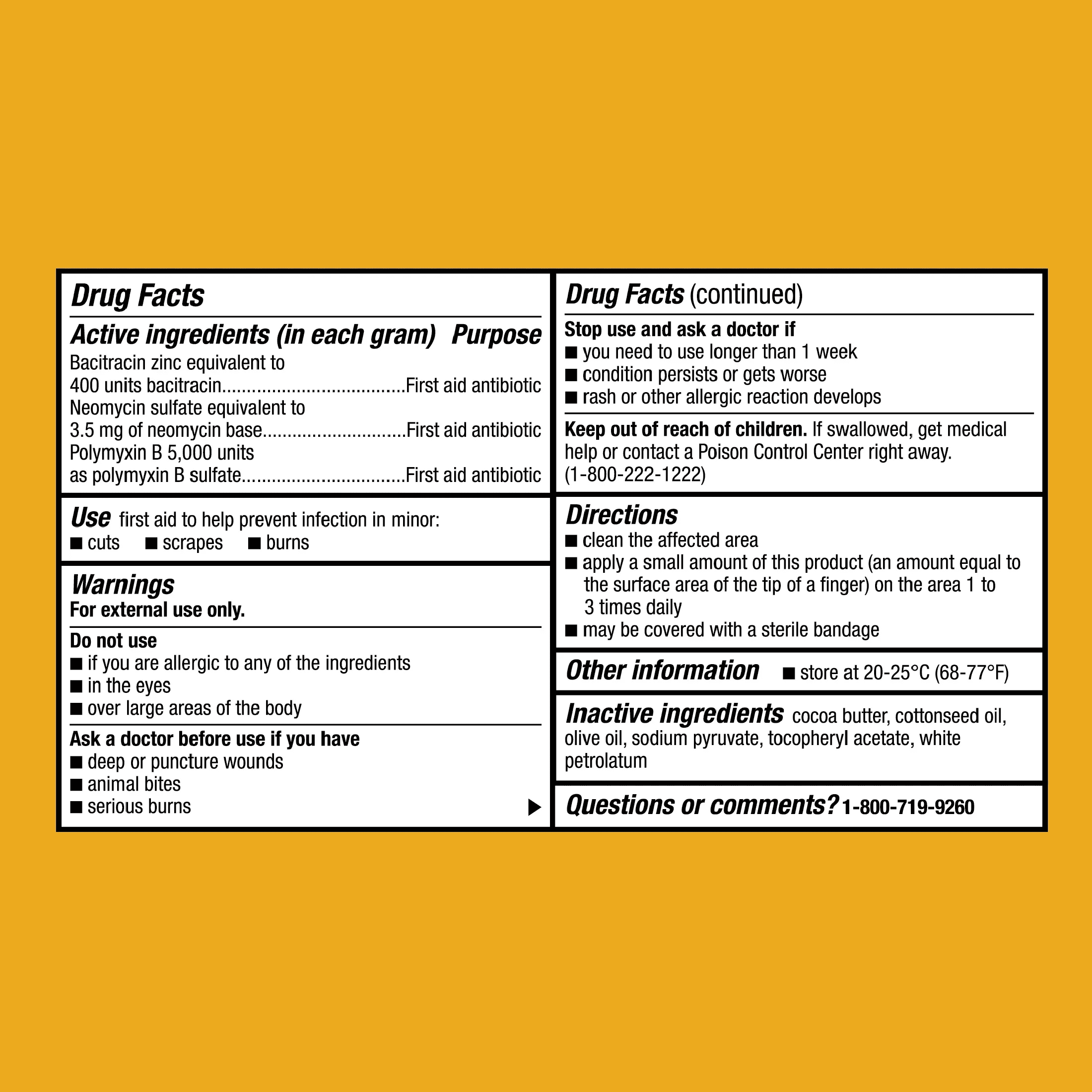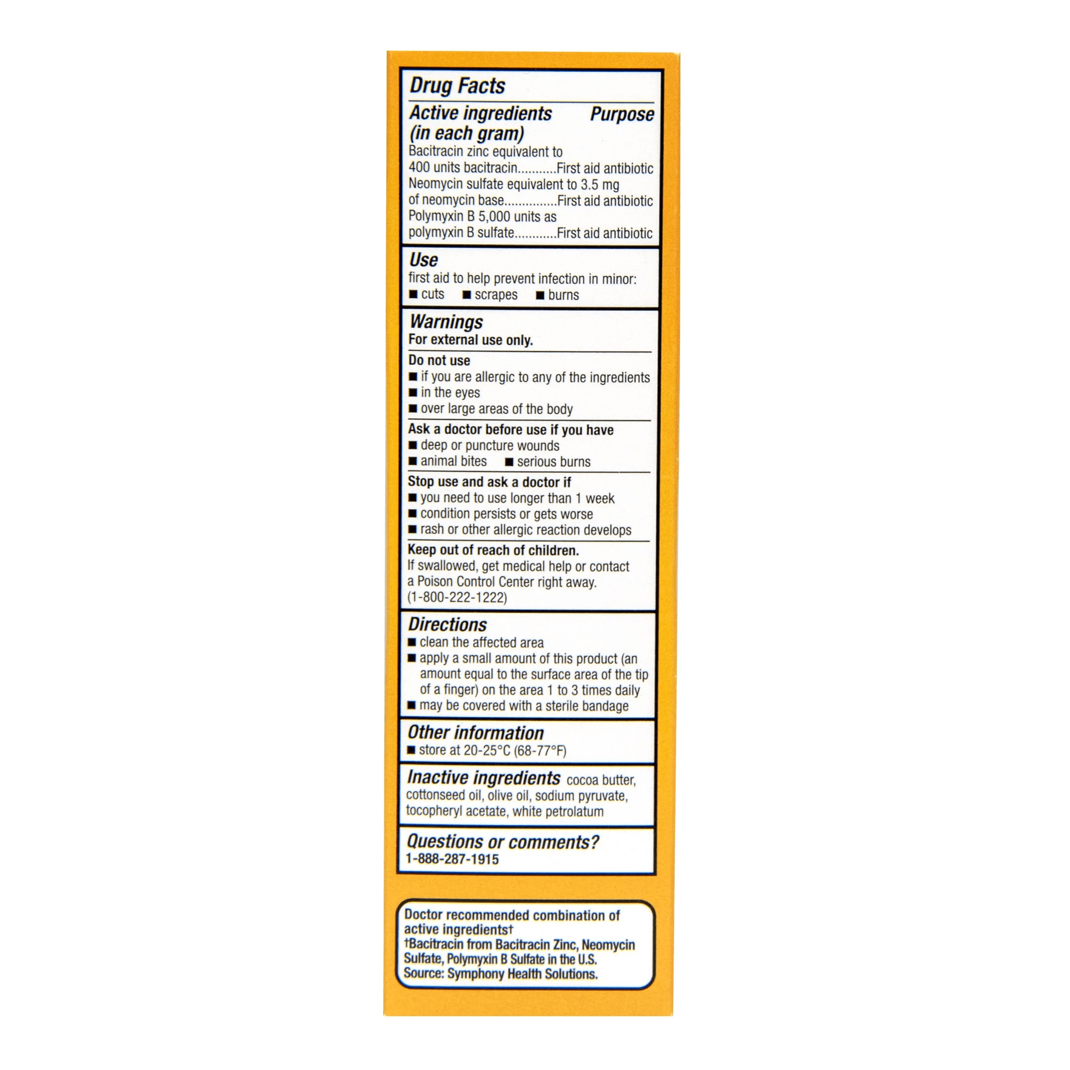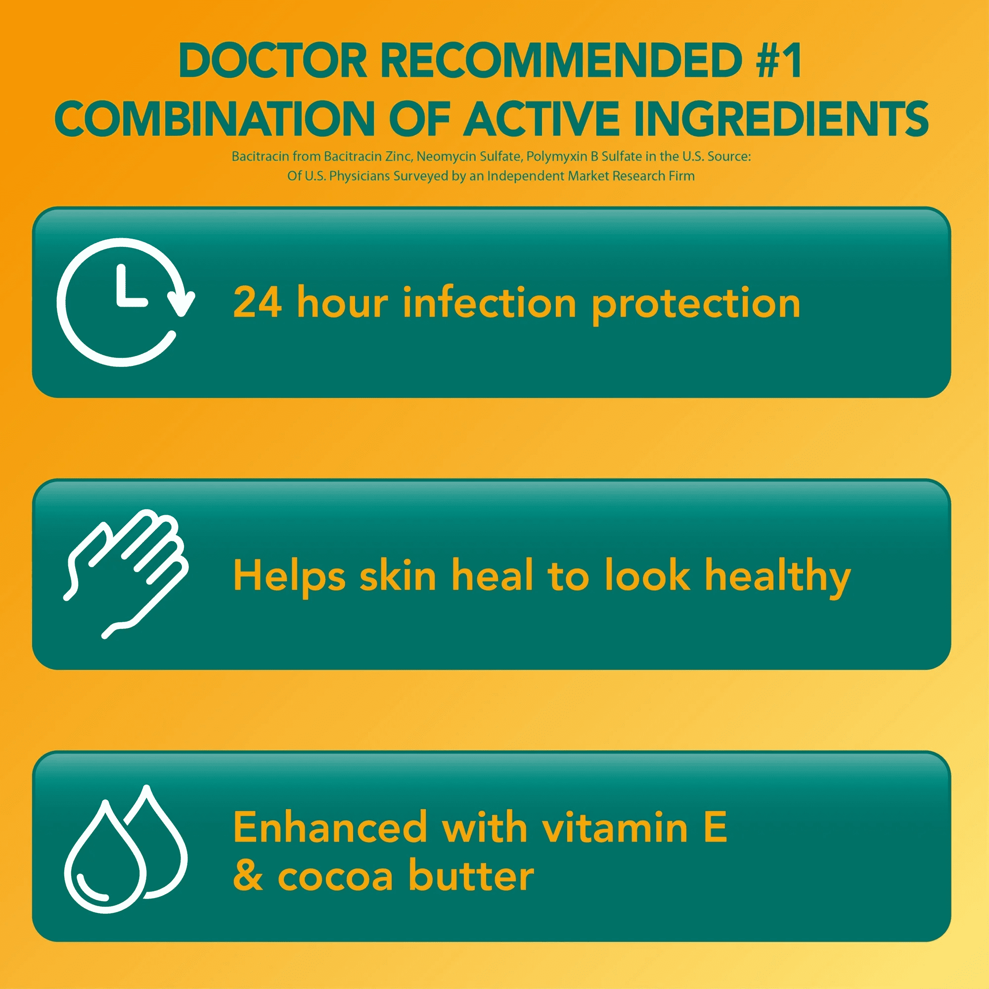 Compare to Neosporin active ingredients. Equate First Aid Triple Antibiotic Ointment provides long-lasting, 24-hour infection protection for minor cuts, scrapes and burns. This original strength ointment helps skin heal, resulting in healthy looking skin. Contains bacitracin zinc, neomycin sulfate and polymyxin B sulfate – the number one doctor recommended combination of active ingredients in the U.S. (of U.S. physicians surveyed by an independent market research firm). Enhanced with vitamin E and cocoa butter, this first aid ointment can be applied one to three times per day and used with a clean bandage. Cuts, burns and scrapes need long lasting protection against infection. Trust first aid antibiotic ointment to care for your minor wounds.